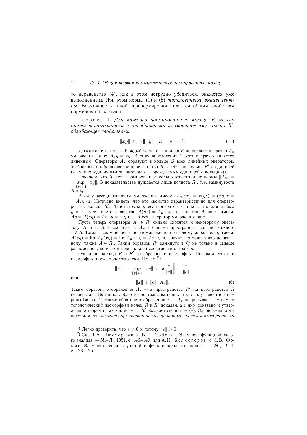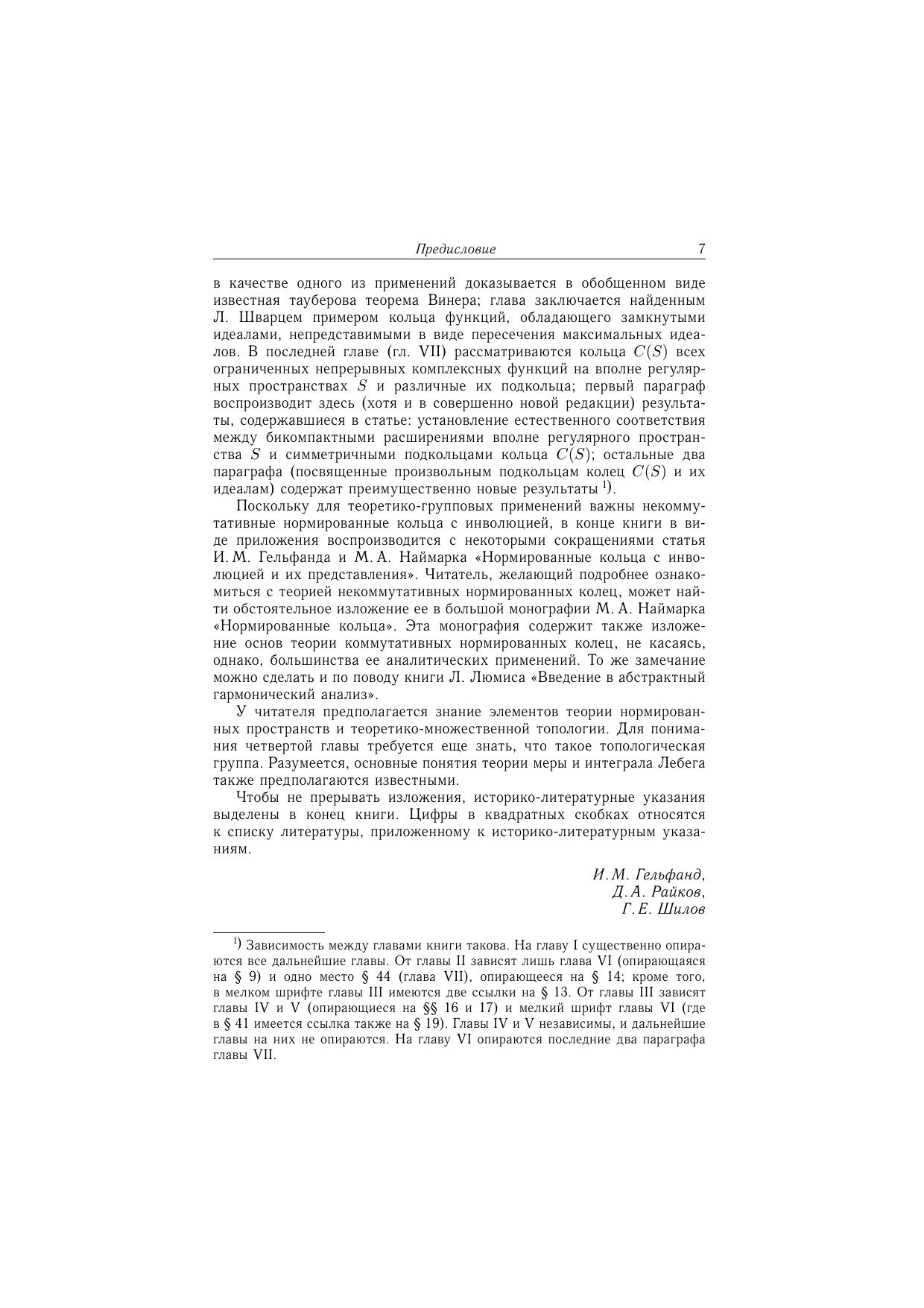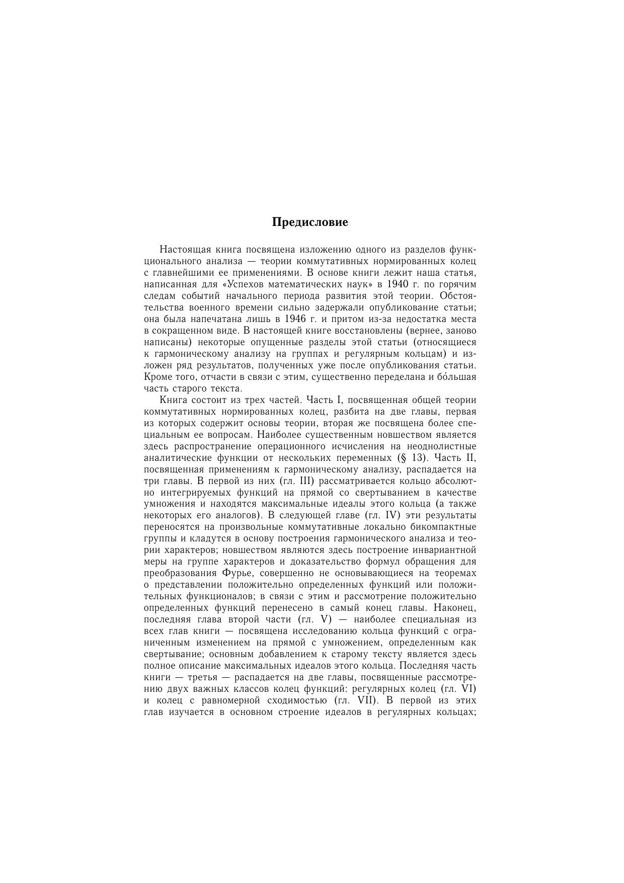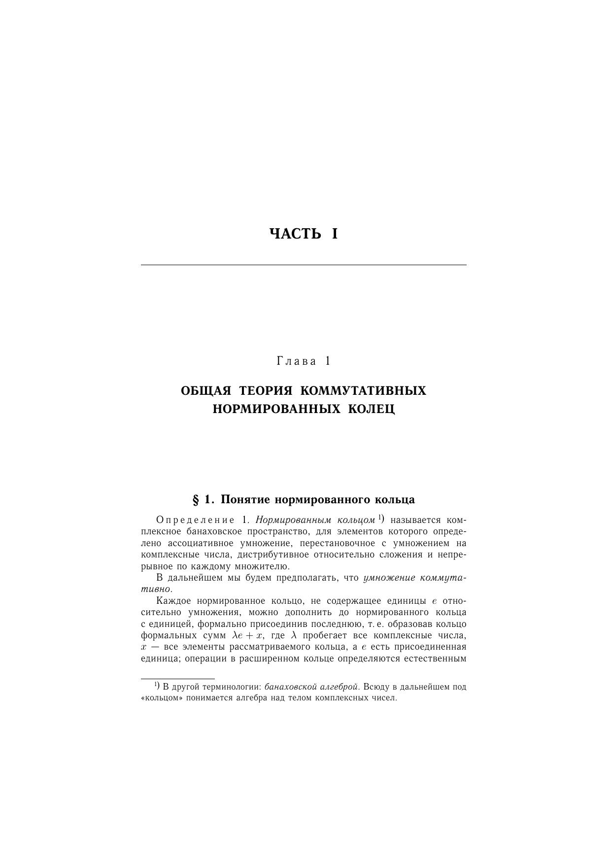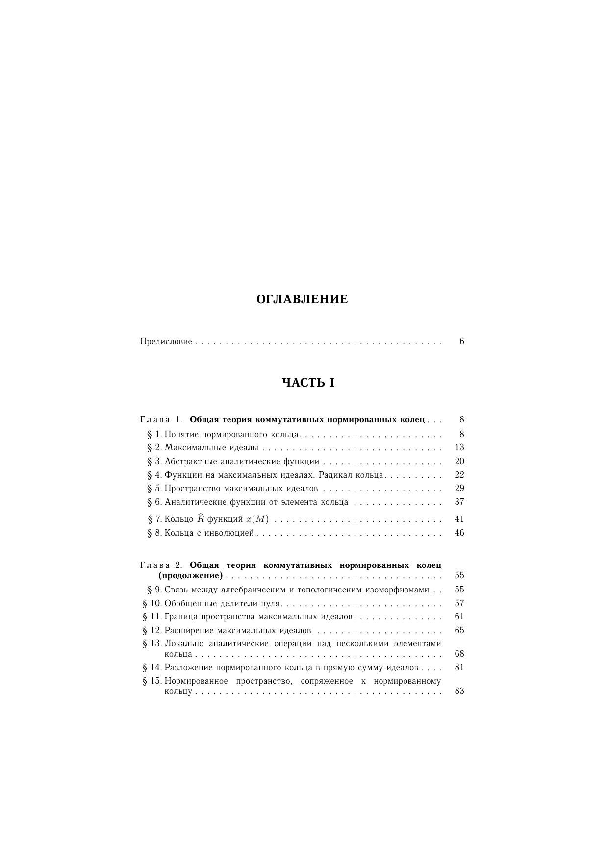 В предлагаемой книге излагается теория коммутативных нормированных колец с ее применениями к анализу и топологии. В конце книги в виде приложения воспроизведена статья И.М. Гельфанда и М.А. Наймарка <Нормированные кольца с инволюцией и их представления>, могущая служить введением в теорию некоммутативных нормированных колец с инволюцией. Книга рассчитана на математиков (студентов старших курсов, аспирантов и научных работников), занимающихся функциональным анализом и его приложениями.