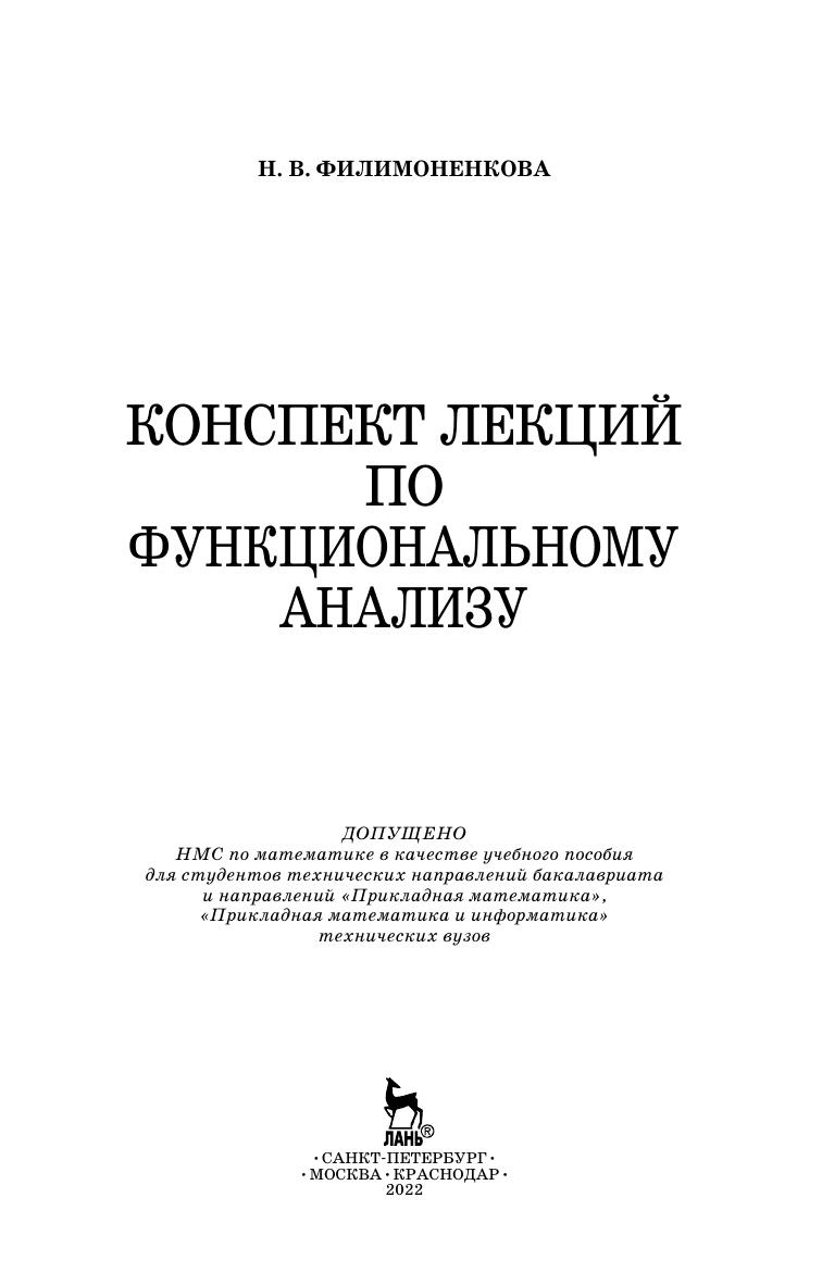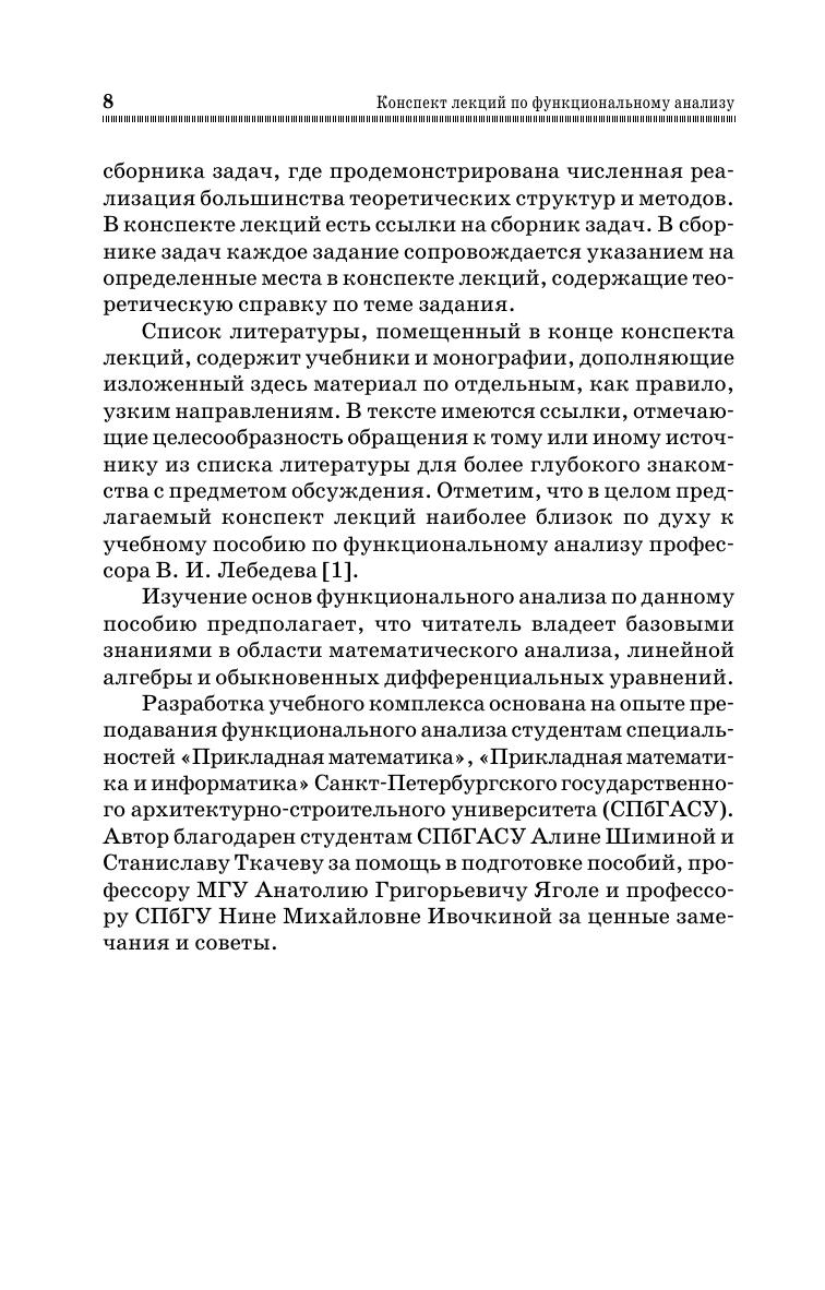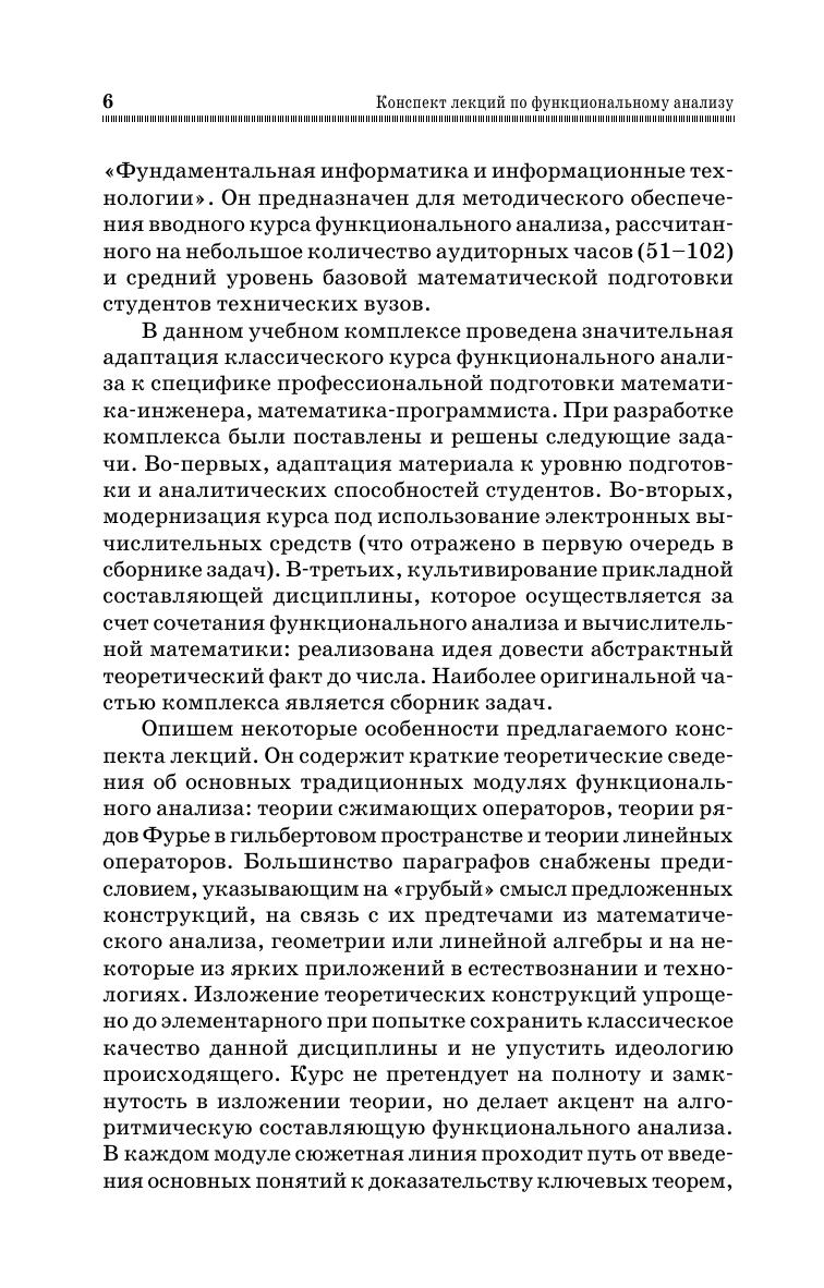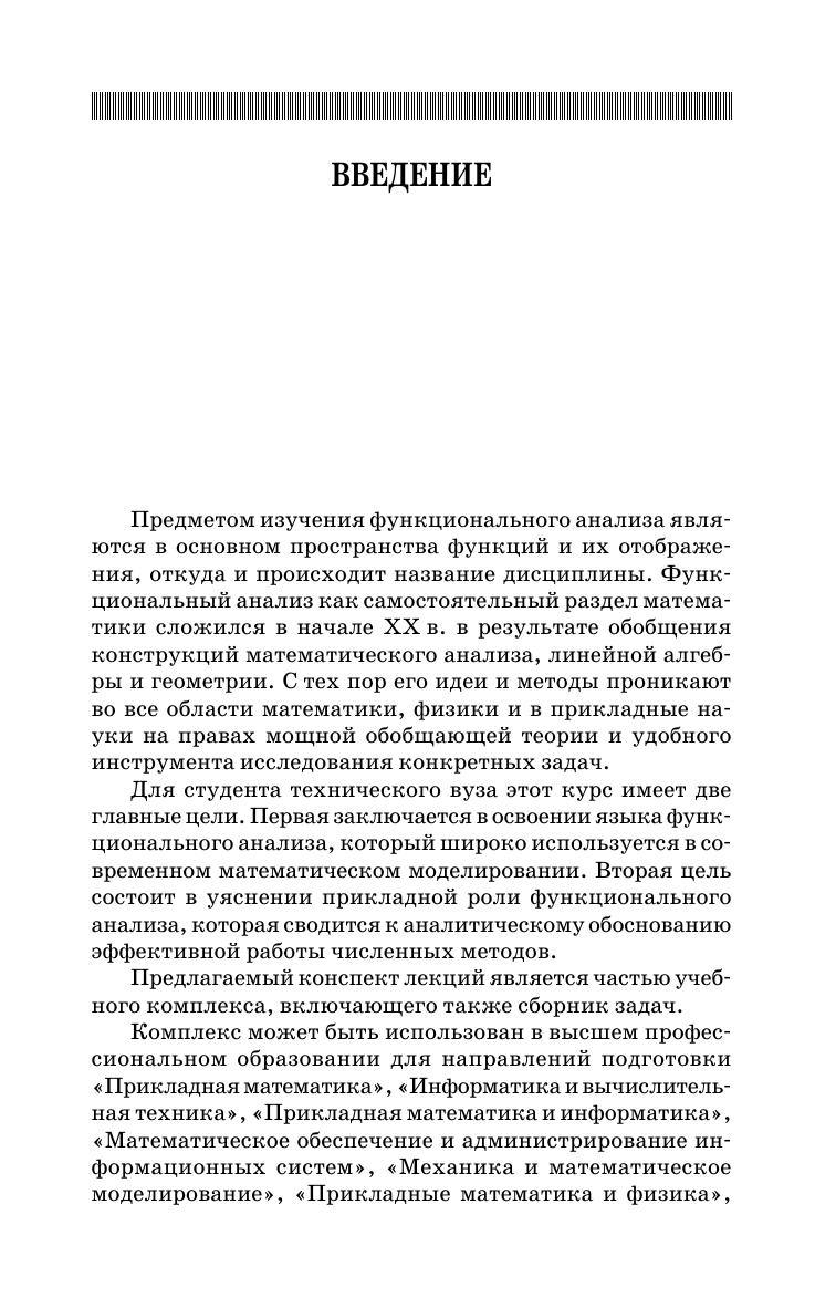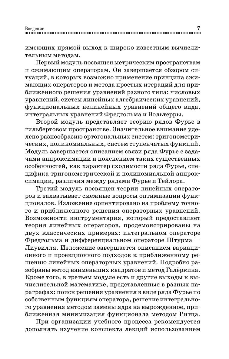 Пособие содержит краткие теоретические сведения об основных модулях функционального анализа: теории сжимающих операторов, теории рядов Фурье в гильбертовом пространстве и теории линейных операторов. В центре внимания приложение теории к известным вычислительным методам: решение уравнений разного типа методом простых итераций, аппроксимация функций с различными ортогональными базисами, минимизация функционала методом Ритца, решение линейных операторных уравнений дифференциального и интегрального типа приближенными методами, в частности методом Галёркина. Конспект лекций предназначен студентам технических вузов для изучения вводного курса в функциональный анализ. Изложение материала учитывает специфику подготовки студентов в техническом вузе и имеет прикладную ориентацию. Данное пособие рекомендуется использовать в сочетании со сборником задач по функциональному анализу того же автора.