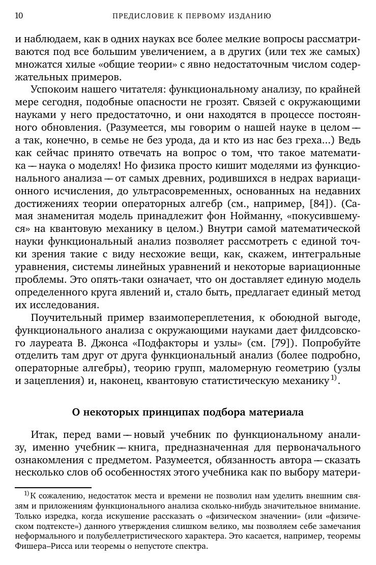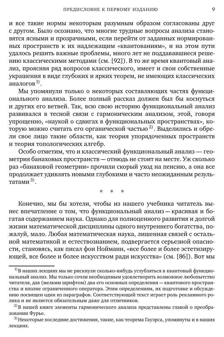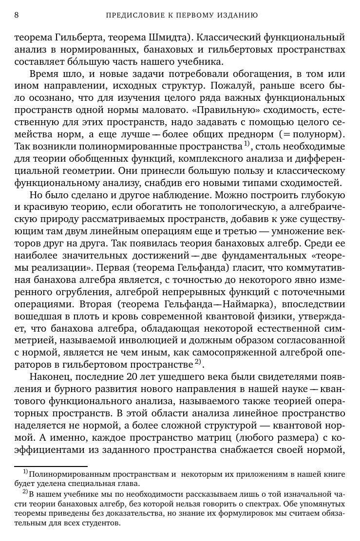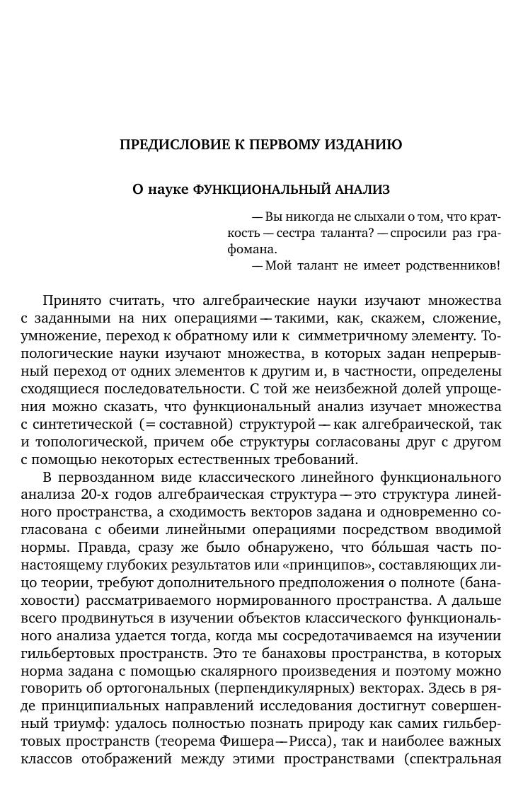Книга представляетсобойуниверситетскийучебник пофункциональному анализу. Она рассчитана на студентов 3–5 курсов, аспирантов и преподавателей математических факультетов, а также специализирующихся в области математики и теоретическойфизики научных работников. В ее основуположены лекции, многократно читавшиесяавтором на механико-математическом факультете МГУ, и семинарские занятия, которые регулярно проводились им в академических группах этого факультета. Вводимые понятия и доказываемые утверждения общего характера иллюстрируются большим числом примеров и упражнений (задач). От читателя требуется подготовка в объеме двух первых курсов математических факультетов российских университетов.