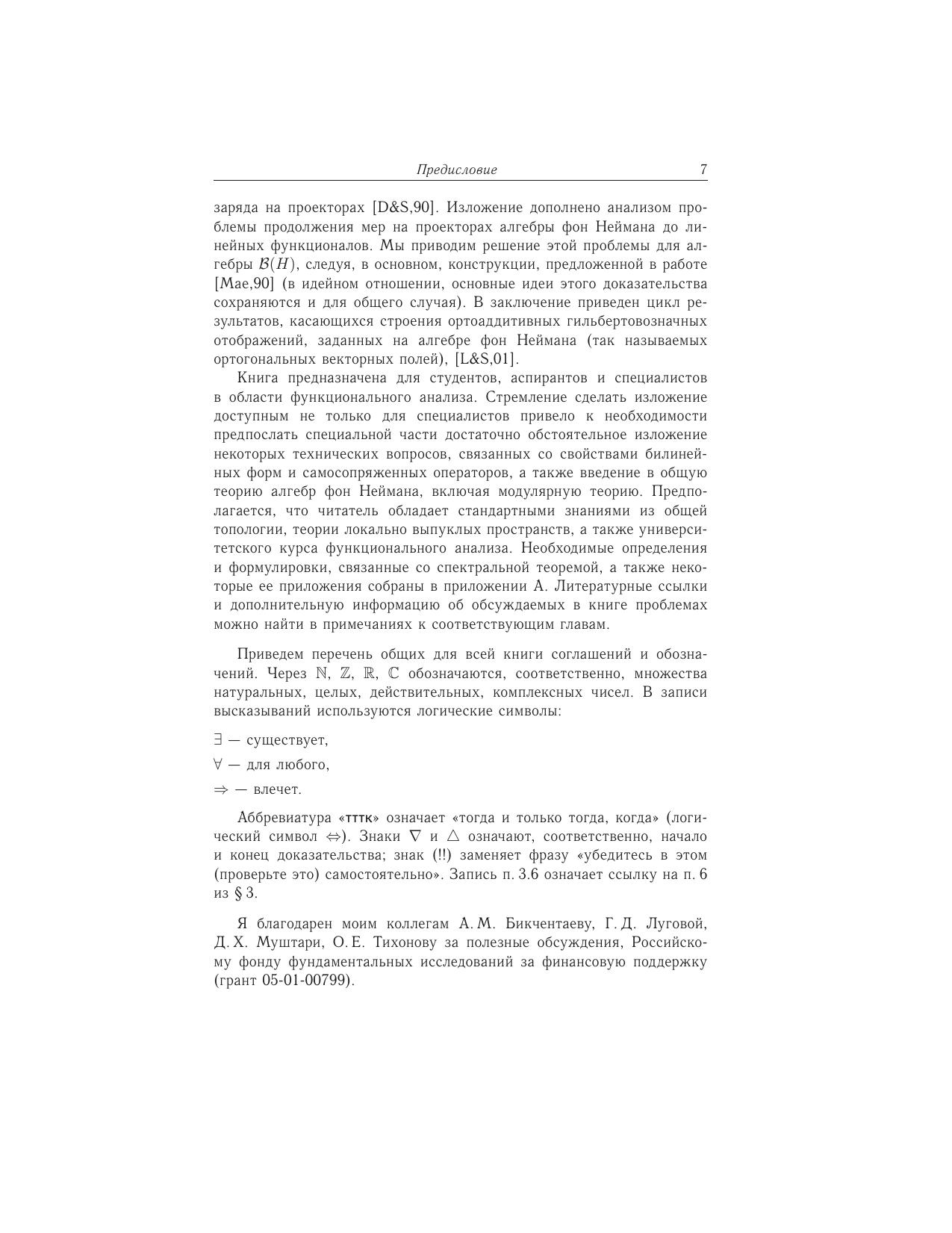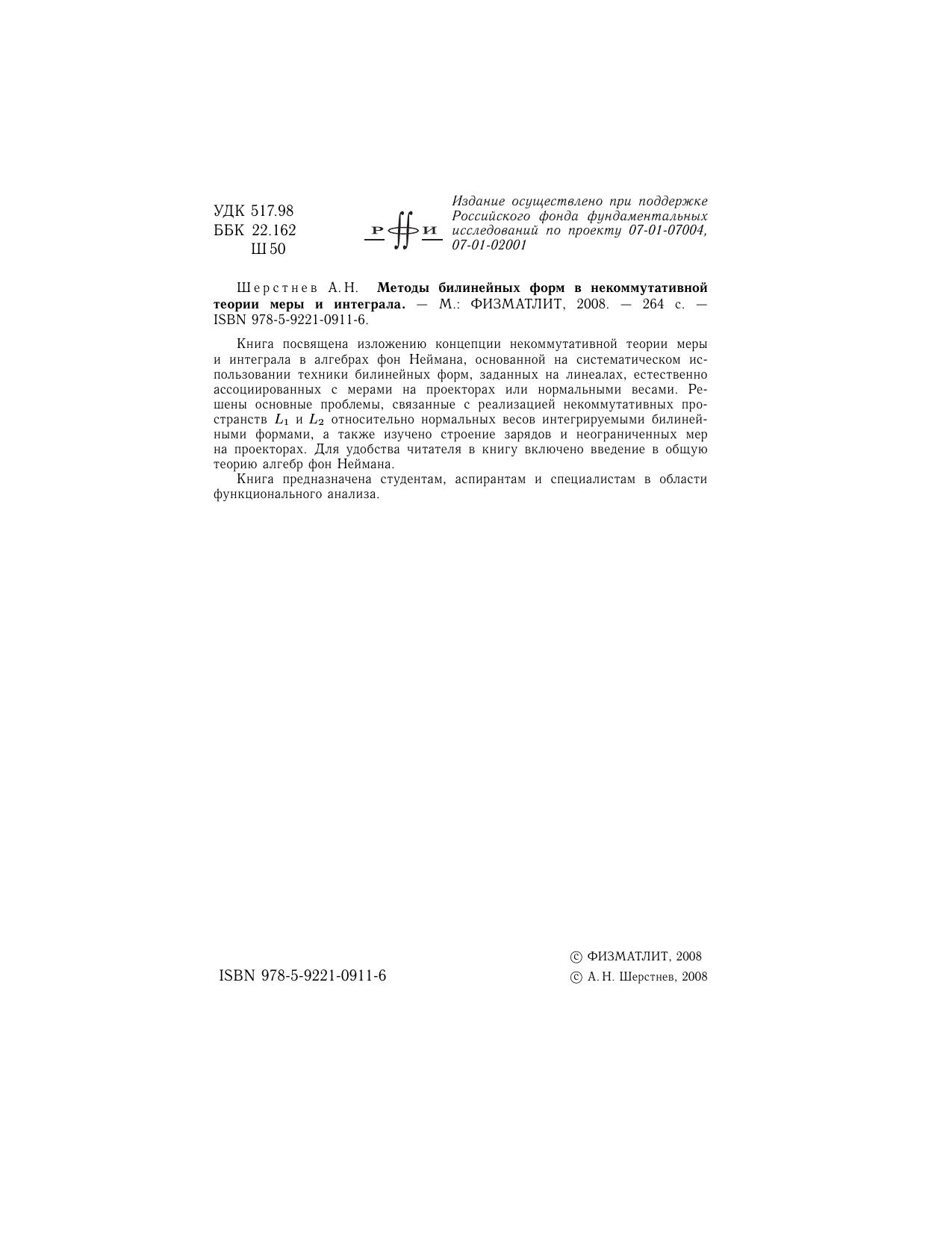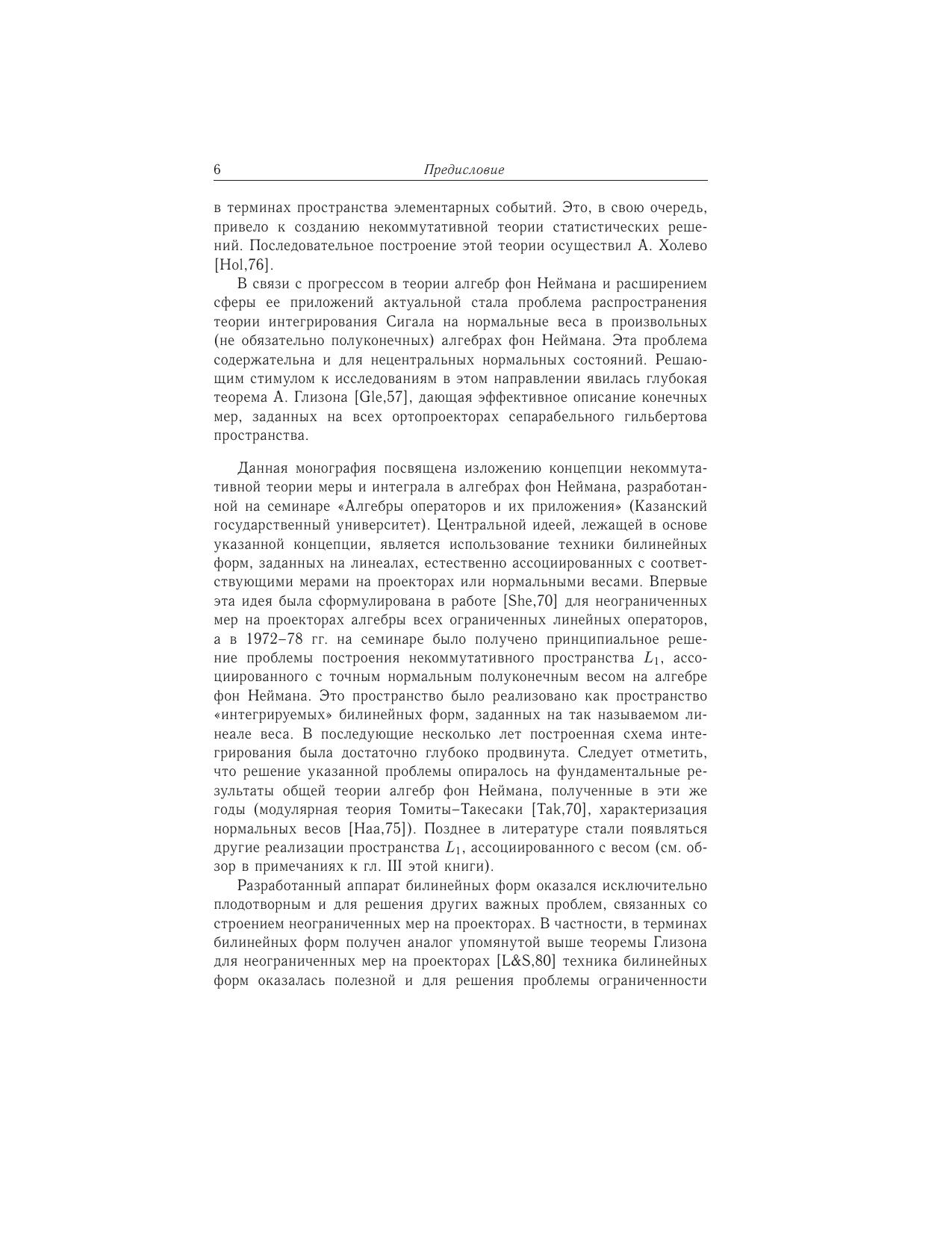 Книга посвящена изложению концепции некоммутативной теории меры и интеграла в алгебрах фон Неймана, основаной на систематическом использовании техники билинейных форм, заданных на линеалах, естественно ассоциированных с мерами на проекторах или нормальными весами. Решены основные проблемы, связанные с реализацией некоммутативных пространств L_1 и L_2 относительно нормальных весов интегрируемыми билинейными формами, а также изучить строение зарядов и неограниченных мер на проекторах. Для удобства читателя в книгу включено введение в общую теорию алгебр фон Неймана. Книга предназначена студентам, аспирантам и специалистам в области функционального анализа.