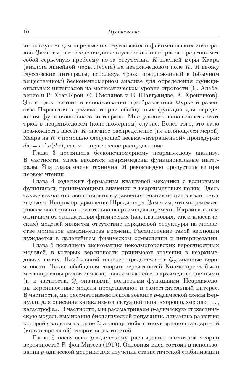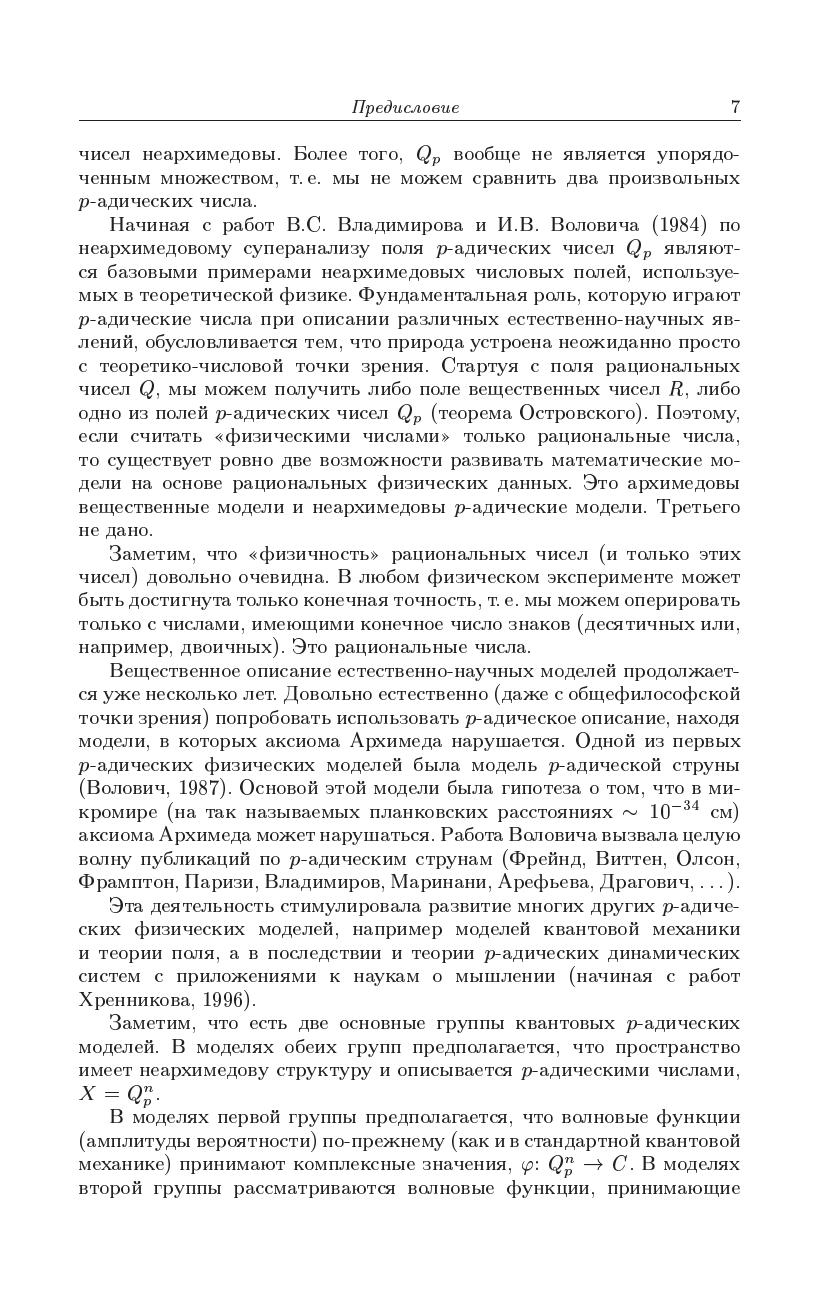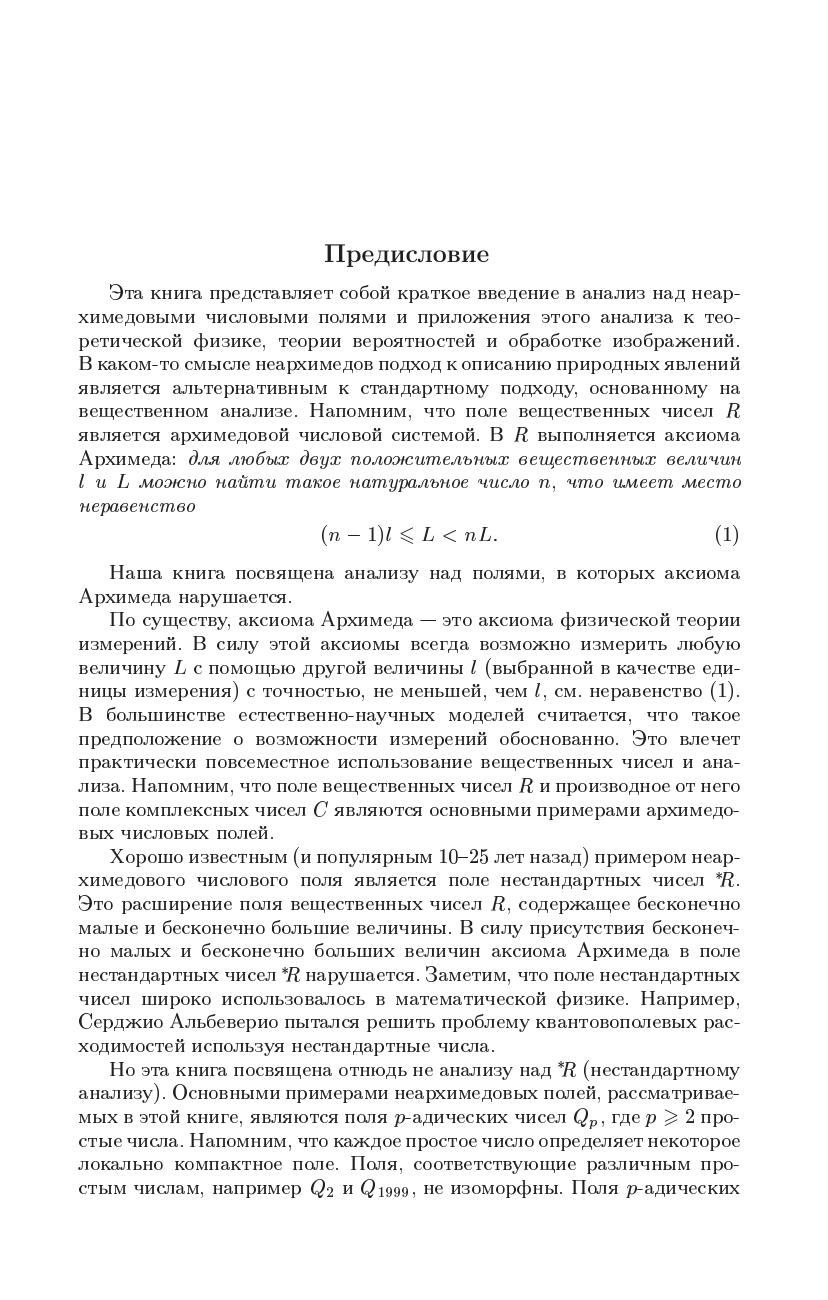 Предлагаемая монография представляет собой краткое введение в анализ над неархимедовыми числовыми и приложения этого анализа к теоретической физике (в частности, основами Qp - значной квантовой механики), теории вероятностей и обработке изображений.Для научных работников и студентов старших курсов, специализирующихся в функциональном анализе, теории обобщенных функций, теории вероятностей, теоретической физике (квантовой теории и космологии), обработке изображений, моделировании биологических процессов.