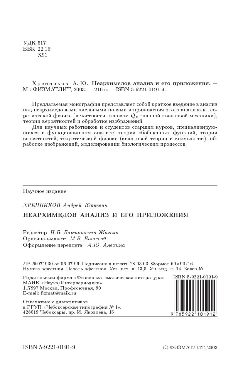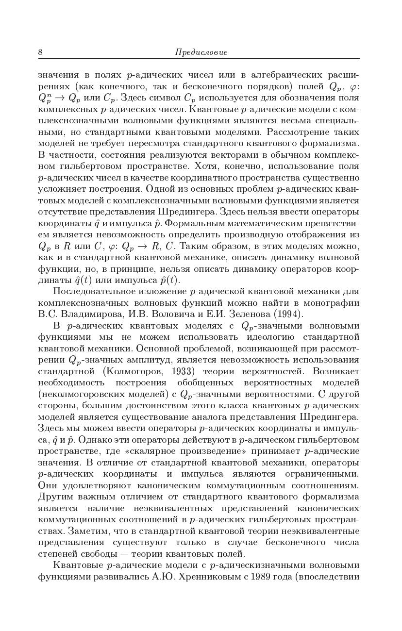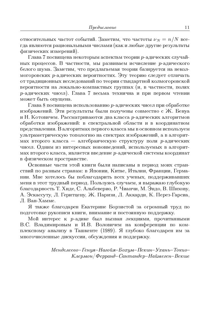 Предлагаемая монография представляет собой краткое введение в анализ над неархимедовыми числовыми и приложения этого анализа к теоретической физике (в частности, основами Qp - значной квантовой механики), теории вероятностей и обработке изображений.Для научных работников и студентов старших курсов, специализирующихся в функциональном анализе, теории обобщенных функций, теории вероятностей, теоретической физике (квантовой теории и космологии), обработке изображений, моделировании биологических процессов.