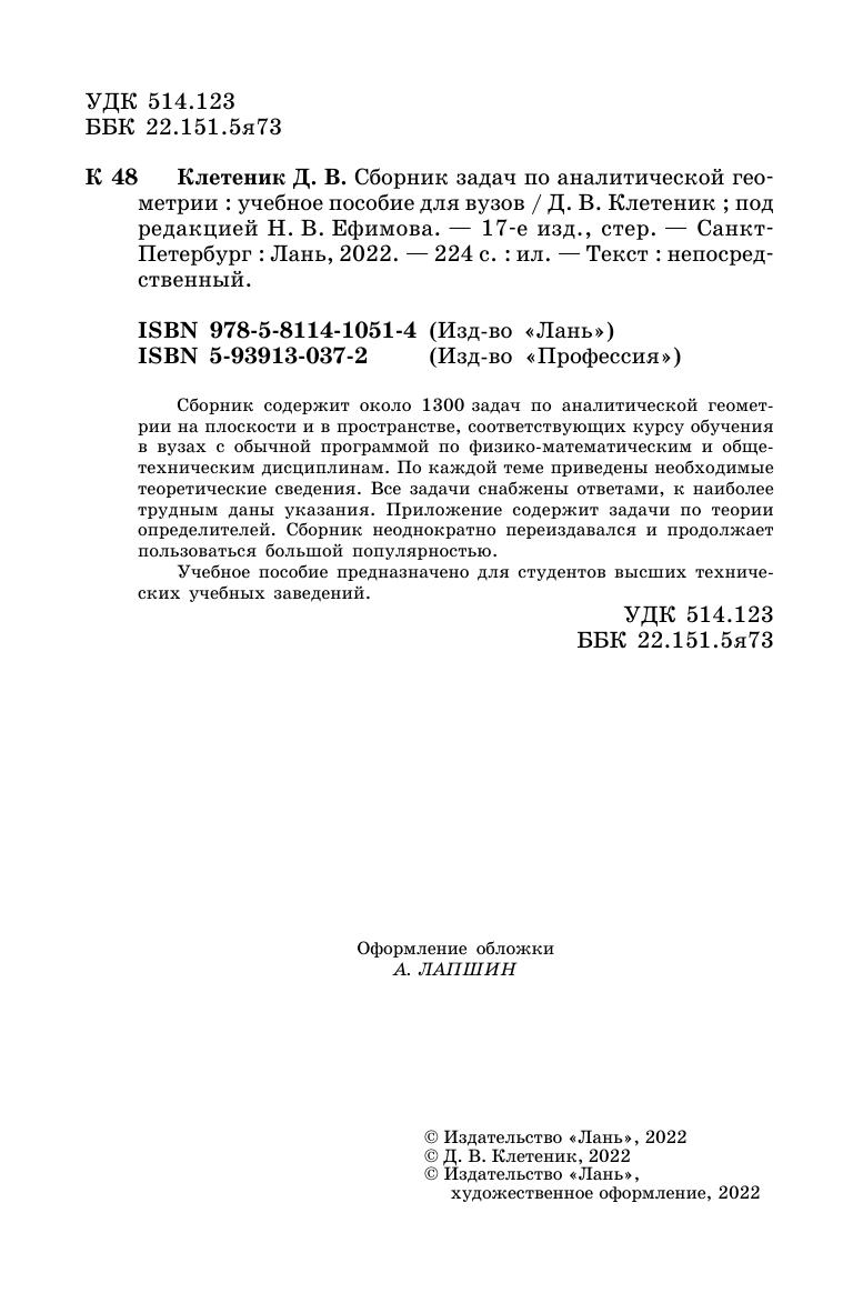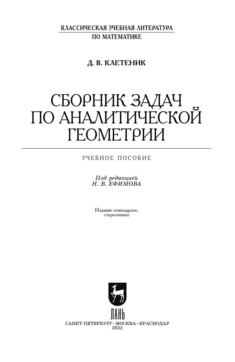 Сборник содержит около 1300 задач по аналитической геометрии на плоскости и в пространстве, соответствующих курсу обучения в вузах с обычной программой по физико-математическим и общетехническим дисциплинам. По каждой теме приведены необходимые теоретические сведения. Все задачи снабжены ответами, к наиболее трудным даны указания. Приложение содержит задачи по теории определителей. Сборник неоднократно переиздавался и продолжает пользоваться большой популярностью. Учебное пособие предназначено для студентов высших технических учебных заведений.