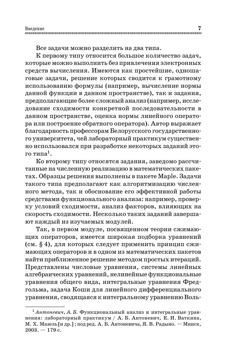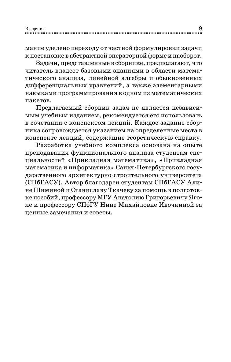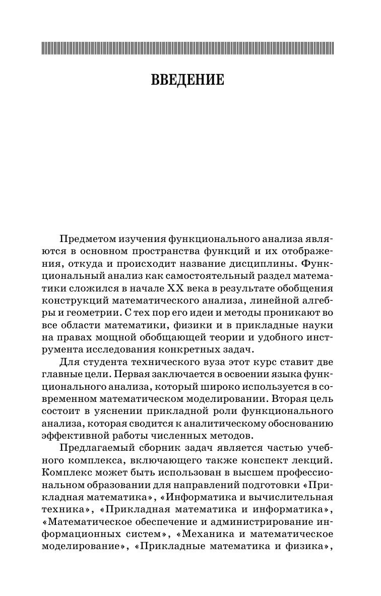 Учебное пособие включает задания, принадлежащие трем традиционным модулям функционального анализа: теории сжимающих операторов, теории рядов Фурье в гильбертовом пространстве и теории линейных операторов. Каждая задача представлена в 20 вариантах, все задачи снабжены образцами решений либо указаниями к решению. Сборник задач предназначен студентам технических вузов для практического освоения вводного курса в функциональный анализ. Изложение материала учитывает специфику подготовки студентов в техническом вузе и имеет прикладную ориентацию. Преобладают задания вычислительного характера. Данный сборник задач рекомендуется использовать в сочетании с конспектом лекций по функциональному анализу того же автора. Комплекс может быть использован в высшем профессиональном образовании для направлений подготовки «Прикладная математика», «Информатика и вычислительная техника», «Прикладная математика и информатика», «Математическое обеспечение и администрирование информационных систем», «Механика и математическое моделирование», «Прикладные математика и физика», «Фундаментальная информатика и информационные технологии».