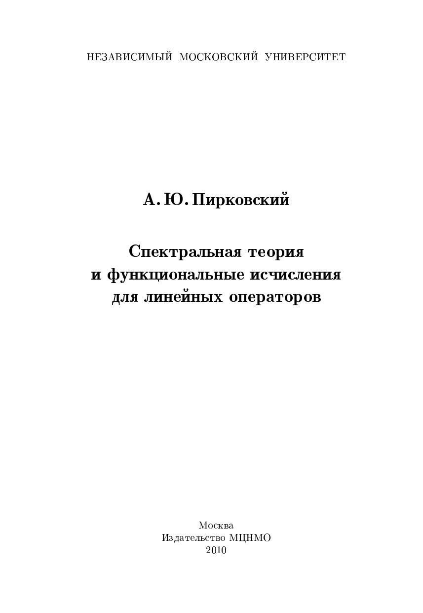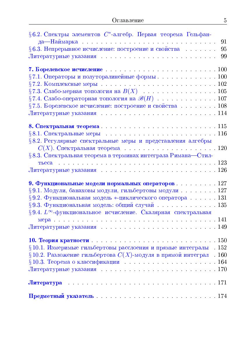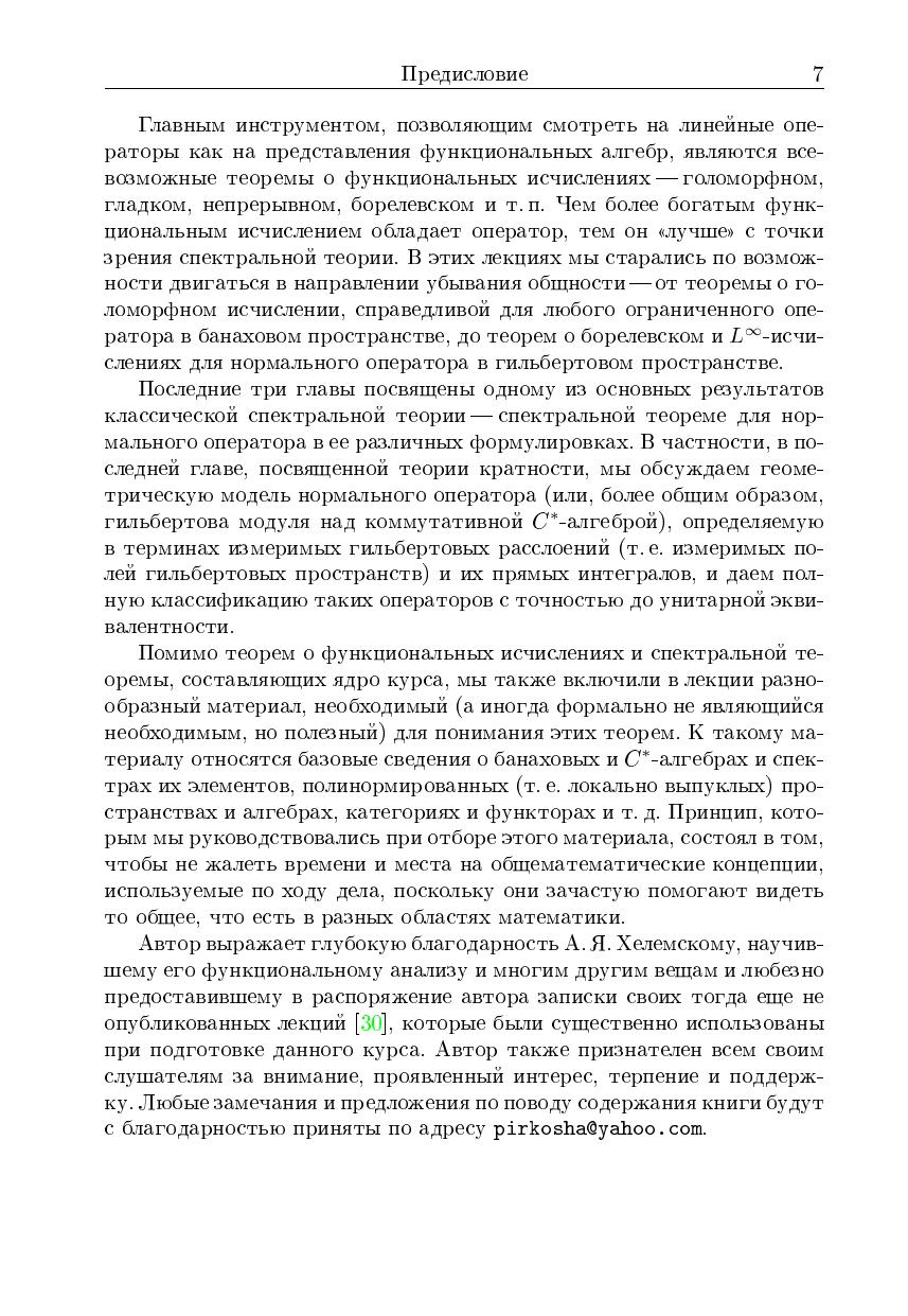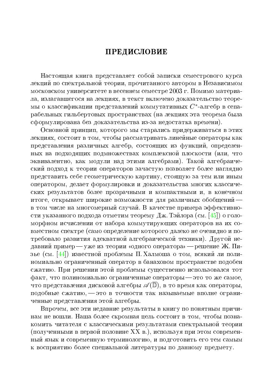 Книга представляет собой записки семестрового курса лекций по спектральной теории, прочитанного автором в Независимом московском университете в весеннем семестре 2003 г. Ее можно рассматривать как дополнение к стандартному университетскому курсу функционального анализа. Особое внимание уделяется построению функциональных исчислений (от голоморфного до $L^\infty$-исчисления) и доказательству спектральной теоремы в ее различных формулировках. Включено также изложение теории кратности в терминах измеримых гильбертовых расслоений. Для книги характерен алгебраический подход, при котором линейные операторы трактуются как представления функциональных алгебр.Для студентов и аспирантов математических и физических специальностей.