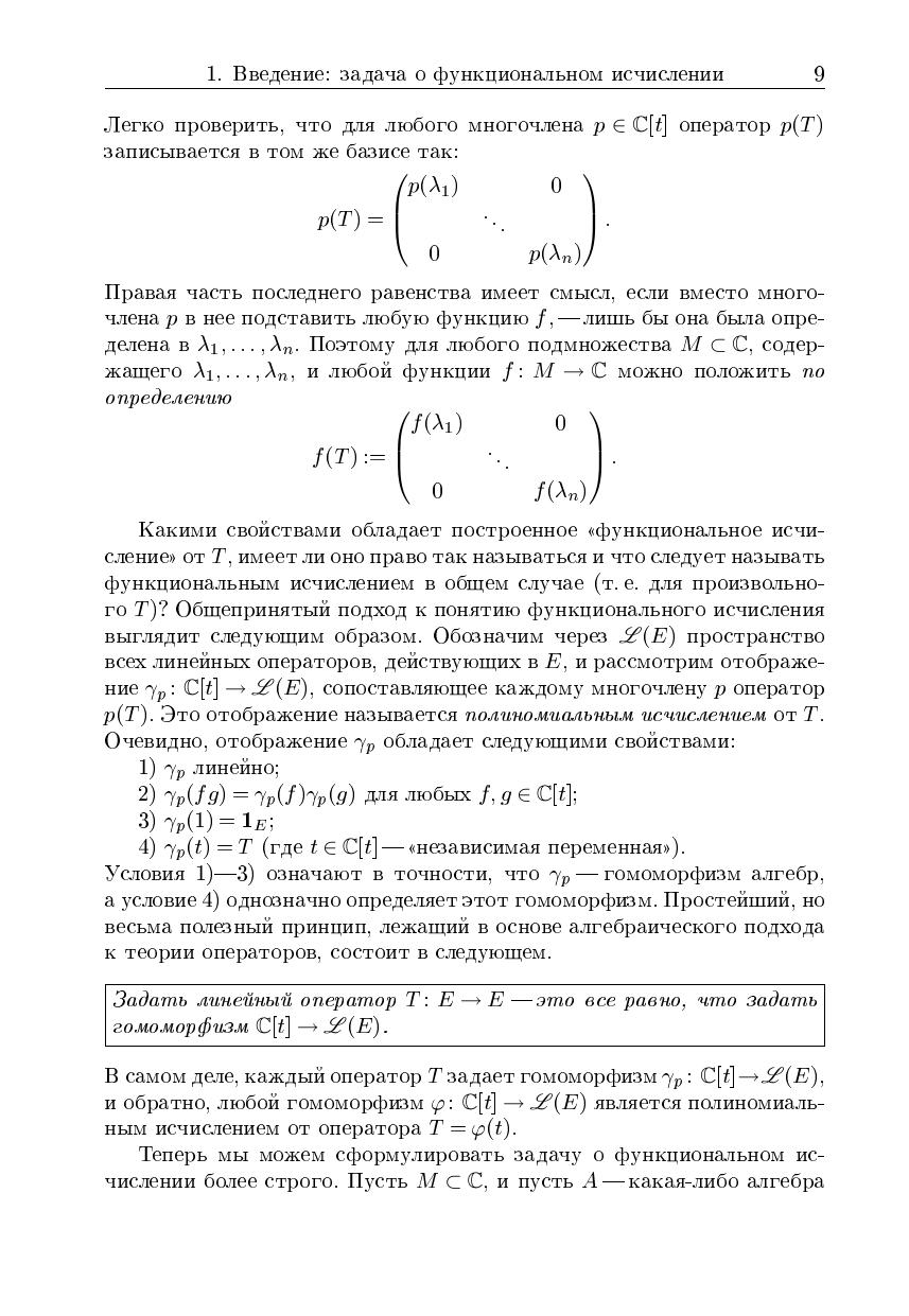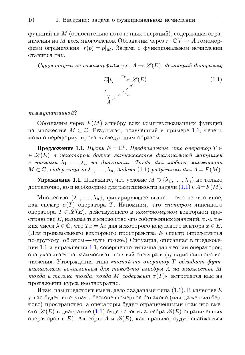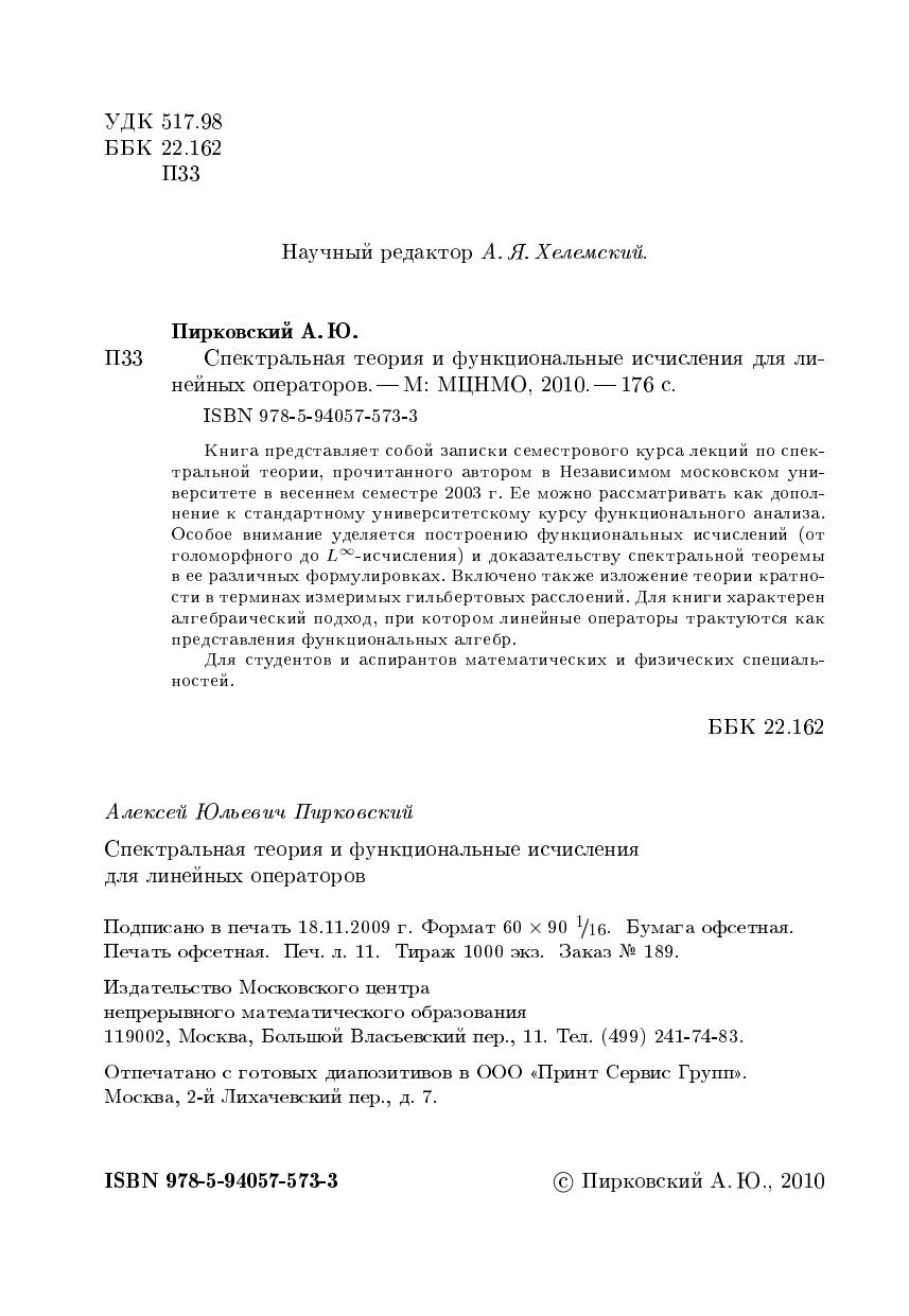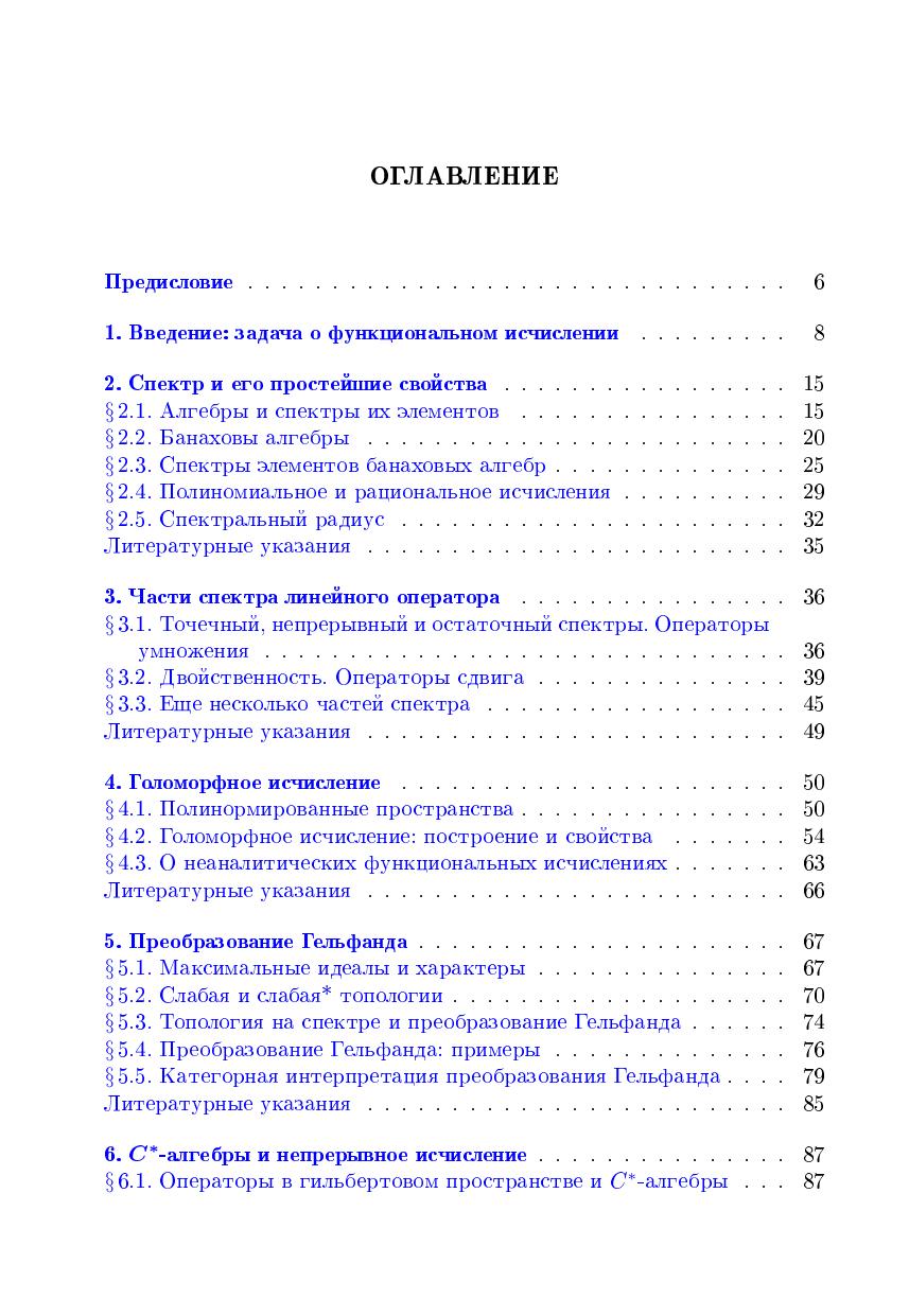 Книга представляет собой записки семестрового курса лекций по спектральной теории, прочитанного автором в Независимом московском университете в весеннем семестре 2003 г. Ее можно рассматривать как дополнение к стандартному университетскому курсу функционального анализа. Особое внимание уделяется построению функциональных исчислений (от голоморфного до $L^\infty$-исчисления) и доказательству спектральной теоремы в ее различных формулировках. Включено также изложение теории кратности в терминах измеримых гильбертовых расслоений. Для книги характерен алгебраический подход, при котором линейные операторы трактуются как представления функциональных алгебр.Для студентов и аспирантов математических и физических специальностей.