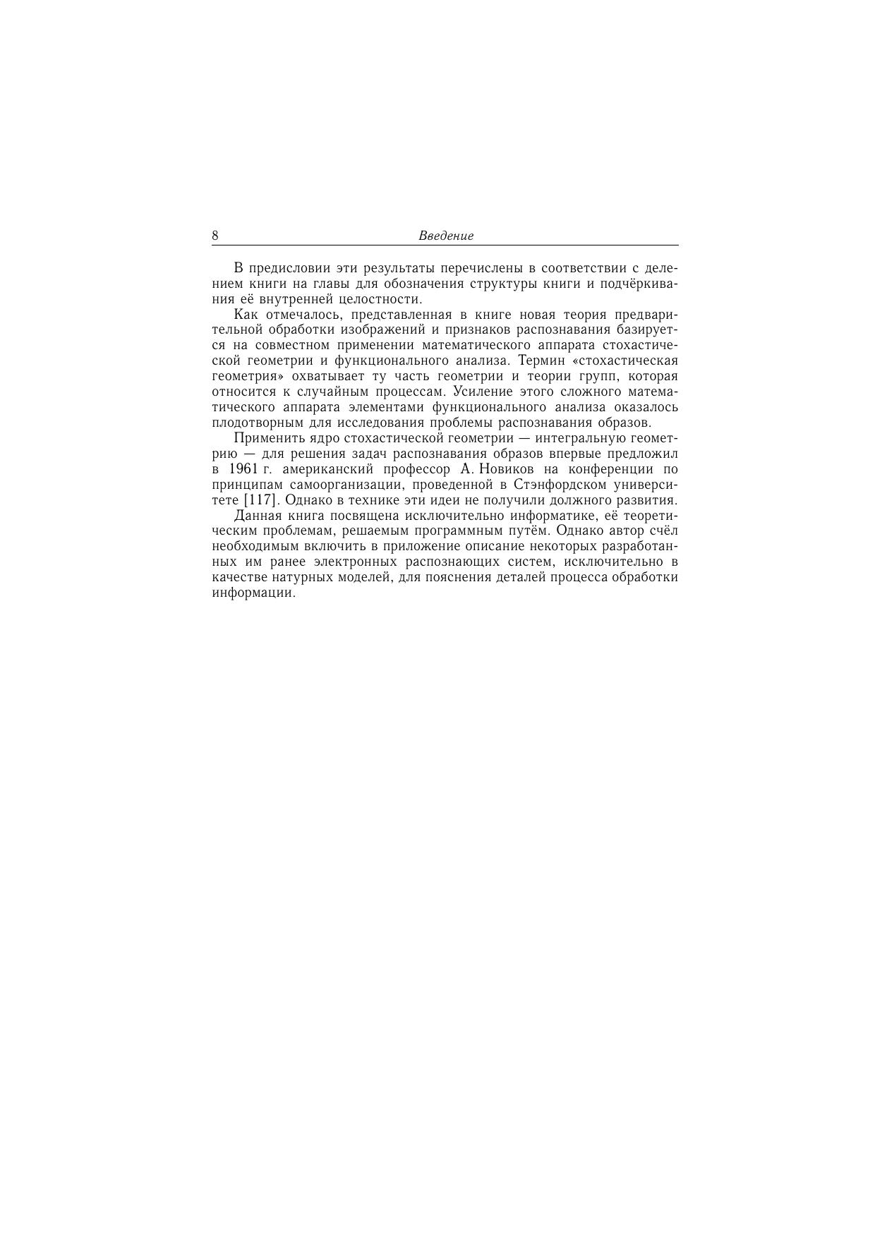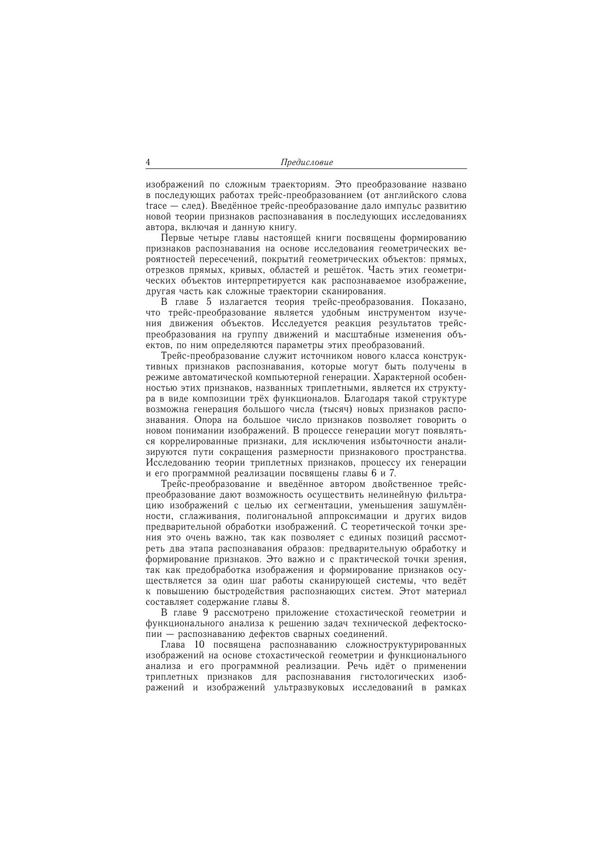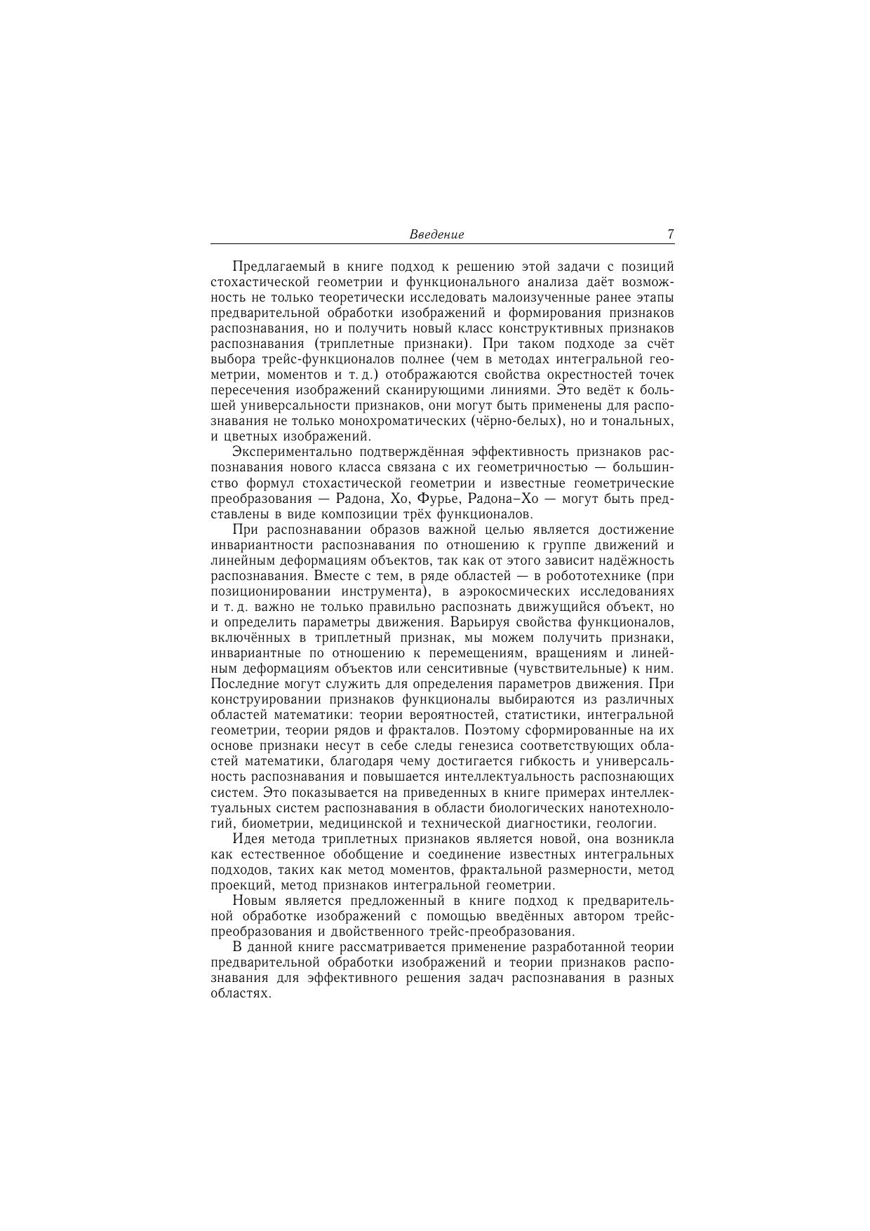 В книге предлагается новая теория признаков распознавания образов на основе стохастической геометрии и функционального анализа, которая позволяет формировать конструктивные признаки распознавания нового класса - триплетные признаки. Источником формирования триплетных признаков является введенное автором новое геометрическое преобразование, связанное со сканированием изображений по сложным траекториям. Построена с единых позиций объединенная теория признаков распознавания и предварительной обработки изображений, пригодная для создания мощных самонастраивающихся систем распознавания образов. Приведены примеры эффективного применения теории в области геологии, медицинской и технической диагностики, нанотехнологии, биометрии.