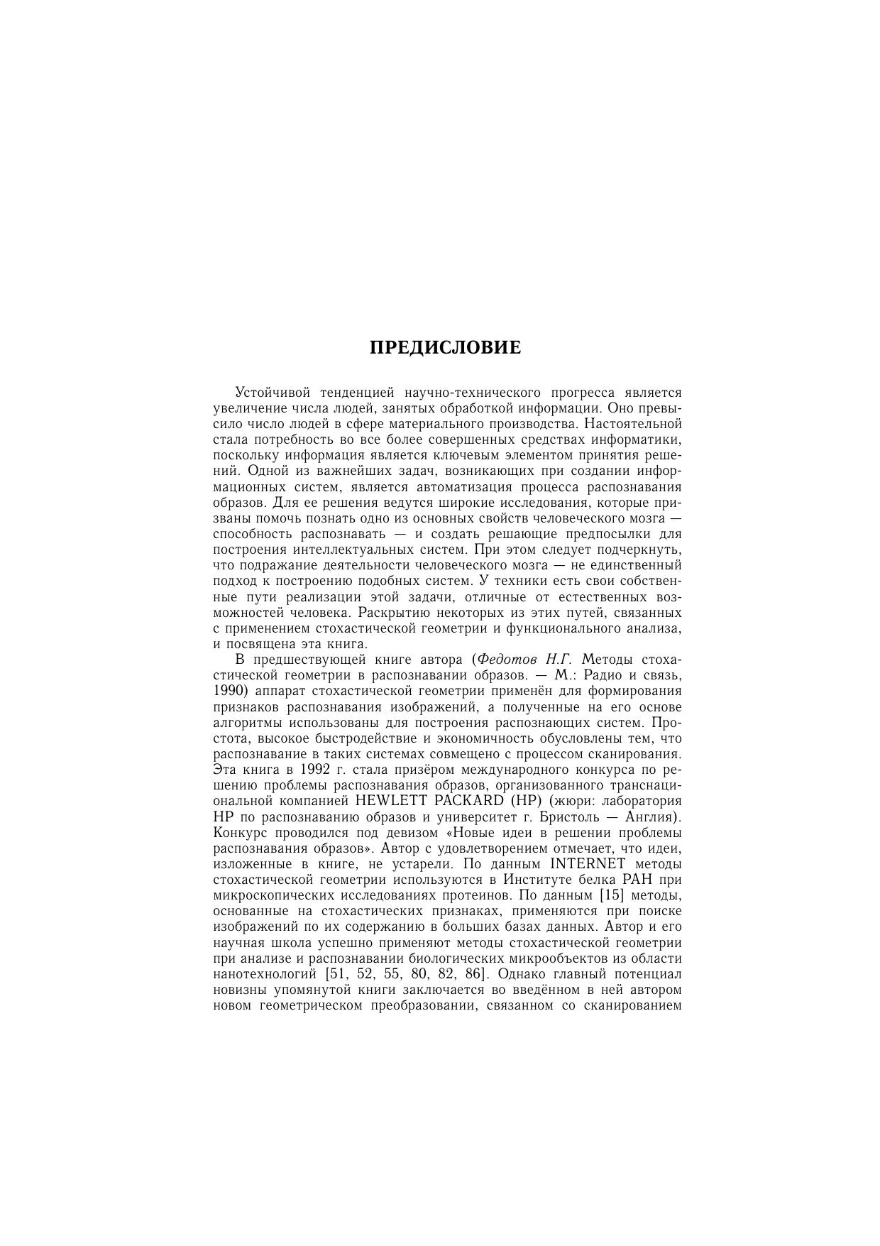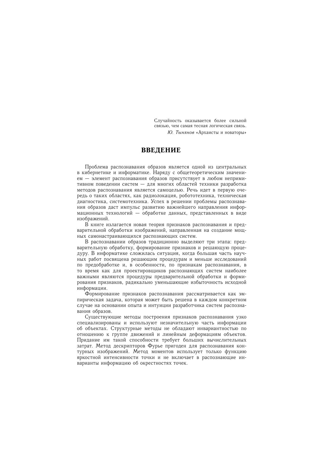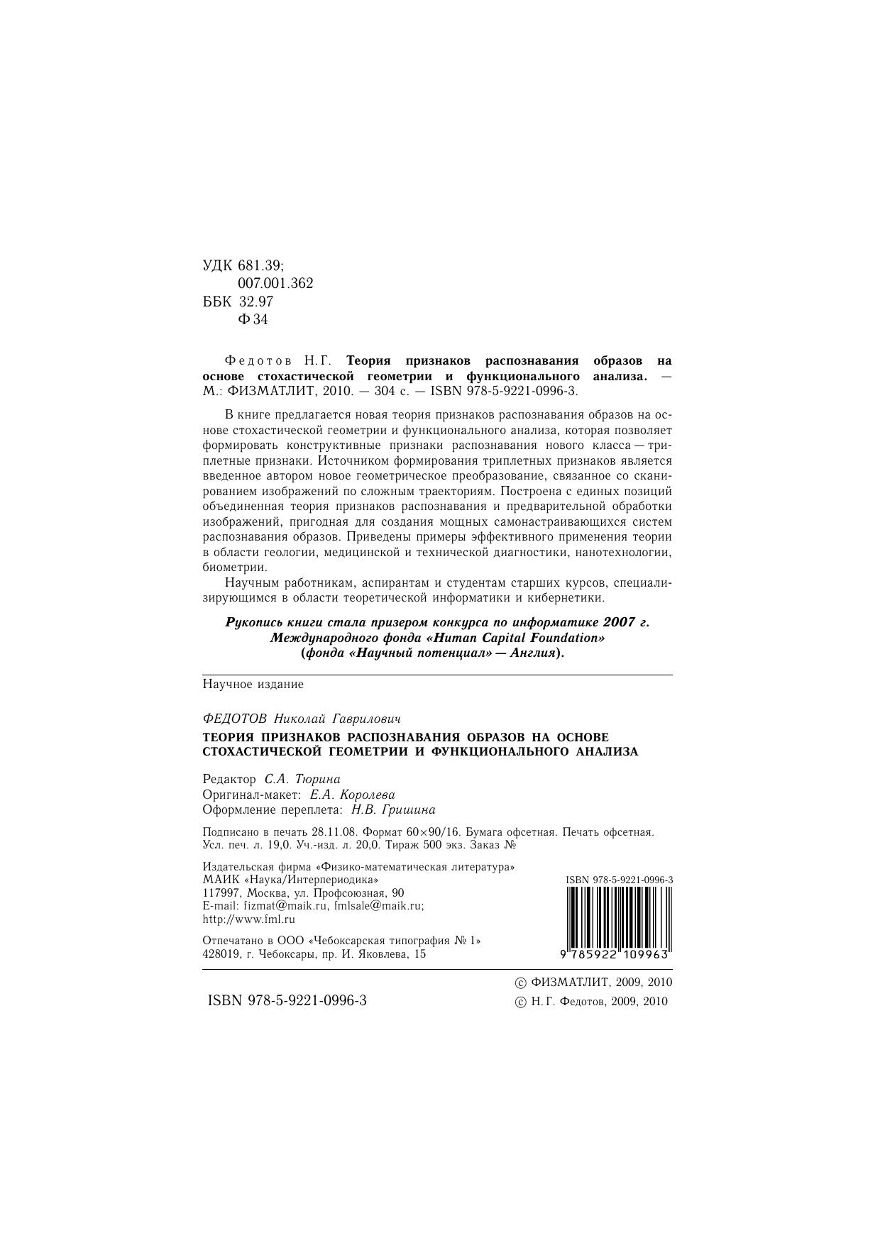 В книге предлагается новая теория признаков распознавания образов на основе стохастической геометрии и функционального анализа, которая позволяет формировать конструктивные признаки распознавания нового класса - триплетные признаки. Источником формирования триплетных признаков является введенное автором новое геометрическое преобразование, связанное со сканированием изображений по сложным траекториям. Построена с единых позиций объединенная теория признаков распознавания и предварительной обработки изображений, пригодная для создания мощных самонастраивающихся систем распознавания образов. Приведены примеры эффективного применения теории в области геологии, медицинской и технической диагностики, нанотехнологии, биометрии.