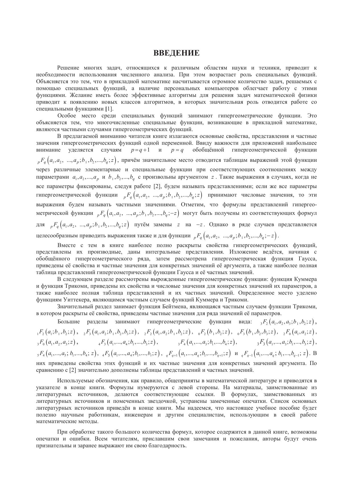 Книга является наиболее полным справочным руководством по гипергеометрическим функциям. Она содержит основные свойства гипергеометрических функций, их производные, пределы, интегральные представления, формулы преобразования и частные значения. В неё включены результаты, изложенные в аналогичных изданиях, а также в научной литературе. Книга представляет большой интерес для широкого круга специалистов в различных областях науки и техники, в том числе для математиков, механиков, инженеров и преподавателей, а также для студентов высших учебных заведений. Значительная часть результатов получена авторами впервые.