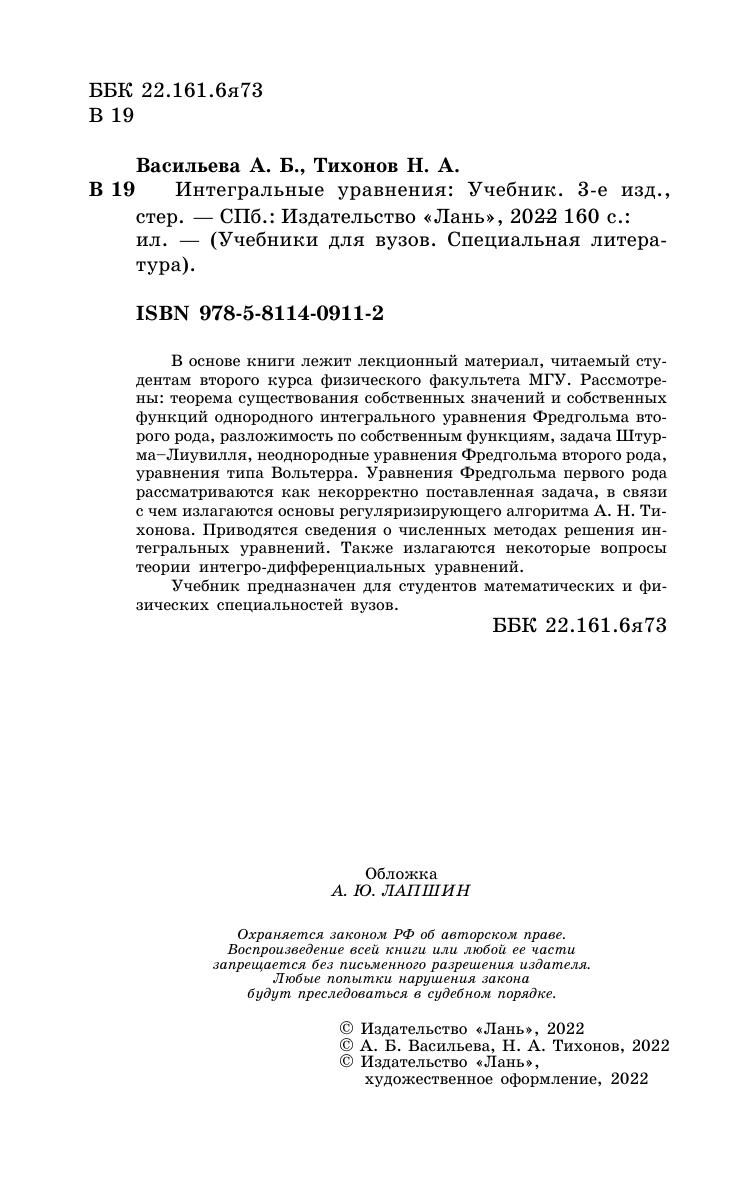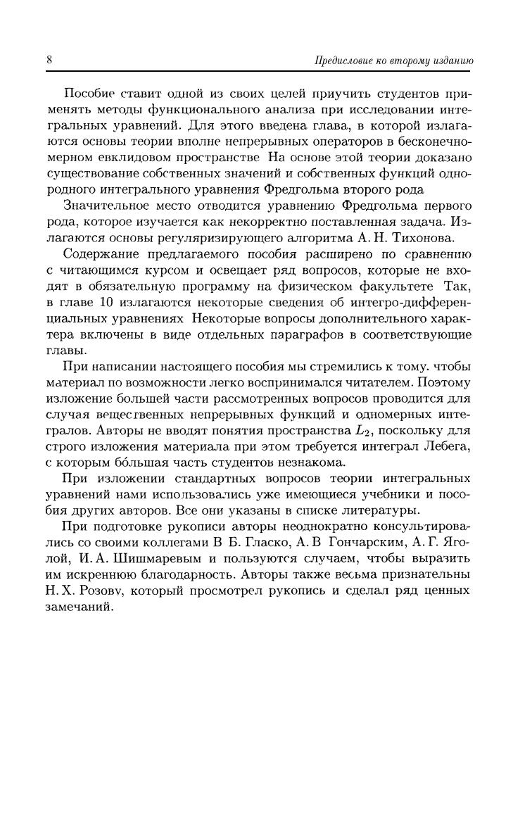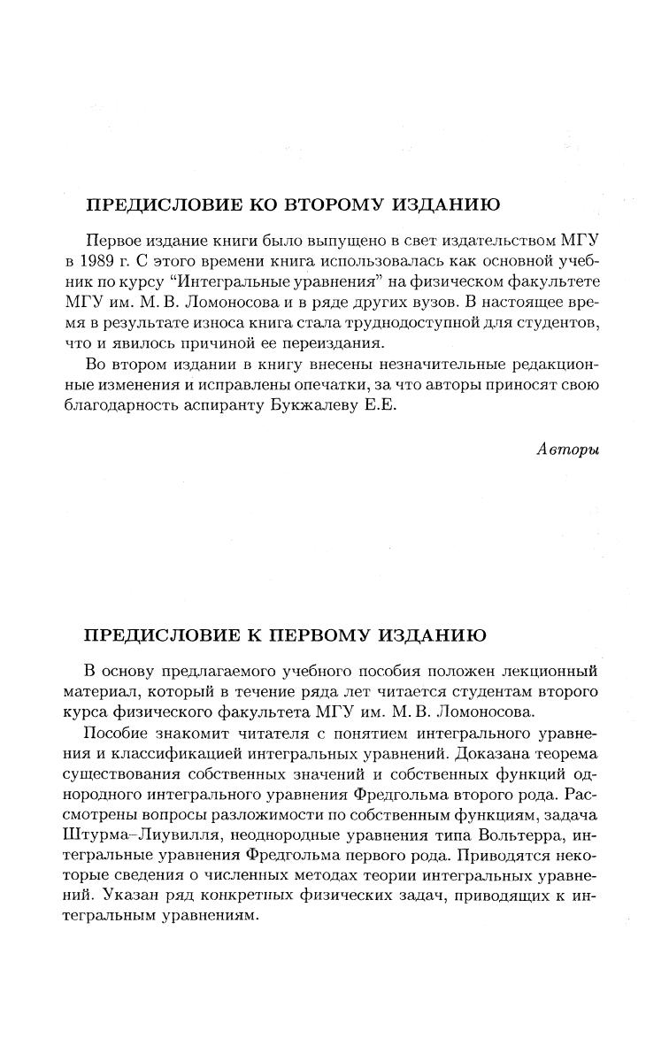 В основе книги лежит лекционный материал, читаемый студентам второго курса физического факультета МГУ. Рассмотрены: теорема существования собственных значений и собственных функций однородного интегрального уравнения Фредгольма второго рода, разложимость по собственным функциям, задача Штурма–Лиувилля, неоднородные уравнения Фредгольма второго рода, уравнения типа Вольтерра. Уравнения Фредгольма первого рода рассматриваются как некорректно поставленная задача, в связи с чем излагаются основы регуляризирующего алгоритма А. Н. Тихонова. Приводятся сведения о численных методах решения интегральных уравнений. Также излагаются некоторые вопросы теории интегро-дифференциальных уравнений. Учебник предназначен для студентов математических и физических специальностей вузов.