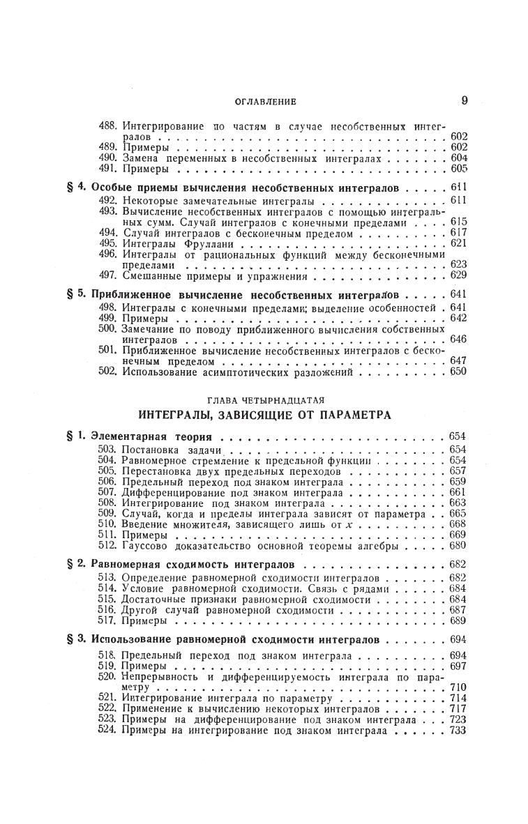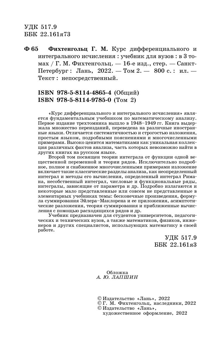 Второй том «Курса...» посвящен теории интеграла от функции одной вещественной переменной и теории рядов. Исключительно подробное, полное и снабженное многочисленными примерами изложение включает такие классические разделы анализа, как неопределенный интеграл и методы его вычисления, определенный интеграл Римана, несобственный интеграл, числовые и функциональные ряды, интегралы, зависящие от параметра и др. Подробно излагаются и некоторые мало представленные или совсем не представленные в элементарных учебниках темы: бесконечные произведения, формула суммирования Эйлера–Маклорена и ее приложения, асимптотические разложения, теория суммирования и приближенные вычисления с помощью расходящихся рядов и др.