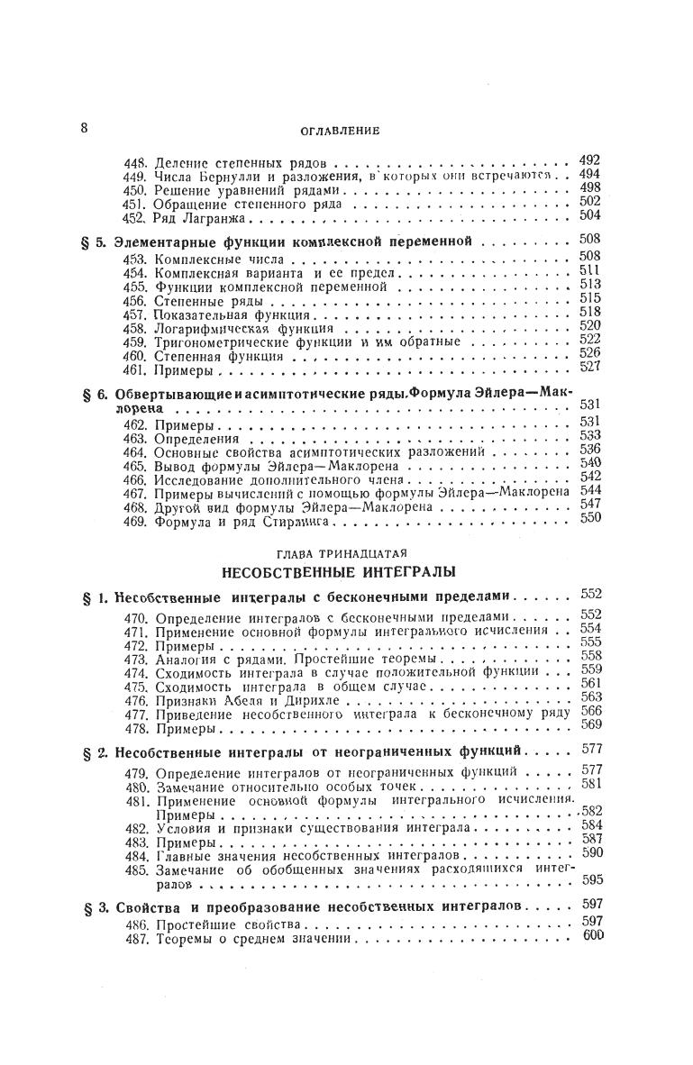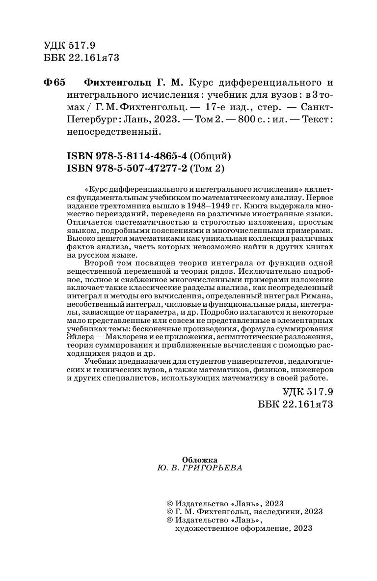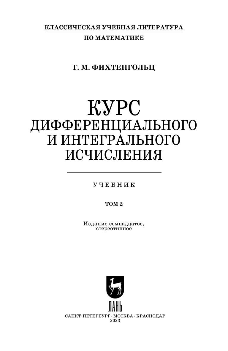 «Курс дифференциального и интегрального исчисления» является фундаментальным учебником по математическому анализу. Первое издание трехтомного «Курса...» вышло в 1948–1949 гг. Книга выдержала множество переизданий, переведена на различные иностранные языки. Отличается систематичностью и строгостью изложения, простым языком, подробными пояснениями и многочисленными примерами. Высоко ценится математиками как уникальная коллекция различных фактов анализа, часть которых невозможно найти в других книгах на русском языке. Второй том «Курса...» посвящен теории интеграла от функции одной вещественной переменной и теории рядов. Исключительно подробное, полное и снабженное многочисленными примерами изложение включает такие классические разделы анализа, как неопределенный интеграл и методы его вычисления, определенный интеграл Римана, несобственный интеграл, числовые и функциональные ряды, интегралы, зависящие от параметра и др. Подробно излагаются и некоторые мало представленные или совсем не представленные в элементарных учебниках темы: бесконечные произведения, формула суммирования Эйлера–Маклорена и ее приложения, асимптотические разложения, теория суммирования и приближенные вычисления с помощью расходящихся рядов и др. Учебник предназначен для студентов университетов, педагогических и технических вузов, а также математиков, физиков, инженеров и других специалистов, использующих математику в своей работе.