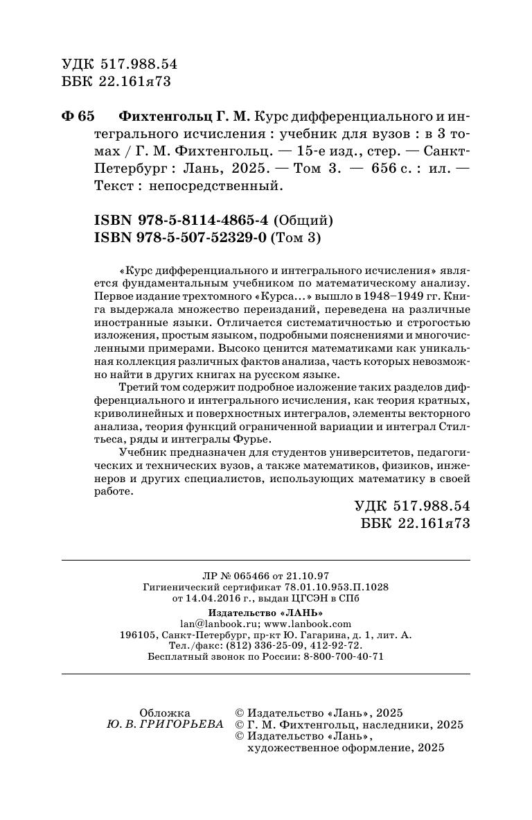 Данный трехтомник является фундаментальным учебником по математическому анализу. В первом томе «Курс дифференциального и интегрального исчисления» является фундаментальным учебником по математическому анализу. Первое издание трехтомного «Курса...» вышло в 1948–1949 гг. Книга выдержала множество переизданий, переведена на различные иностранные языки. Отличается систематичностью и строгостью изложения, простым языком, подробными пояснениями и многочисленными примерами. Высоко ценится математиками как уникальная коллекция различных фактов анализа, часть которых невозможно найти в других книгах на русском языке. Третий том содержит подробное изложение таких разделов дифференциального и интегрального исчисления, как теория кратных, криволинейных и поверхностных интегралов, элементы векторного анализа, теория функций ограниченной вариации и интеграл Стилтьеса, ряды и интегралы Фурье. Учебник предназначен для студентов университетов, педагогических и технических вузов, а также математиков, физиков, инженеров и других специалистов, использующих математику в своей работе.