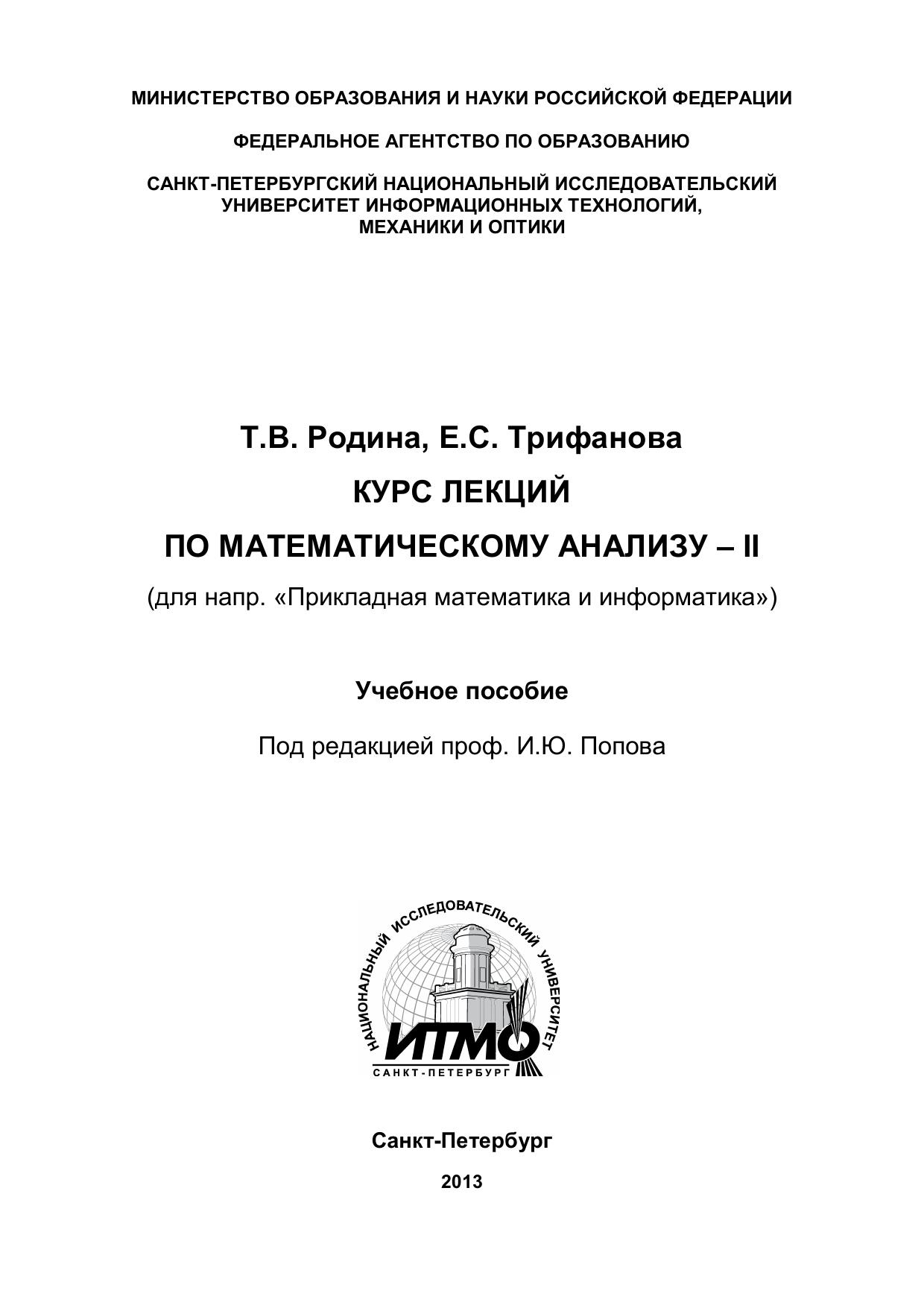 Предлагаемое пособие является продолжением учебного пособия Т.В. Родина, Е.С. Трифанова «Курс лекций по математическому анализу – I » и предназначено для студентов ЕНФ и ФИТИП специальности «Прикладная математика и информатика» . В пособии представлен курс лекций по математическому анализу, читаемых для студентов этой специальности во втором семестре. Данное пособие может быть использовано студентами других специальностей, желающими углубить свои знания в области математического анализа.