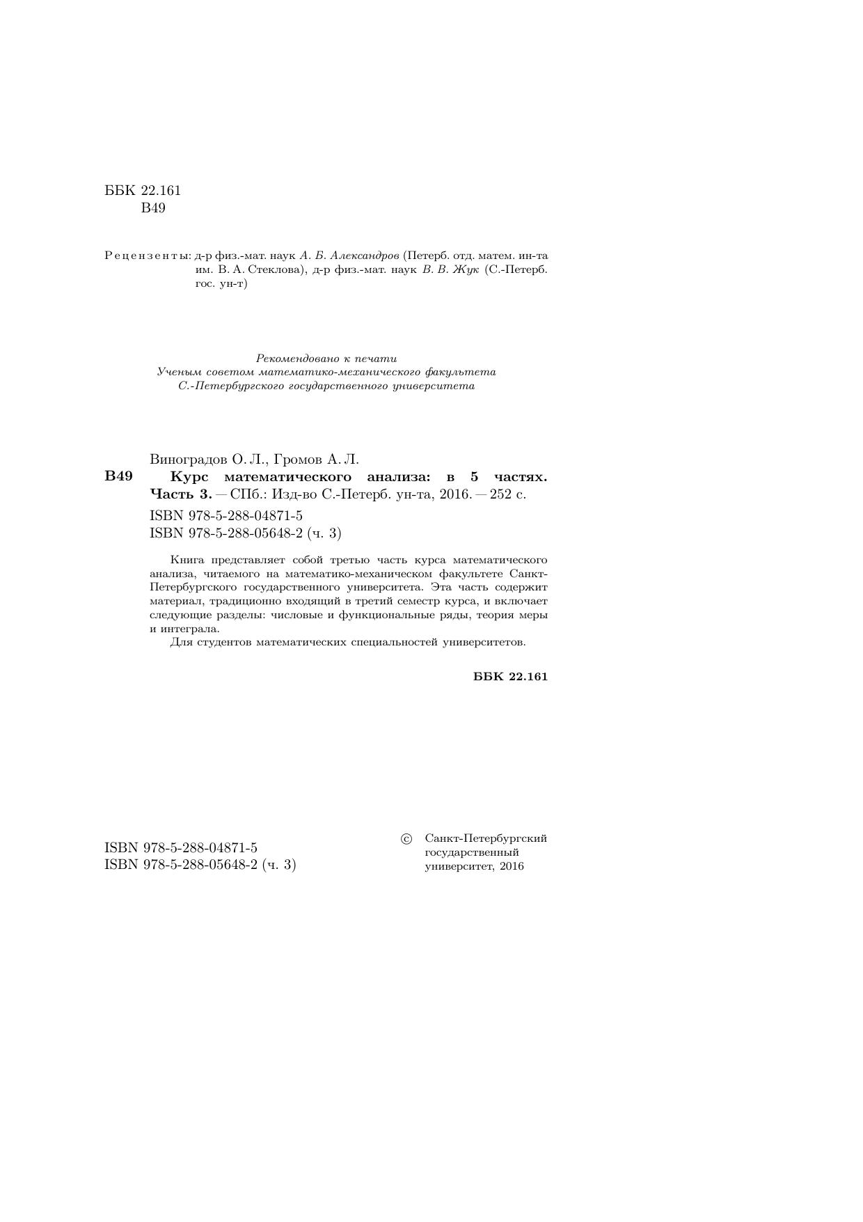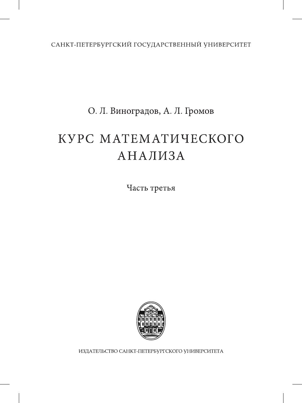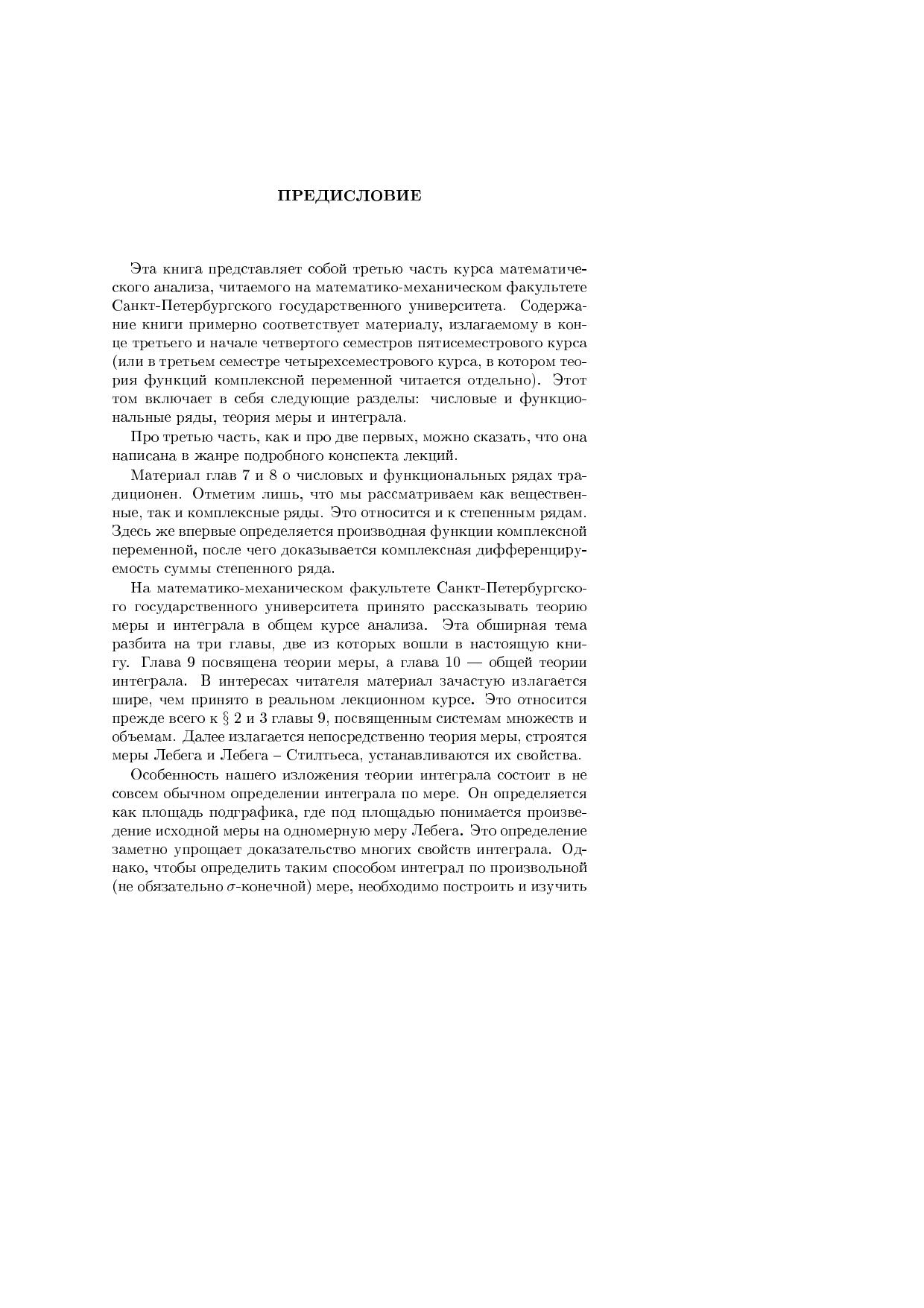 Книга представляет собой третью часть курса математического анализа, читаемого на математико-механическом факультете Санкт-Петербургского государственного университета. Эта часть содержит материал, традиционно входящий в третий семестр курса, и включает следующие разделы: числовые и функциональные ряды, теория меры и интеграла. Для студентов математических специальностей университетов.