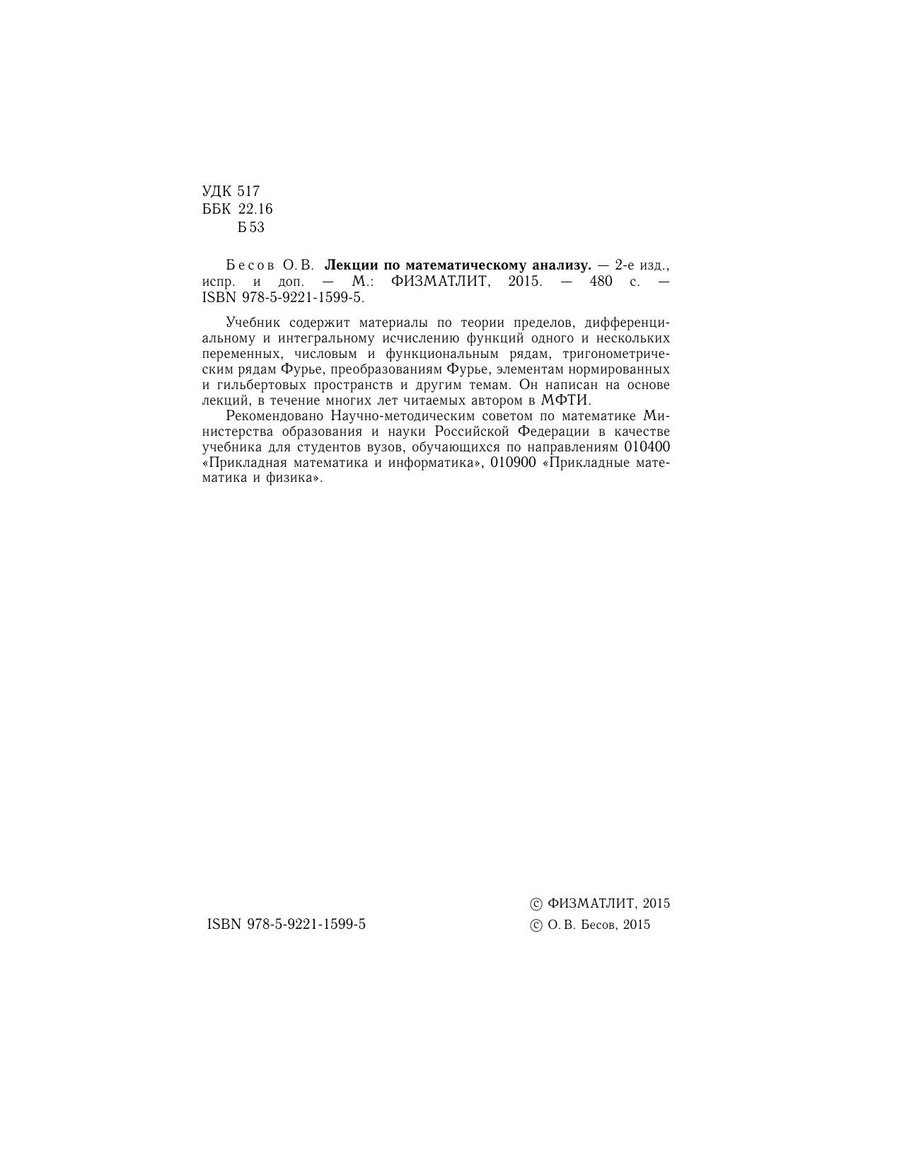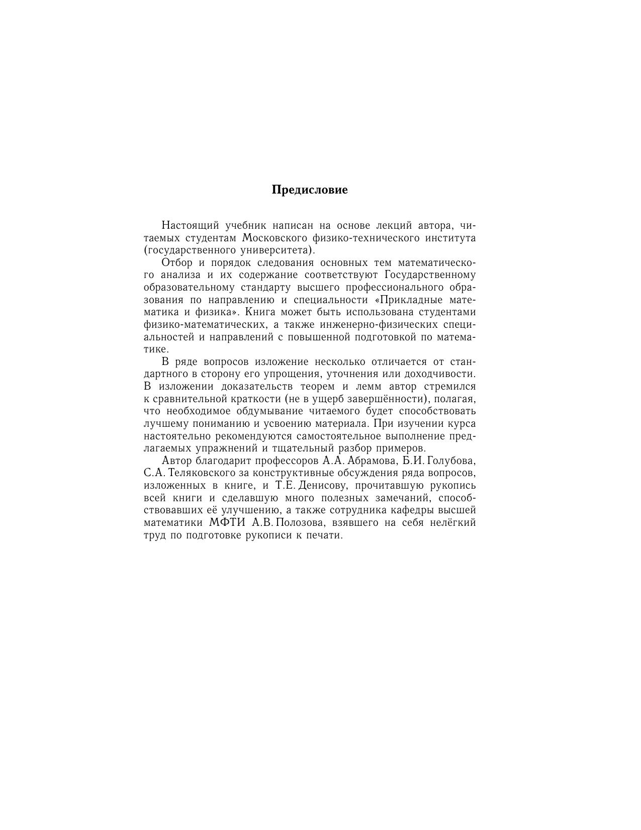 Учебник содержит материалы по теории пределов, дифференциальному и интегральному исчислению функций одного и нескольких переменных, числовым и функциональным рядам, тригонометрическим рядам Фурье, преобразованиям Фурье, элементам нормированных и гильбертовых пространств и другим темам. Он написан на основе лекций, в течение многих лет читаемых автором в МФТИ.