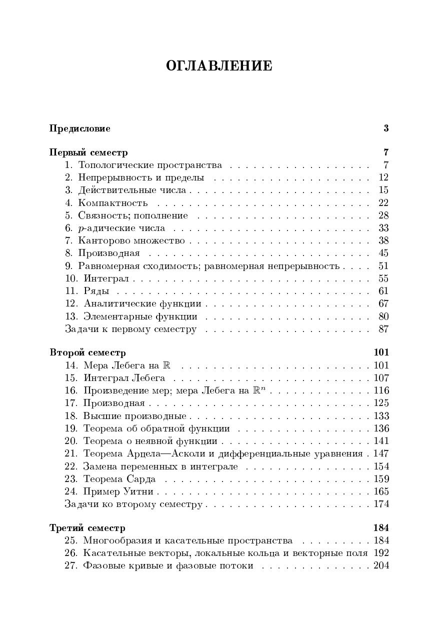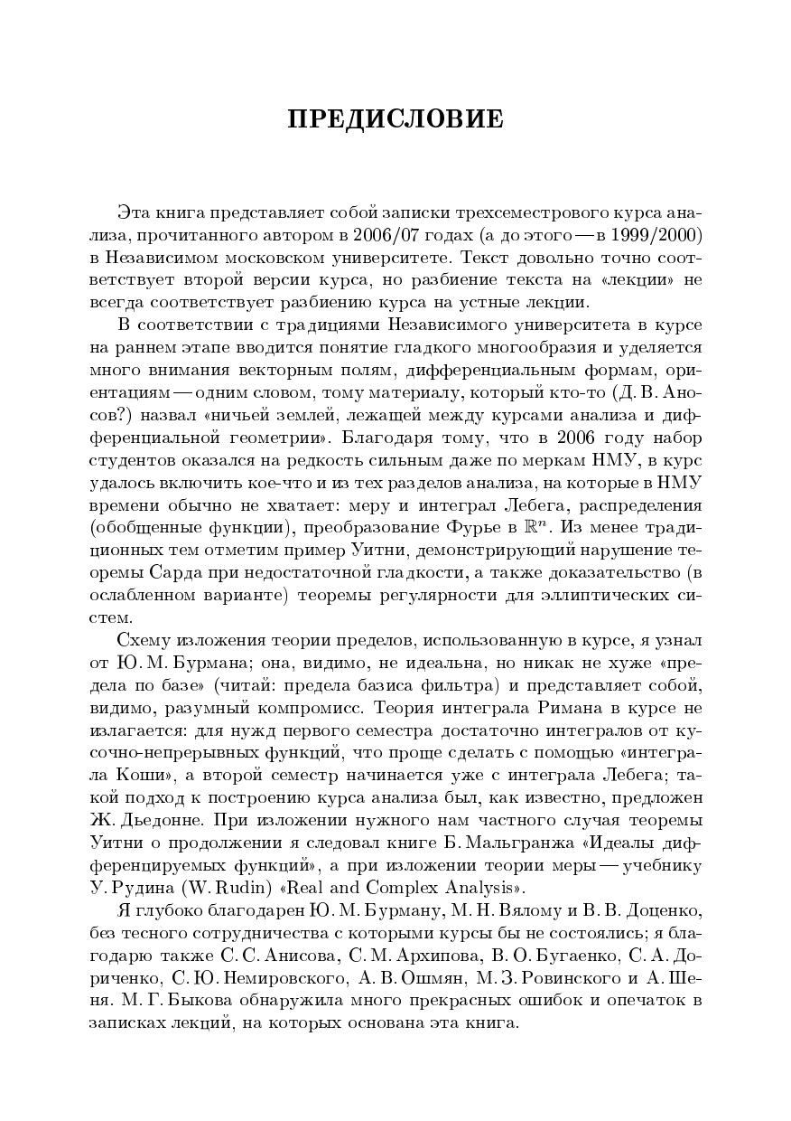 Книга представляет собой записки продвинутого курса анализа, прочитанного автором в 2006/07 годах в Независимом московском университете. В курсе на раннем этапе вводится понятие гладкого многообразия и уделяется много внимания векторным полям, дифференциальным формам, ориентациям и прочему материалу, лежащему между курсами анализа и дифференциальной геометрии. Из менее традиционных тем отметим пример Уитни и доказательство (в ослабленном варианте) теоремы регулярности для эллиптических систем.