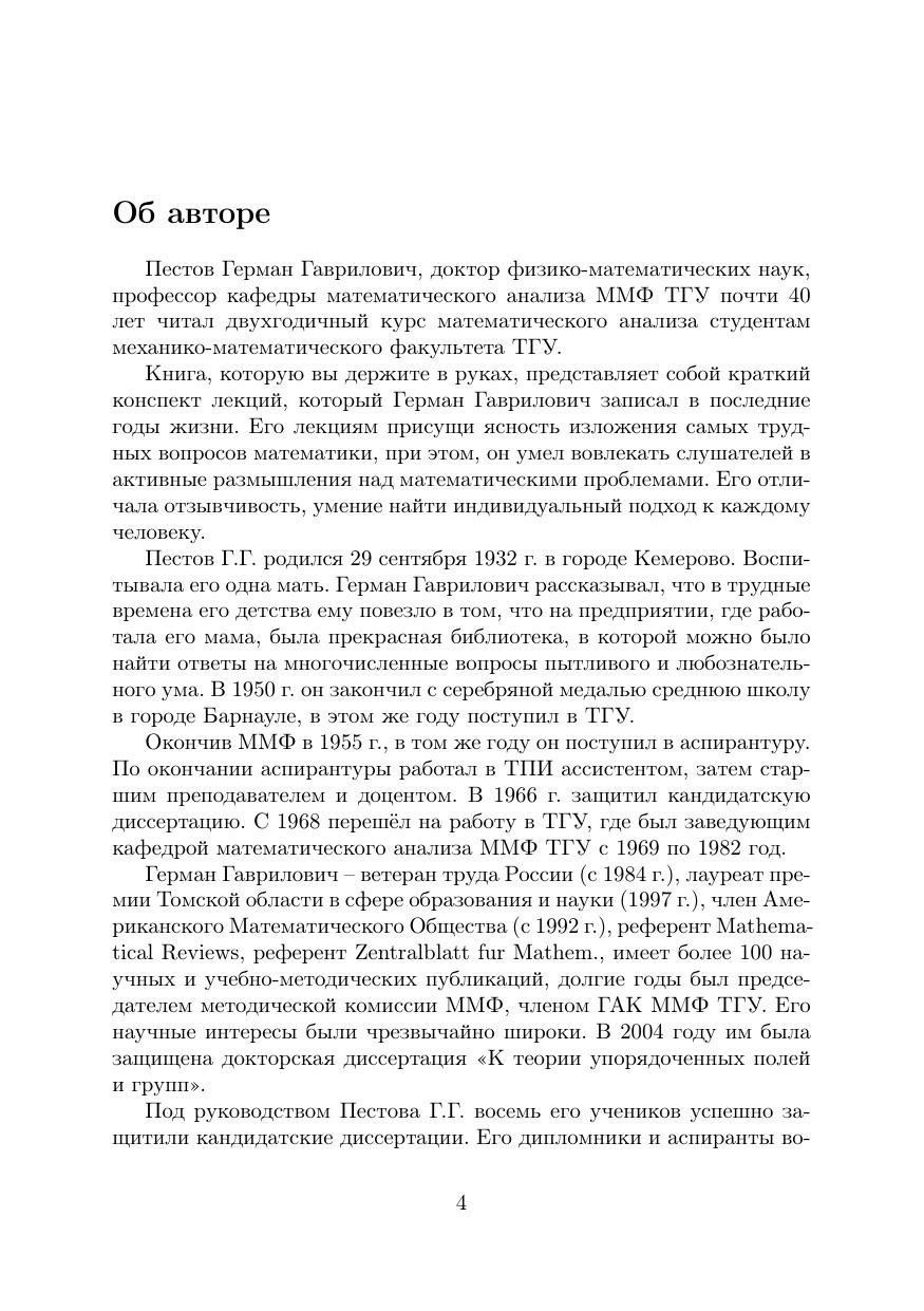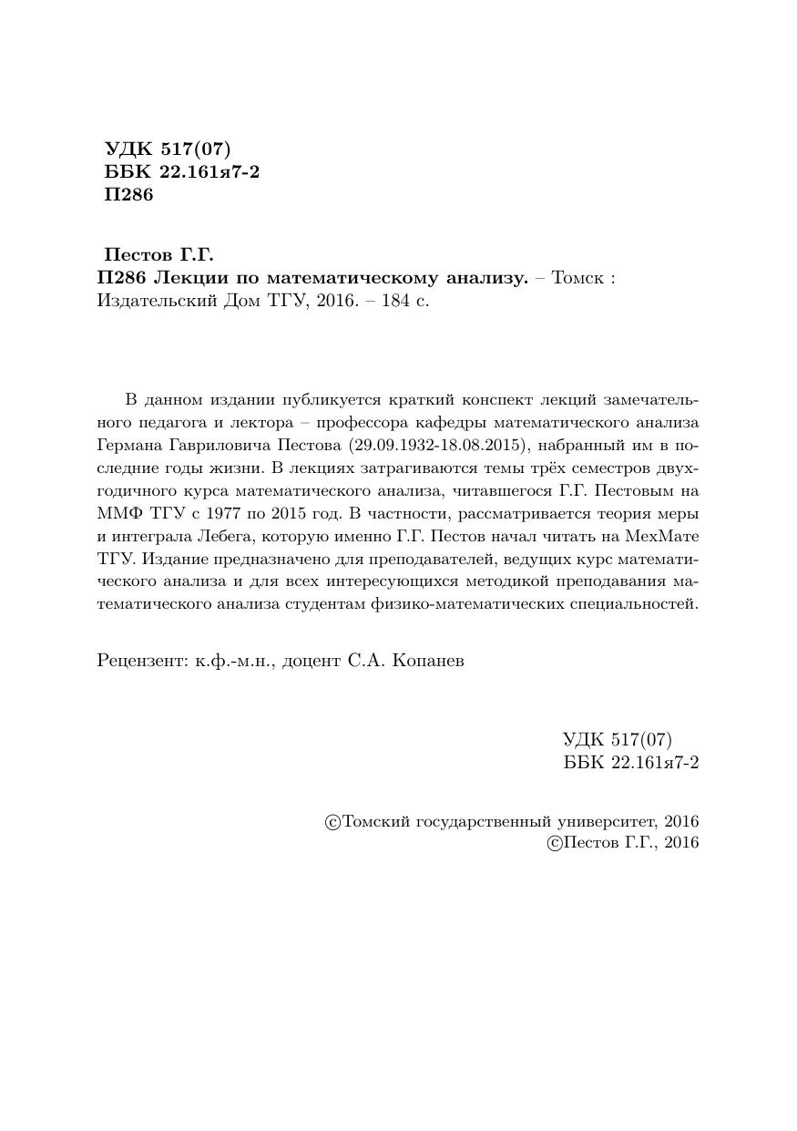 В данном издании публикуется краткий конспект лекций замечательного педагога и лектора – профессора кафедры математического анализа Германа Гавриловича Пестова (29.09.1932-18.08.2015), набранный им в последние годы жизни. В лекциях затрагиваются темы трёх семестров двухгодичного курса математического анализа, читавшегося Г.Г. Пестовым на ММФ ТГУ с 1977 по 2015 год. В частности, рассматривается теория меры и интеграла Лебега, которую именно Г.Г. Пестов начал читать на МехМате ТГУ. Издание предназначено для преподавателей, ведущих курс математического анализа и для всех интересующихся методикой преподавания математического анализа студентам физико-математических специальностей.