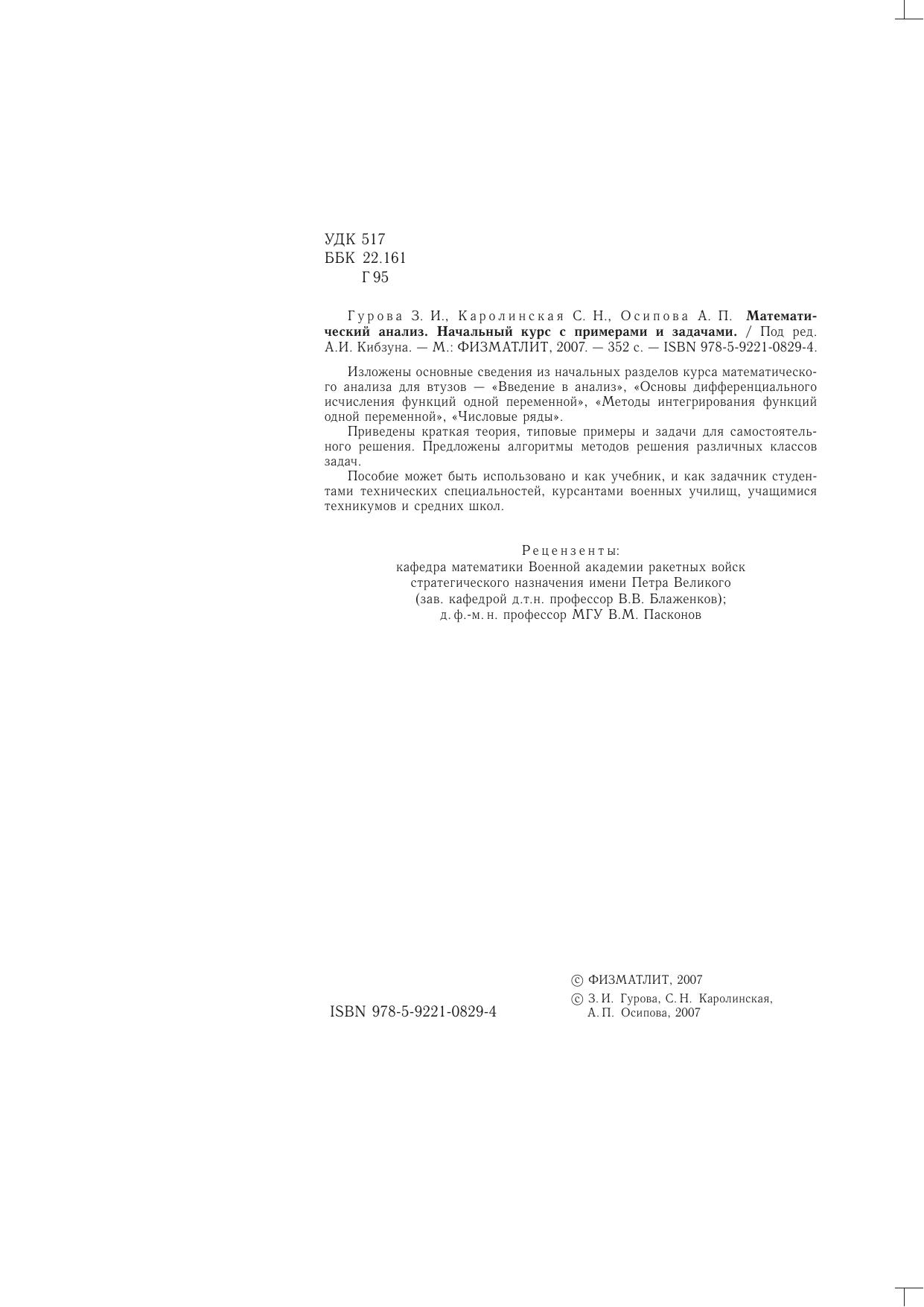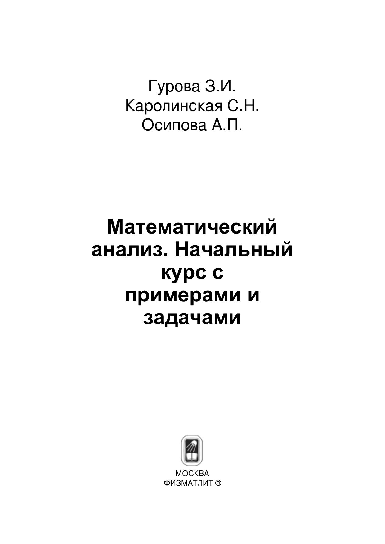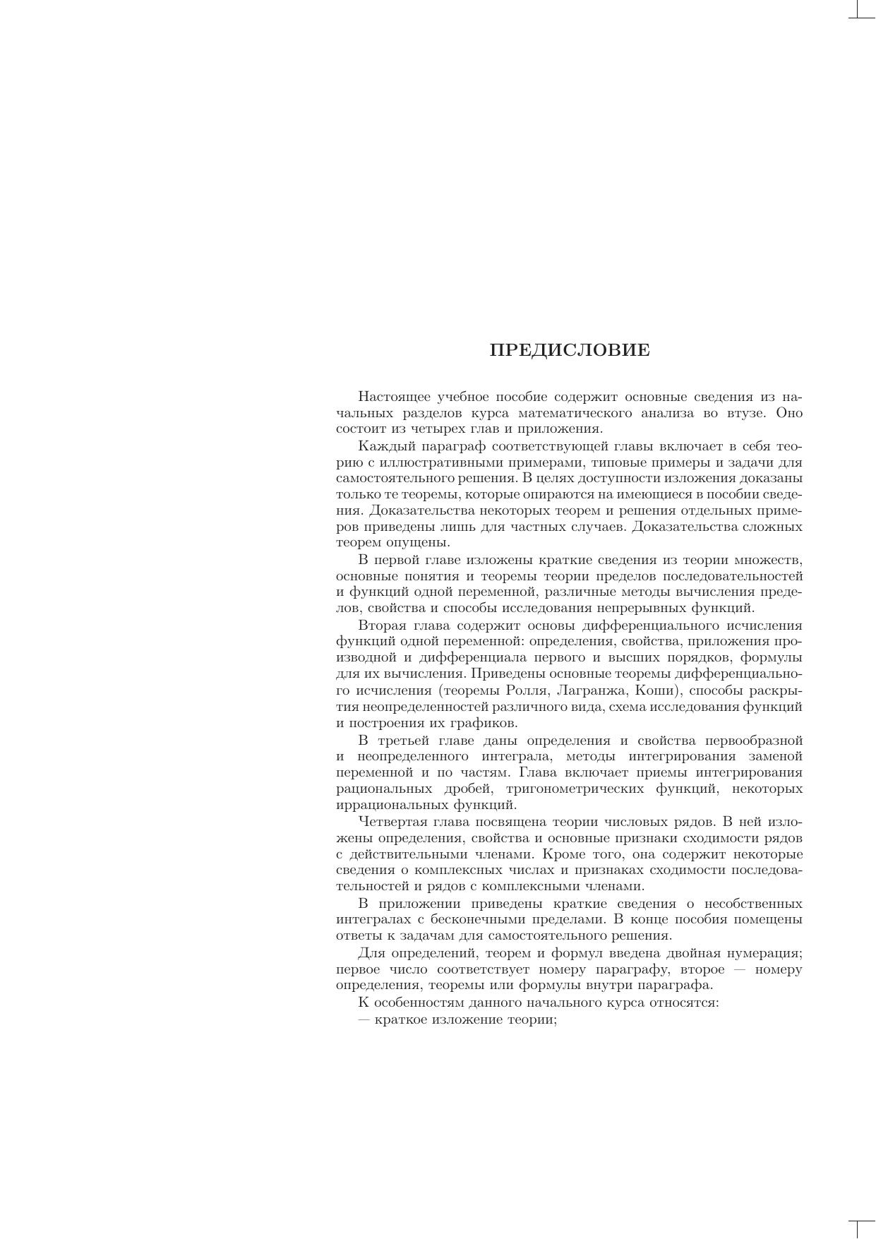 Изложены основные сведения из начальных разделов курса математического анализа для втузов — «Введение в анализ», «Основы дифференциального исчисления функций одной переменной», «Методы интегрирования функций одной переменной», «Числовые ряды».