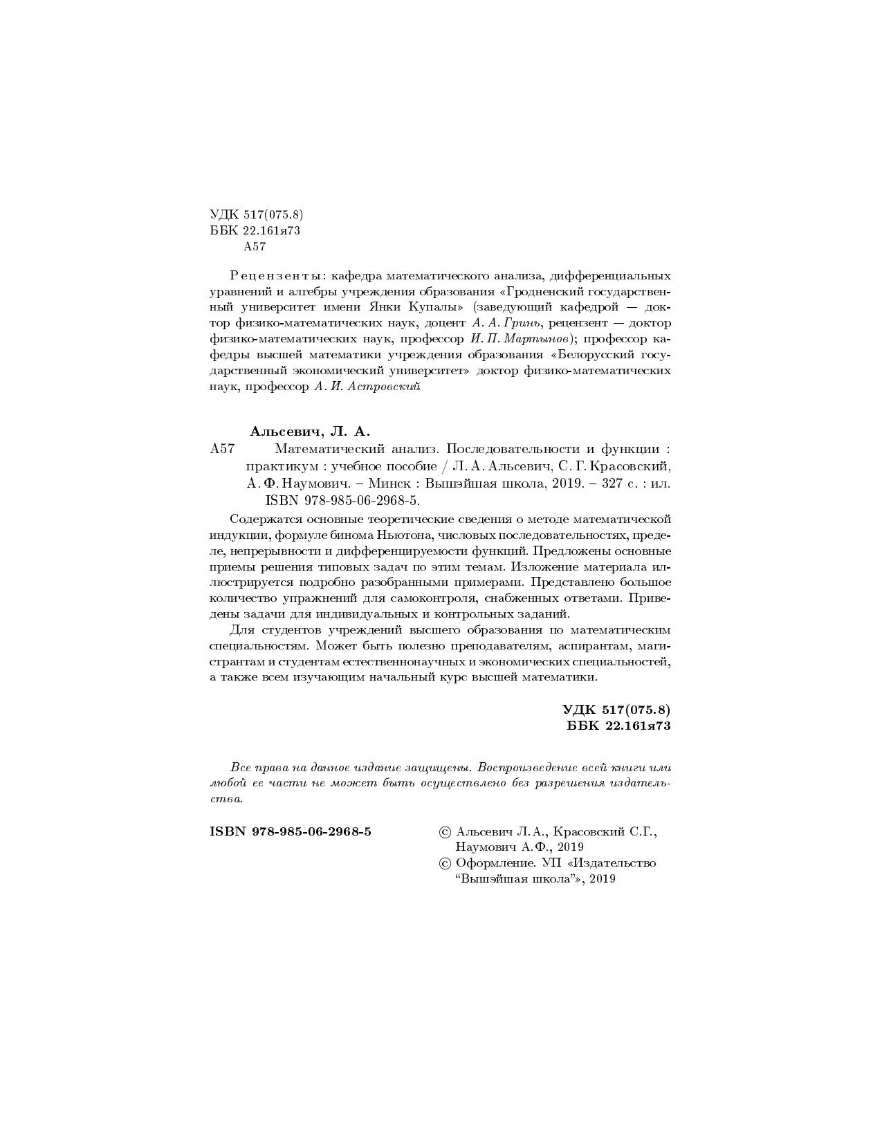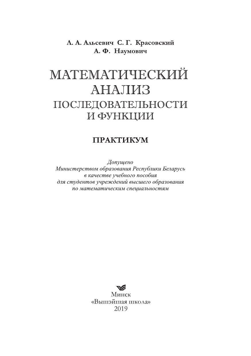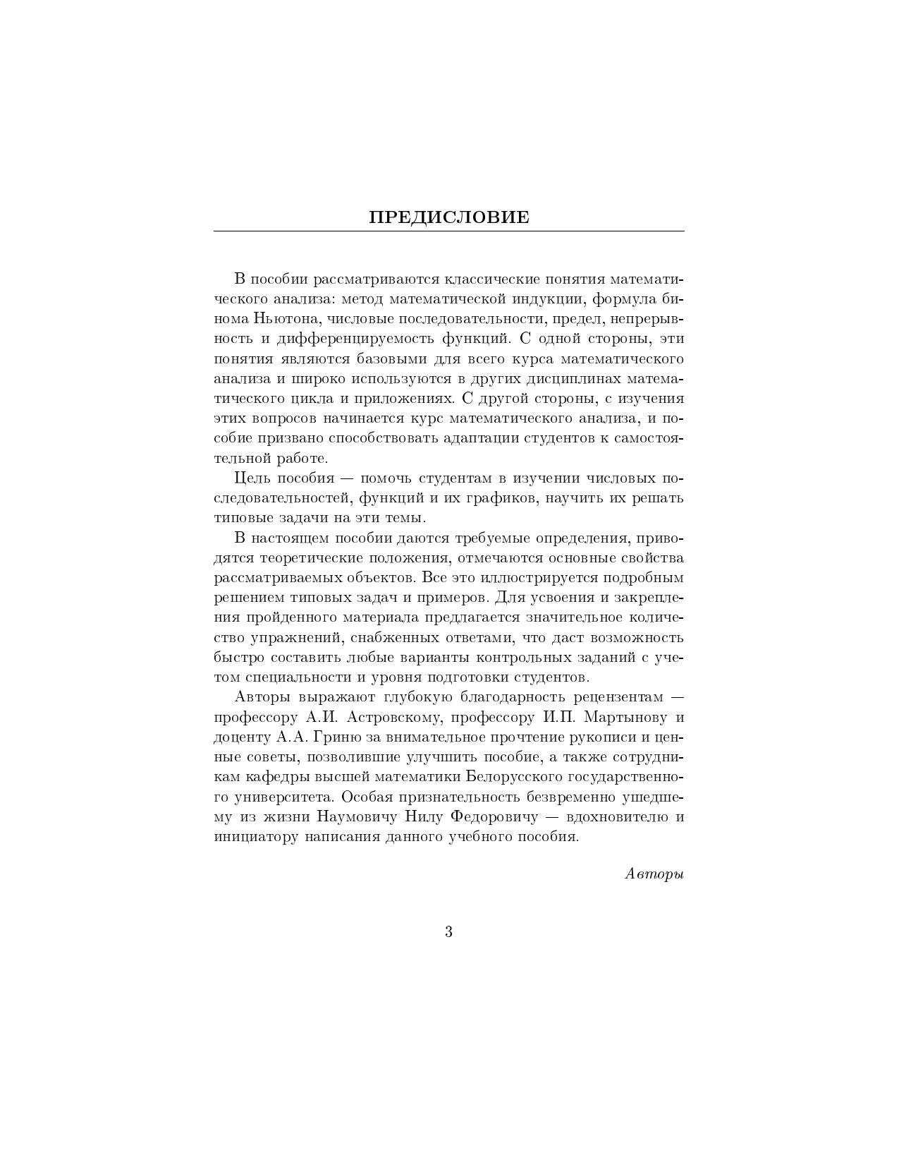 Содержатся основные теоретические сведения о методе математической индукции, формуле бинома Ньютона, числовых последовательностях, пределе, непрерывности и дифференцируемости функций. Предложены основные приемы решения типовых задач по этим темам. Изложение материала иллюстрируется подробно разобранными примерами. Представлено большое количество упражнений для самоконтроля, снабженных ответами. Приведены задачи для индивидуальных и контрольных заданий. Для студентов учреждений высшего образования по математическим специальностям. Может быть полезно преподавателям, аспирантам, магистрантам и студентам естественнонаучных и экономических специальностей, а также всем изучающим начальный курс высшей математики.