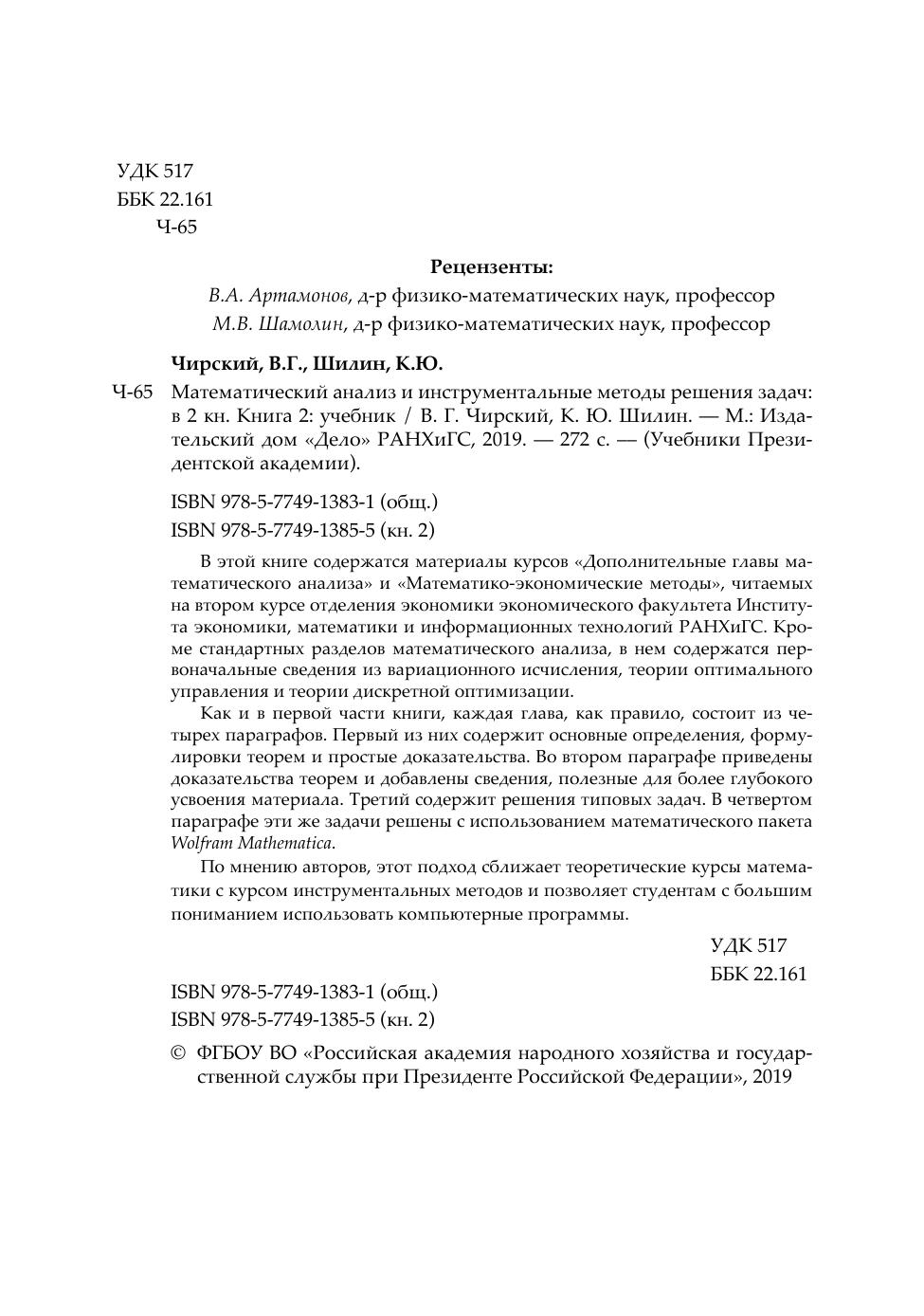 В этой книге содержатся материалы курсов «Дополнительные главы математического анализа» и «Математико-экономические методы», читаемых на втором курсе отделения экономики экономического факультета Института экономики, математики и информационных технологий РАНХиГС. Кроме стандартных разделов математического анализа, в нем содержатся первоначальные сведения из вариационного исчисления, теории оптимального управления и теории дискретной оптимизации. Как и в первой части книги, каждая глава, как правило, состоит из четырех параграфов. Первый из них содержит основные определения, формулировки теорем и простые доказательства. Во втором параграфе приведены доказательства теорем и добавлены сведения, полезные для более глубокого усвоения материала. Третий содержит решения типовых задач. В четвертом параграфе эти же задачи решены с использованием математического пакета Wolfram Mathematica. По мнению авторов, этот подход сближает теоретические курсы математики с курсом инструментальных методов и позволяет студентам с большим пониманием использовать компьютерные программы.