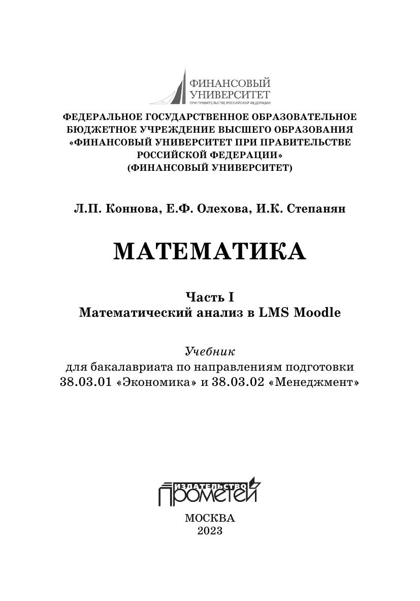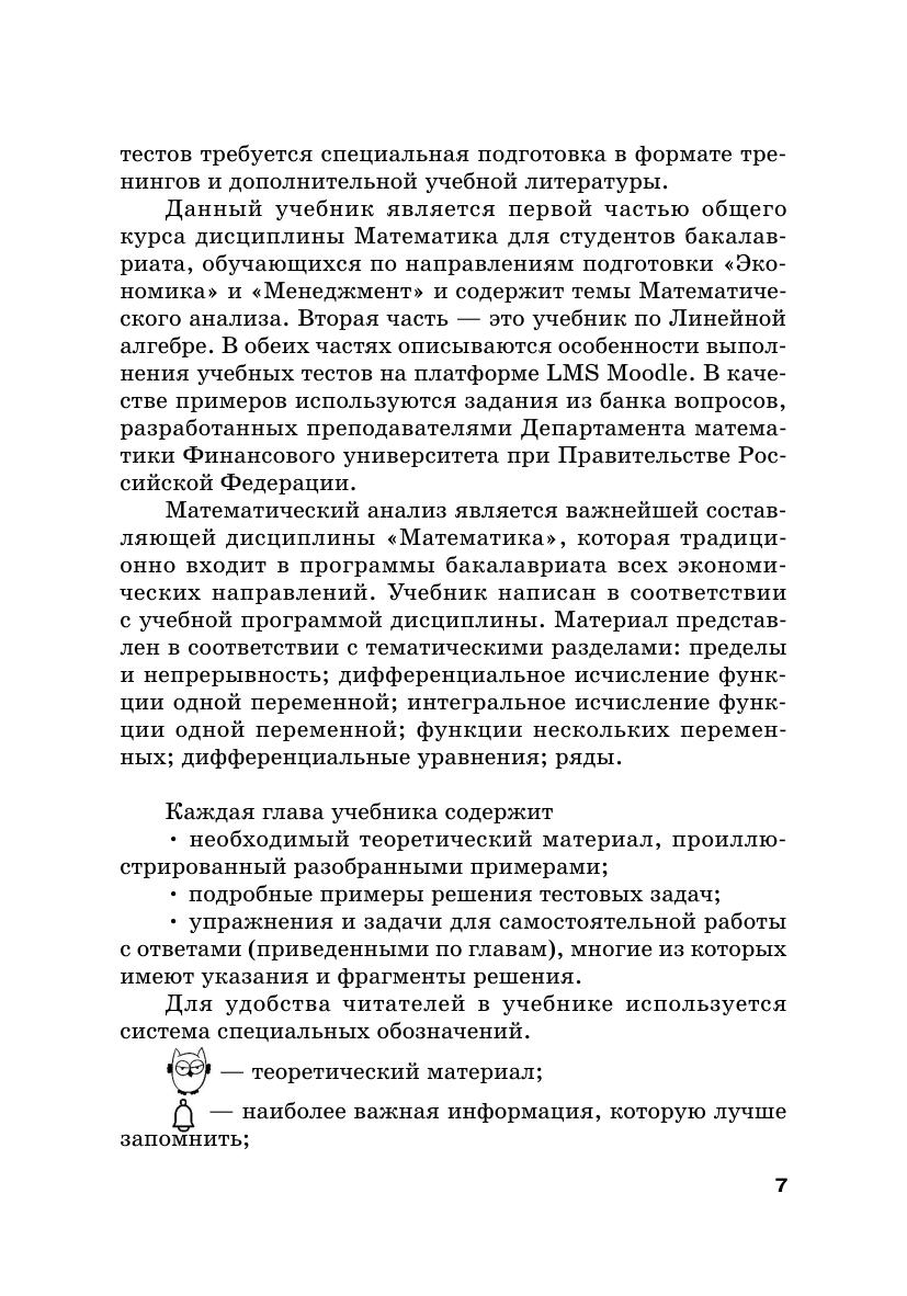 В предлагаемом учебнике представлены основы аппарата математического анализа и его приложений: пределы и непрерывность; дифференциальное исчисление функции одной переменной; интегральное исчисление функции одной переменной; функции нескольких переменных; дифференциальные уравнения; ряды. Учебник логически предшествует изданию «Математика: Часть 2. Линейная алгебра в LMS Moodle». Каждый раздел включает теоретический материал, примеры решения задач и выполнения заданий для самостоятельной работы, сгенерированных системой LMS Moodle. Разобранные примеры снабжены подробными комментариями. Отдельный параграф посвящен особенностям работы в электронной системе при выполнении тестов на LMS Moodle. Соответствует требованиям Федерального государственного образовательного стандарта высшего образования последнего поколения и Образовательным стандартам Финансового университета при Правительстве Российской Федерации по направлениям подготовки «Экономика» и «Менеджмент». Для студентов бакалавриата, обучающихся по направлениям подготовки «Экономика» и «Менеджмент». Может использоваться слушателями курсов повышения квалификации и переподготовки кадров, преподавателями и читателями, изучающими математику и ее цифровые инструменты.