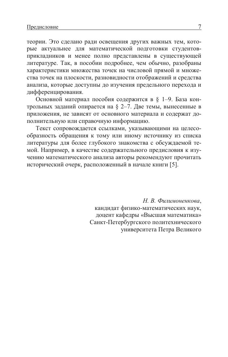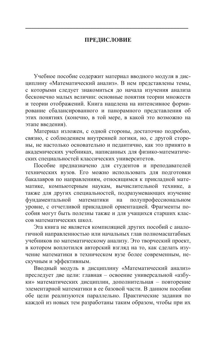 В пособии представлено простое и компактное введение в дисциплину «Математический анализ». Изложены основные понятия теории множеств и теории отображений. Стиль изложения легкий, конспективный, не перегруженный формализацией. Параллельно с освоением текущего материала обеспечивается повторение элементарной математики. Пособие ориентировано на практику, содержит большое количество классических и новых задач. Предназначено для студентов и преподавателей технических вузов. Может быть использовано для подготовки бакалавров по направлениям, относящимся к прикладной математике, компьютерным наукам, вычислительной технике, а также для других специальностей, подразумевающих изучение фундаментальной математики на полупрофессиональном уровне.