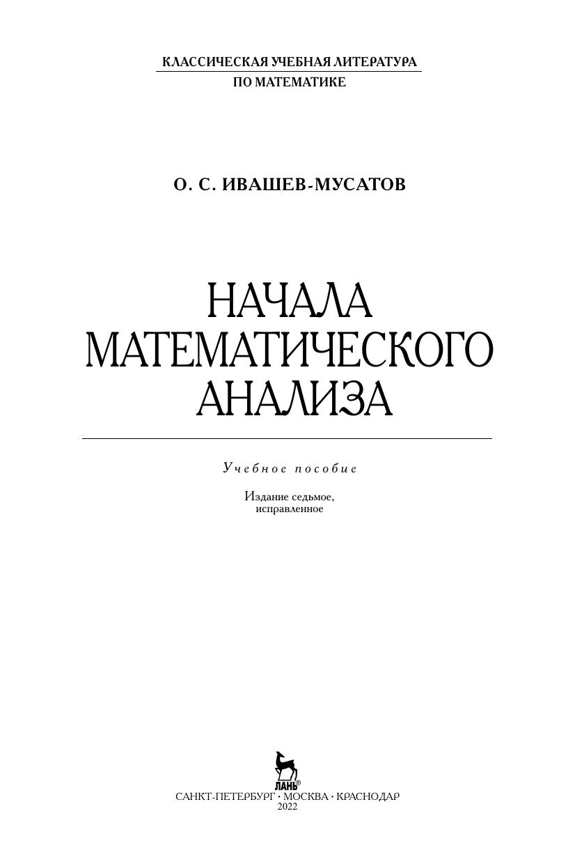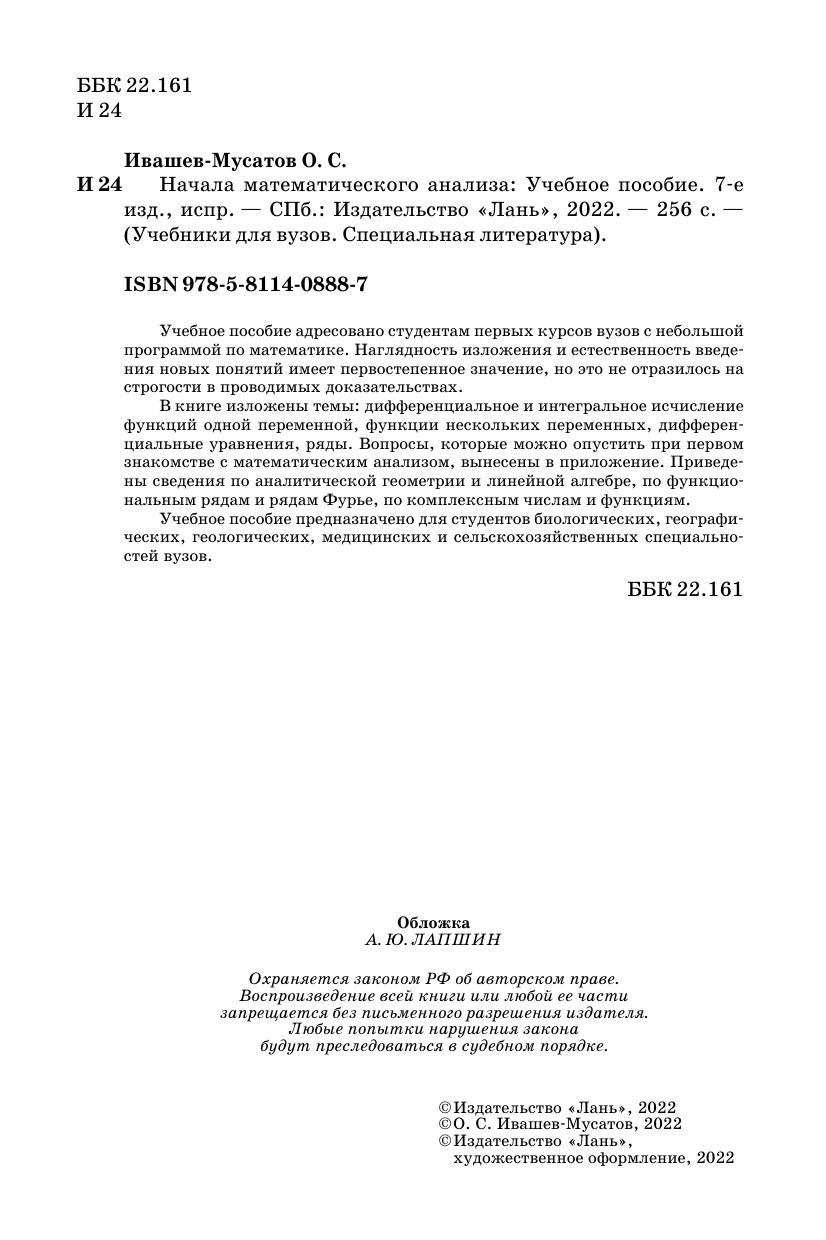 Учебное пособие адресовано студентам первых курсов вузов с небольшой программой по математике. Наглядность изложения и естественность введения новых понятий имеет первостепенное значение, но это не отразилось на строгости в проводимых доказательствах. В книге изложены темы: дифференциальное и интегральное исчисление функций одной переменной, функции нескольких переменных, дифференциальные уравнения, ряды. Вопросы, которые можно опустить при первом знакомстве с математическим анализом, вынесены в приложение. Приведены сведения по аналитической геометрии и линейной алгебре, по функциональным рядам и рядам Фурье, по комплексным числам и функциям. Учебное пособие предназначено для студентов биологических, географических, геологических, медицинских и сельскохозяйственных специальностей вузов.