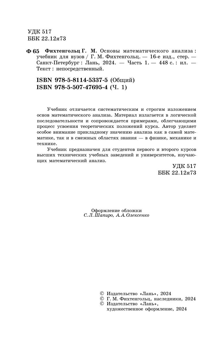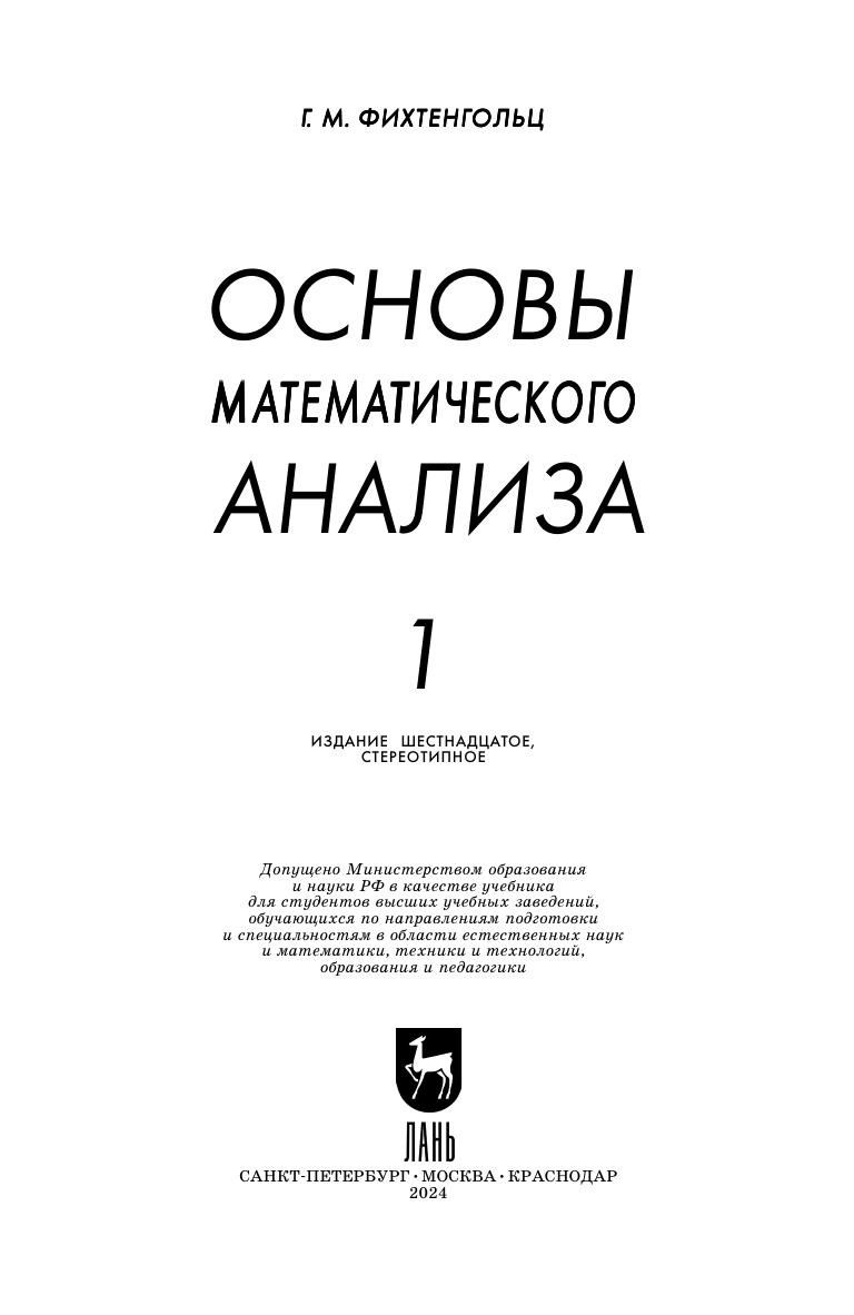 Учебник отличается систематическим и строгим изложением основ математического анализа. Материал излагается в логической последовательности и сопровождается примерами, облегчающими процесс усвоения теоретических положений курса. Автор уделяет особое внимание прикладному значению анализа как в самой математике, так и в смежных областях знания — в физике, механике и технике. Учебник предназначен для студентов первого и второго курсов математических отделений вузов.