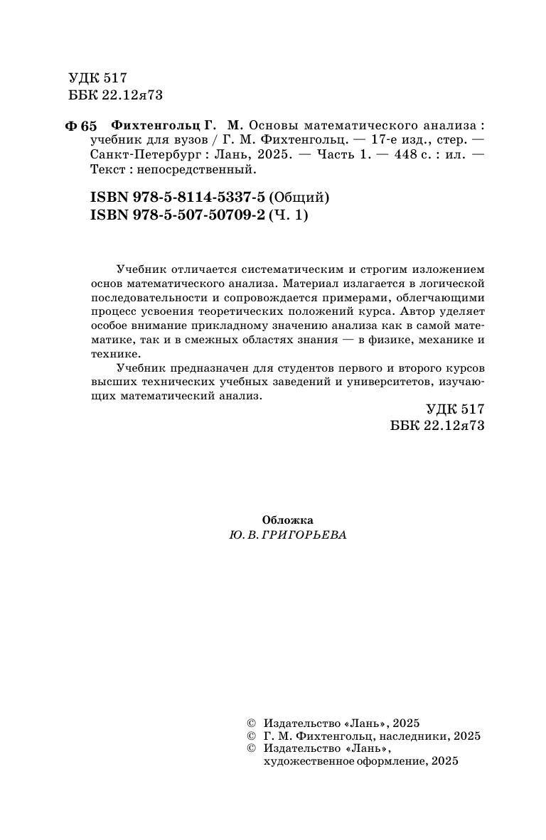 Учебник отличается систематическим и строгим изложением основ математического анализа. Материал излагается в логической последовательности и сопровождается примерами, облегчающими процесс усвоения теоретических положений курса. Автор уделяет особое внимание прикладному значению анализа как в самой математике, так и в смежных областях знания — в физике, механике и технике. Учебник предназначен для студентов первого и второго курсов математических отделений вузов.