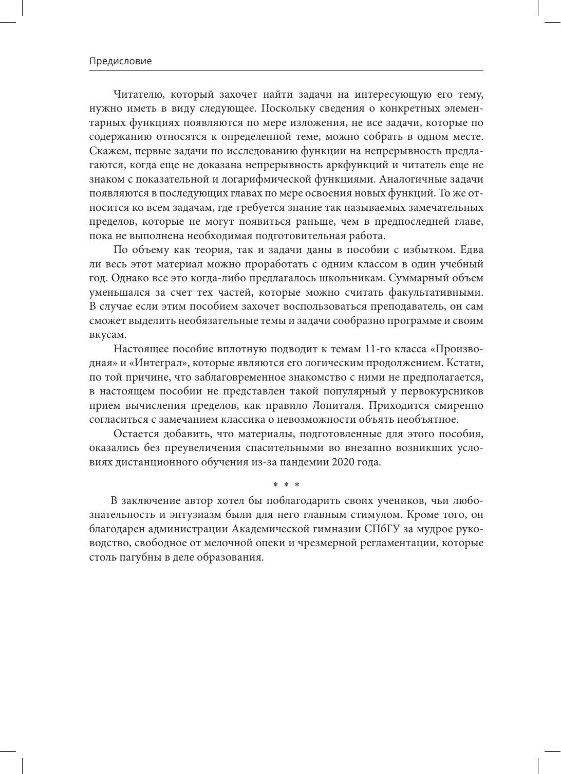 Первое издание подготовлено рамках программы развития УНЦ "Академическая гимназия им. Д.К. Фаддеева". В пособии, основанном на материалах, которые автор использовал на уроках математического анализа в Академической гимназии СПбГУ, излагается теория пределов функций, понятие непрерывности, классические теоремы о непрерывных функциях и их основные свойства. На этой основе вводятся показательная функция вещественной переменной и логарифмическая функция, изучаются их свойства. Приводятся основные приемы вычисления пределов функций, показано их применение для исследования функций и построения их графиков. В каждом тематическом разделе содержатся примеры, то есть, задачи, с подробно разобранными решениями, и упражнения ( задачи без решения). Ко всем упражнениям имеются решения и ответы, помещенные в конце книги. Настоящая книга является продолжением пособия К.Э. Воеводского "Предел последовательности" и подводит читателя к следующим разделам курса математического анализа "Производная" и "Интеграл". Издание разработано для обучающихся в лицеях, гимназиях и профильных классах общеобразовательных школ, которые проходят обучение по направлениям физико-математического и информационно - технологического профилей. Книга также может быть полезна учащимся средних специальных учебных заведений с углубленным изучением математики.