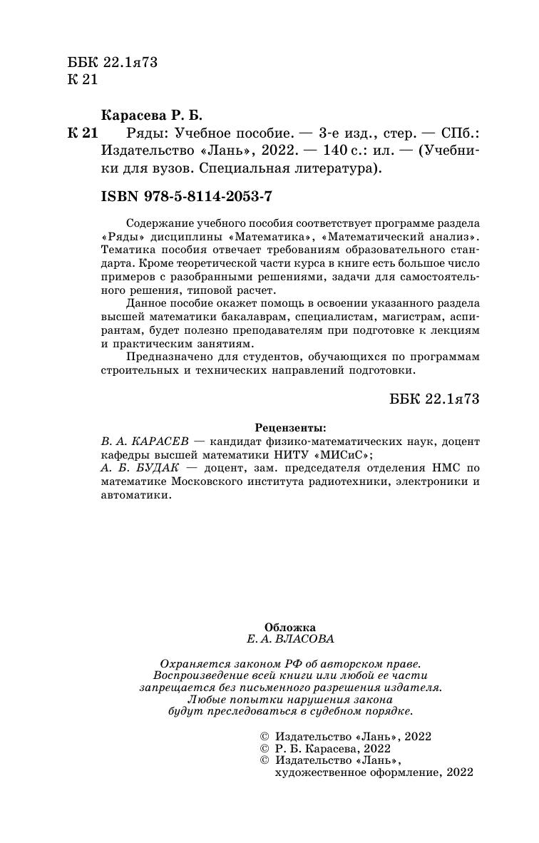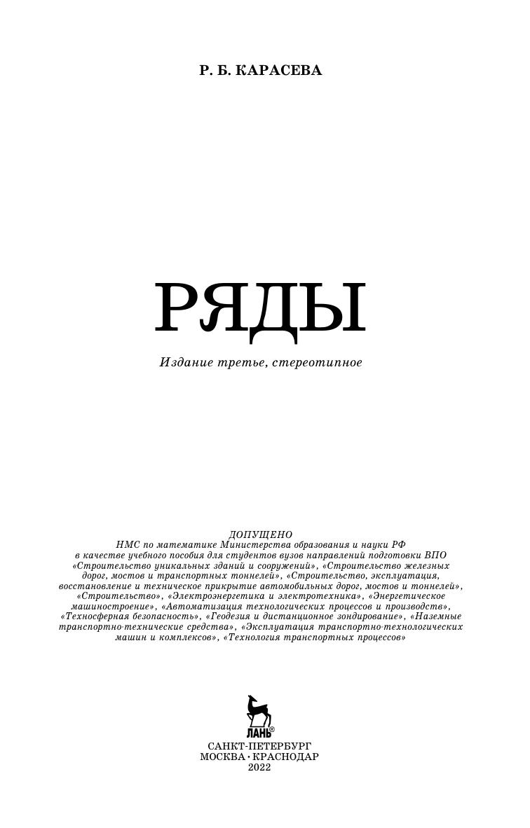 Учебное пособие предназначено для студентов, обучающимся по программам строительных и технических направлений подготовки. Содержание соответствует программе раздела «Ряды» дисциплины «Математика», «Математический анализ». Тематика пособия отвечает требованиям образовательного стандарта. Кроме теоретической части курса в книге есть большое число примеров с разобранными решениями, задачи для самостоятельного решения, типовой расчет. Данное пособие окажет помощь в освоении указанного раздела высшей математики бакалаврам, специалистам, магистрам, аспирантам, будет полезно преподавателям при подготовке к лекциям и практическим занятиям.