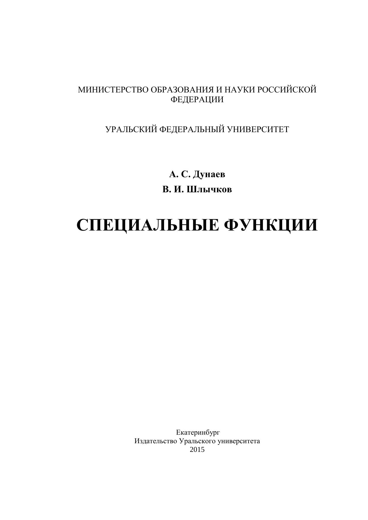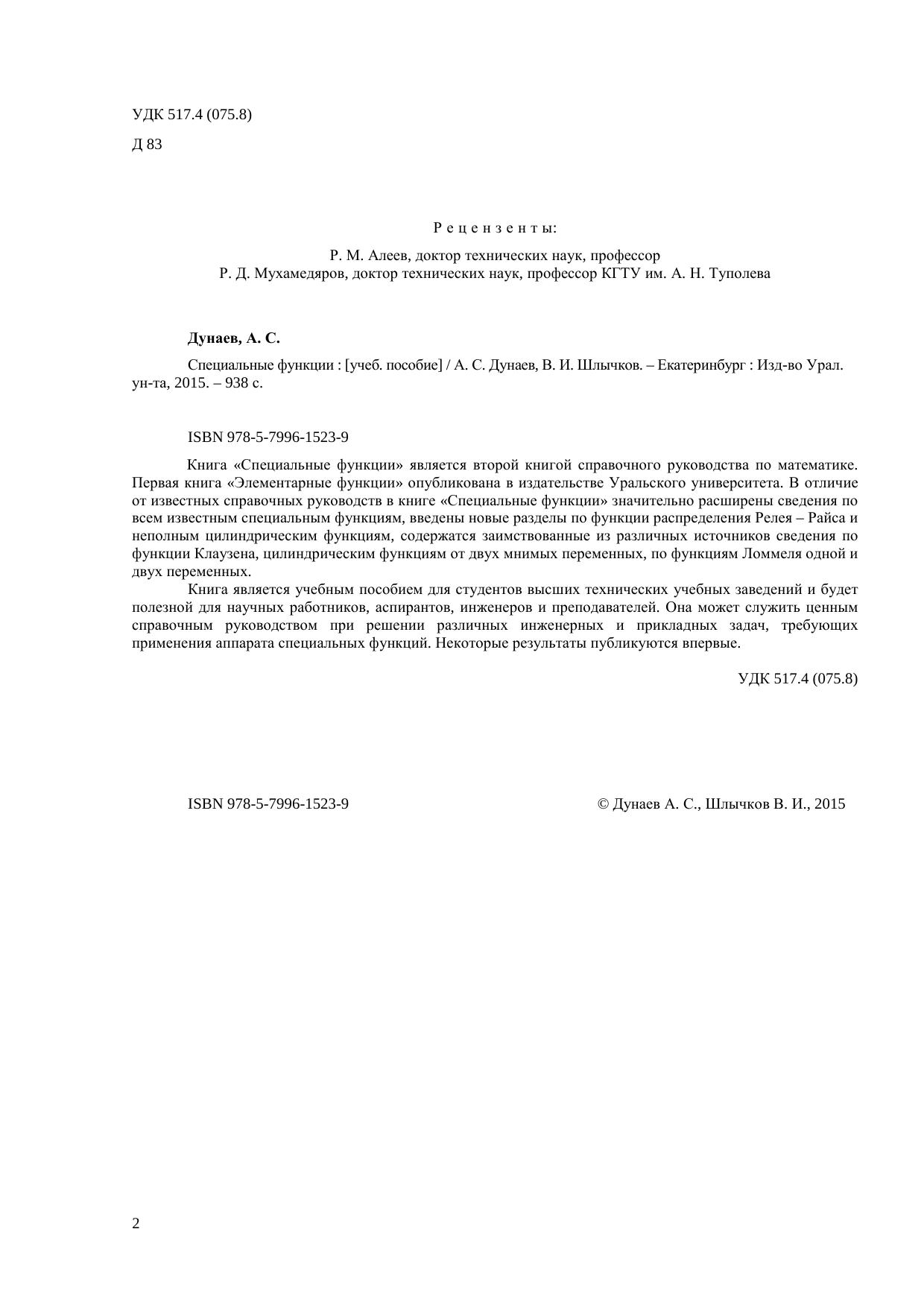 Книга «Специальные функции» является второй книгой справочного руководства по математике. Первая книга «Элементарные функции» опубликована в издательстве Уральского университета. В отличие от известных справочных руководств в книге «Специальные функции» значительно расширены сведения по всем известным специальным функциям, введены новые разделы по функции распределения Релея – Райса и неполным цилиндрическим функциям, содержатся заимствованные из различных источников сведения по функции Клаузена, цилиндрическим функциям от двух мнимых переменных, по функциям Ломмеля одной и двух переменных. Книга является учебным пособием для студентов высших технических учебных заведений и будет полезной для научных работников, аспирантов, инженеров и преподавателей. Она может служить ценным справочным руководством при решении различных инженерных и прикладных задач, требующих применения аппарата специальных функций. Некоторые результаты публикуются впервые.