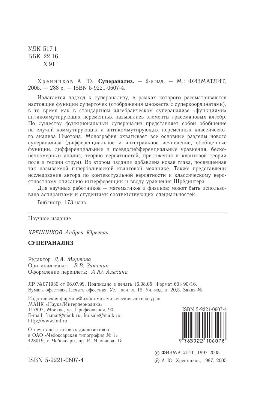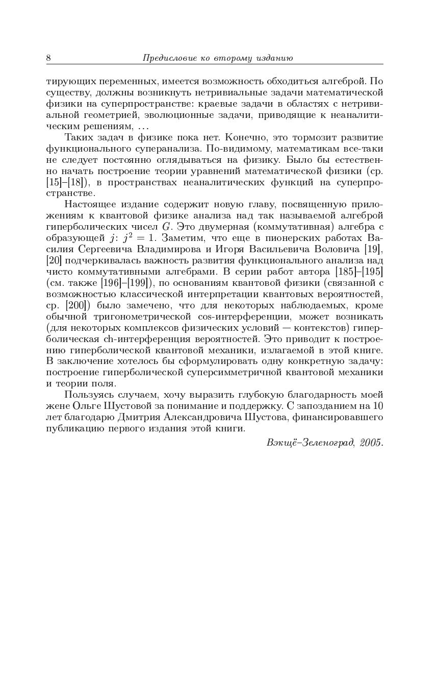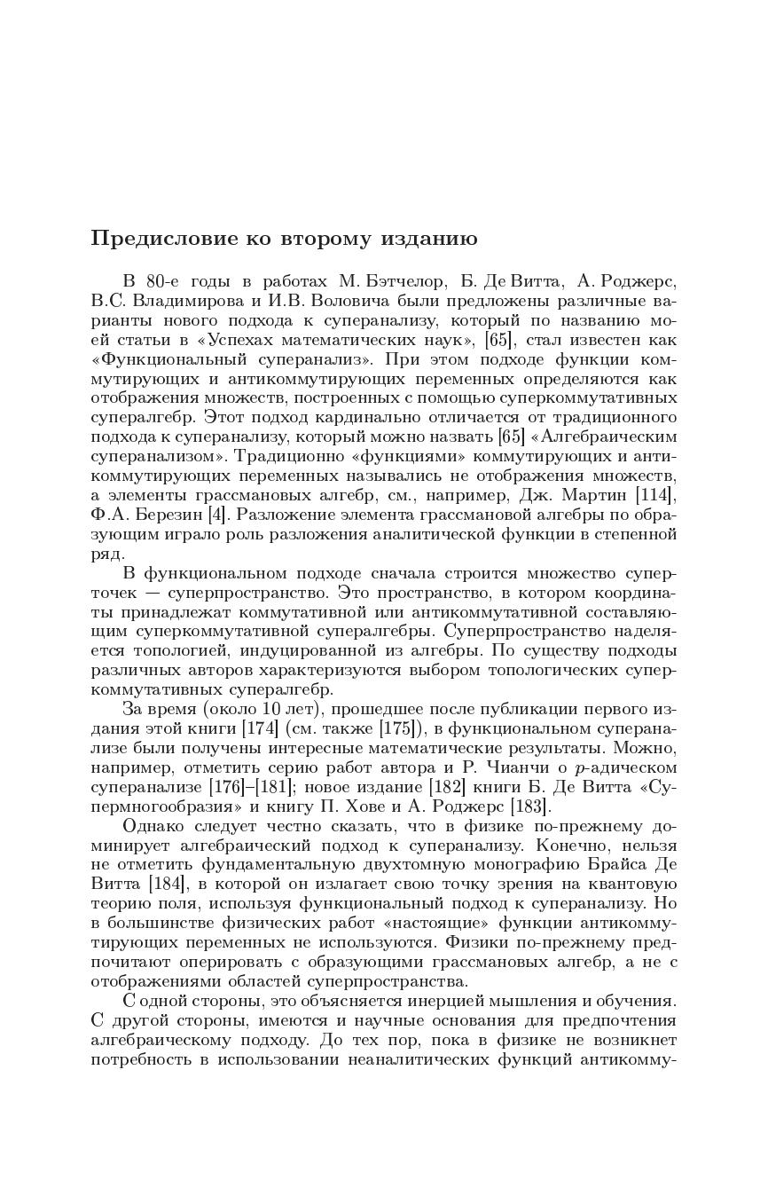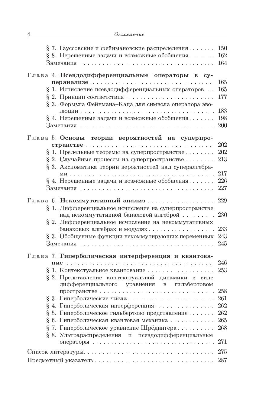 Излагается подход к суперанализу, в рамках которого рассматриваются настоящие функции суперточек (отображения множеств с суперкоординатами), в то время как в стандартном алгебраическом суперанализе «функциями» антикоммутирующих переменных назывались элементы грассмановых алгебр. По существу функциональный суперанализ представляет собой обобщение на случай коммутирующих и антикоммутирующих переменных классического анализа Ньютона. Монография охватывает все основные разделы нового суперанализа (дифференциальное и интегральное исчисление, обобщенные функции, дифференциальные и псевдодифференциальные уравнения, бесконечномерный анализ, теорию вероятностей, приложения к квантовой теории поля и теории струн). Во втором издании добавлена новая глава, посвященная так называемой гиперболической квантовой механике. Также представлены исследования автора по контекстуальной вероятности и классическому вероятностномуо писанию интерференции и вводу уравнения Шрёдингера. Для научных работников — математиков и физиков может быть использована аспирантами и студентами соответствующих специальностей.