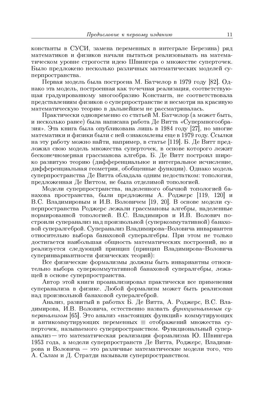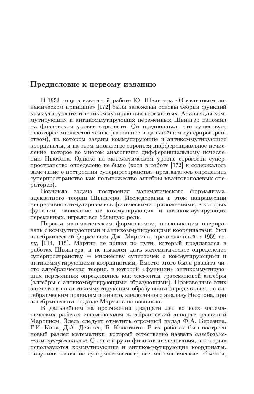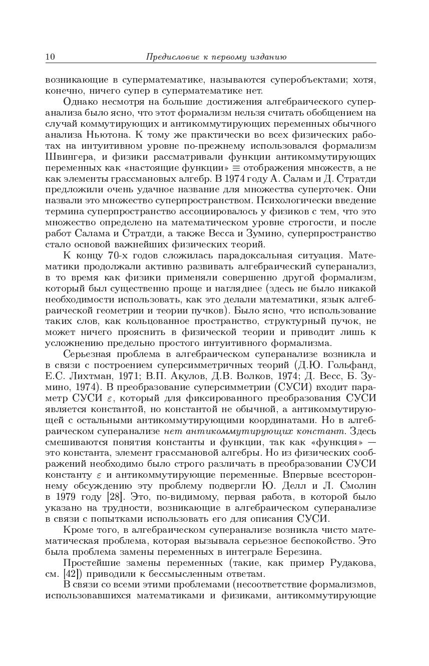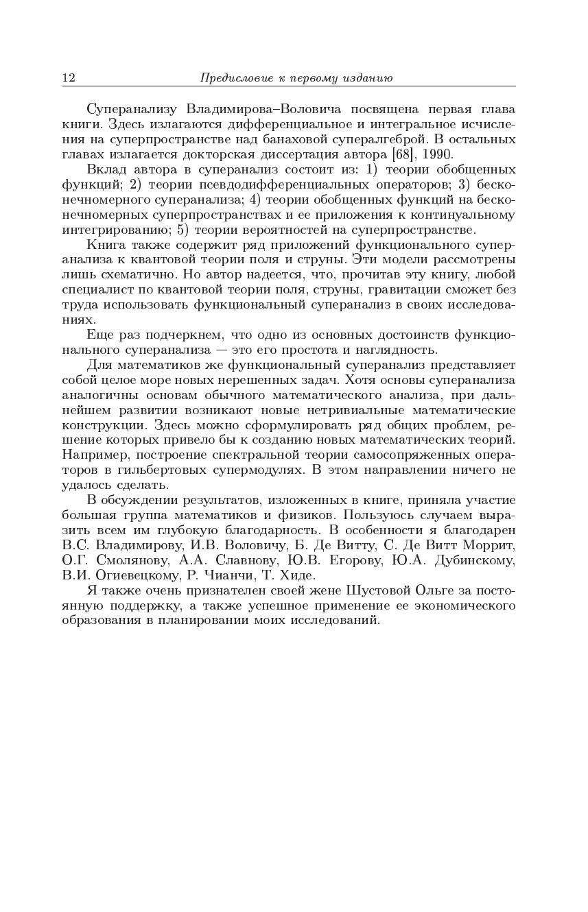 Излагается подход к суперанализу, в рамках которого рассматриваются настоящие функции суперточек (отображения множеств с суперкоординатами), в то время как в стандартном алгебраическом суперанализе «функциями» антикоммутирующих переменных назывались элементы грассмановых алгебр. По существу функциональный суперанализ представляет собой обобщение на случай коммутирующих и антикоммутирующих переменных классического анализа Ньютона. Монография охватывает все основные разделы нового суперанализа (дифференциальное и интегральное исчисление, обобщенные функции, дифференциальные и псевдодифференциальные уравнения, бесконечномерный анализ, теорию вероятностей, приложения к квантовой теории поля и теории струн). Во втором издании добавлена новая глава, посвященная так называемой гиперболической квантовой механике. Также представлены исследования автора по контекстуальной вероятности и классическому вероятностномуо писанию интерференции и вводу уравнения Шрёдингера. Для научных работников — математиков и физиков может быть использована аспирантами и студентами соответствующих специальностей.