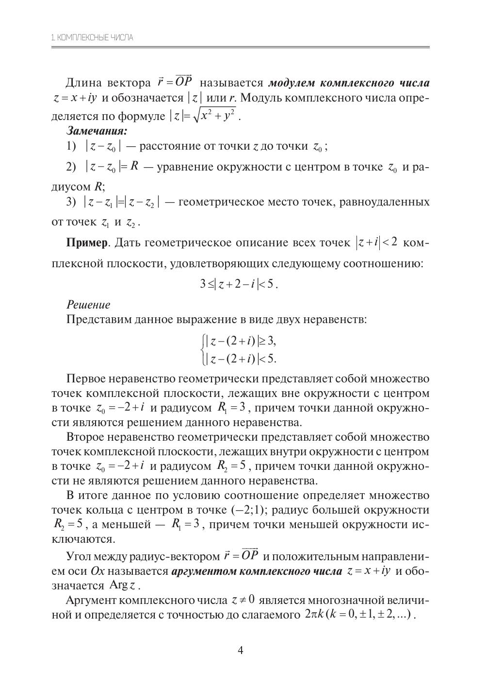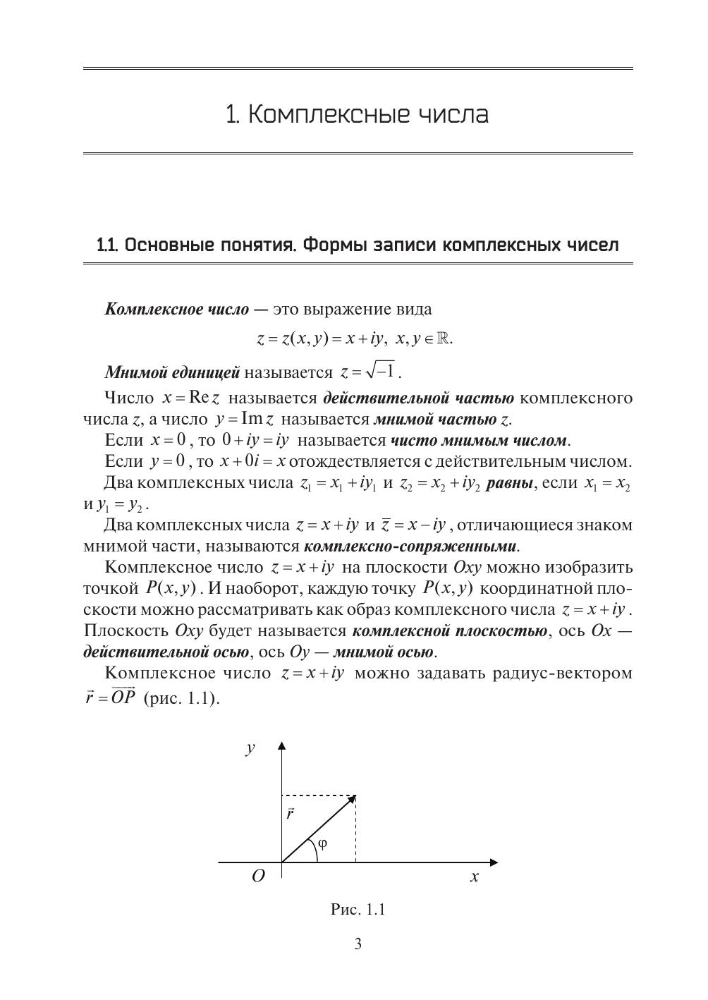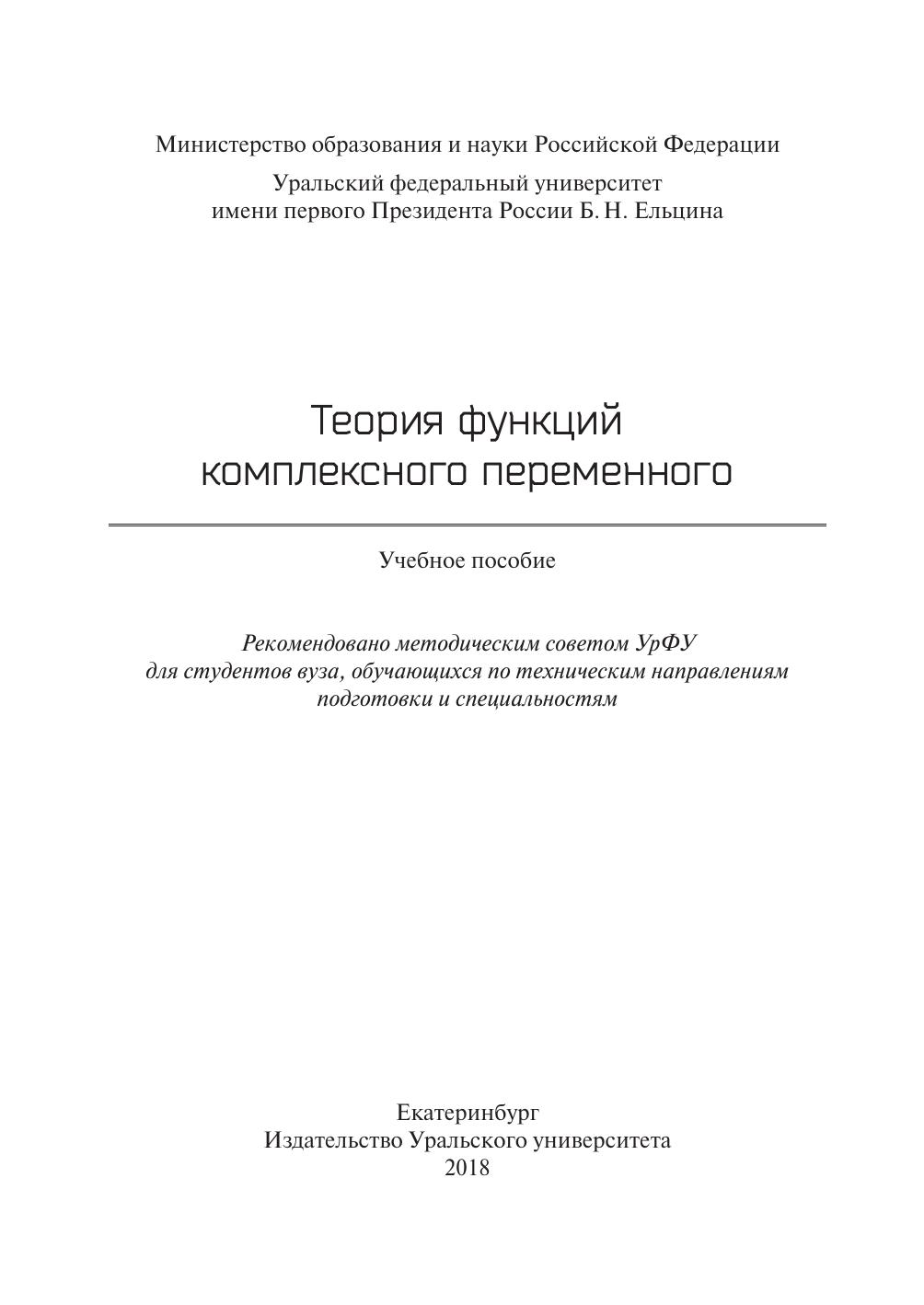 В учебном пособии представлены основные понятия и теоремы теории функций комплексного переменного. Пособие включает следующие темы: основные элементарные функции и их свойства; предел, непрерывность, дифференцирование и интегрирование функций комплексного переменного; ряды в комплексной области; теория вычетов; конформные отображения. Рассмотрены решения типовых задач. Приведены задачи для самостоятельного решения и задания к расчетной работе. Предназначается для студентов, обучающихся по техническим направлениям подготовки и специальностям.