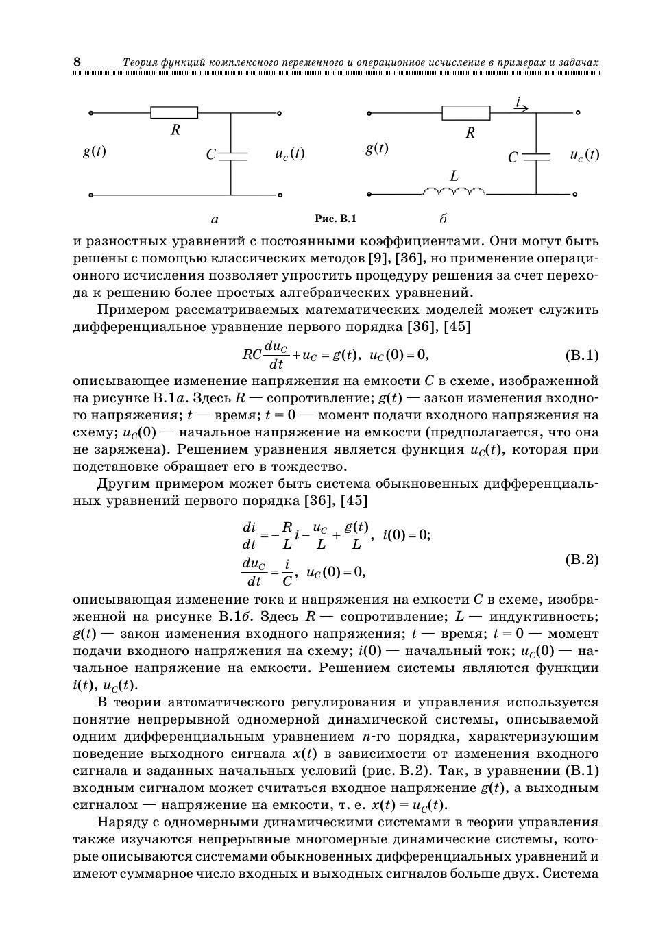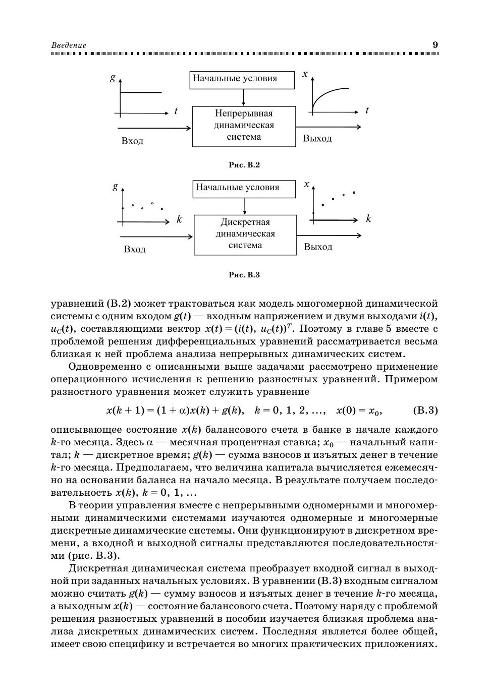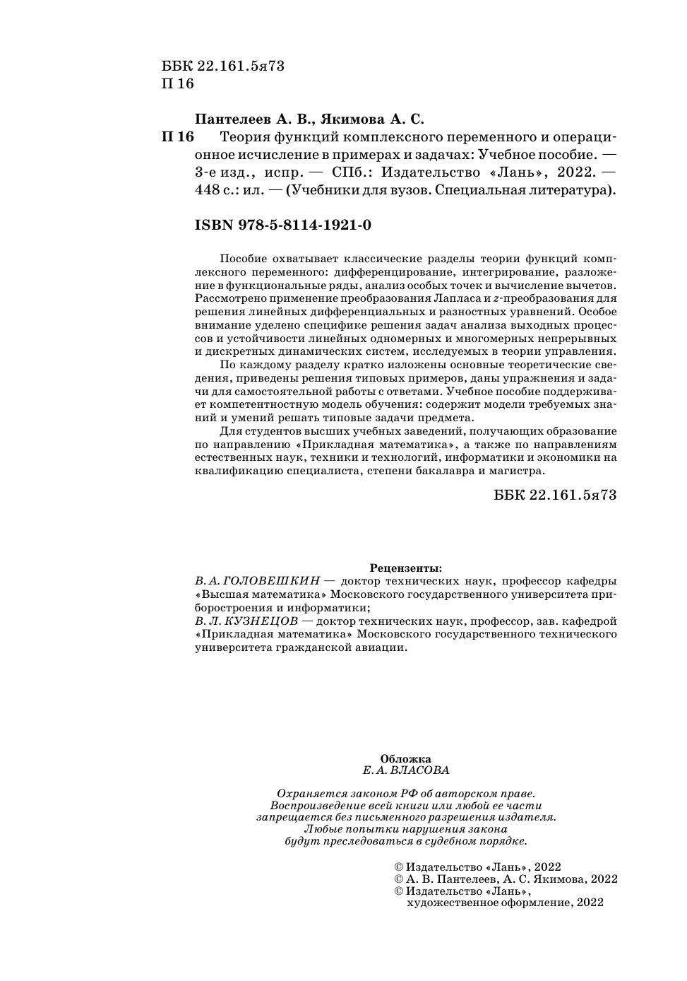 Пособие охватывает классические разделы теории функций комплексного пере-менного: дифференцирование, интегрирование, разложение в функциональные ряды, анализ особых точек и вычисление вычетов. Рассмотрено применение преобразования Лапласа и z-преобразования для решения линейных дифференциальных и разностных уравнений. Особое внимание уделено специфике решения задач анализа выходных процессов и устойчивости линейных одномерных и многомерных непрерывных и дискретных динамических систем, исследуемых в теории управления. По каждому разделу кратко изложены основные теоретические сведения, приведены решения типовых примеров, даны упражнения и задачи для самостоятельной работы с ответами. Учебное пособие поддерживает компетентностную модель обучения: содержит модели требуемых знаний и умений решать типовые задачи предмета. Для студентов высших учебных заведений, получающих образование по направлению (специальности) «Прикладная математика», а также по направлениям (специальностям) естественных наук, техники и технологий, информатики и экономики на квали-фикацию специалиста, степени бакалавра и магистра.