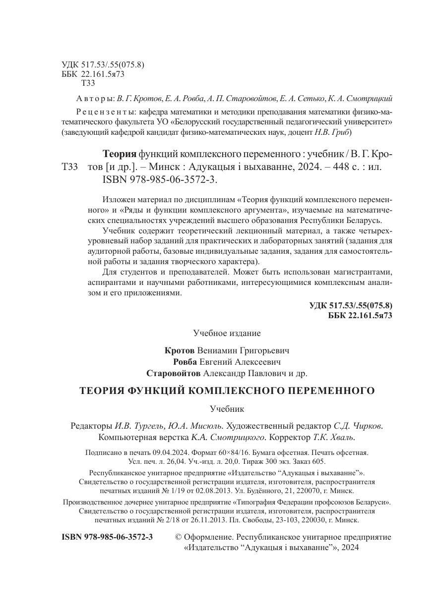 Изложен материал по дисциплинам «Теория функций комплексного переменного» и «Ряды и функции комплексного аргумента», изучаемые на математических специальностях учреждений высшего образования Республики Беларусь. Учебник содержит теоретический лекционный материал, а также четырехуровневый набор заданий для практических и лабораторных занятий (задания для аудиторной работы, базовые индивидуальные задания, задания для самостоятельной работы и задания творческого характера). Для студентов и преподавателей. Может быть использован магистрантами, аспирантами и научными работниками, интересующимися комплексным анализом и его приложениями.