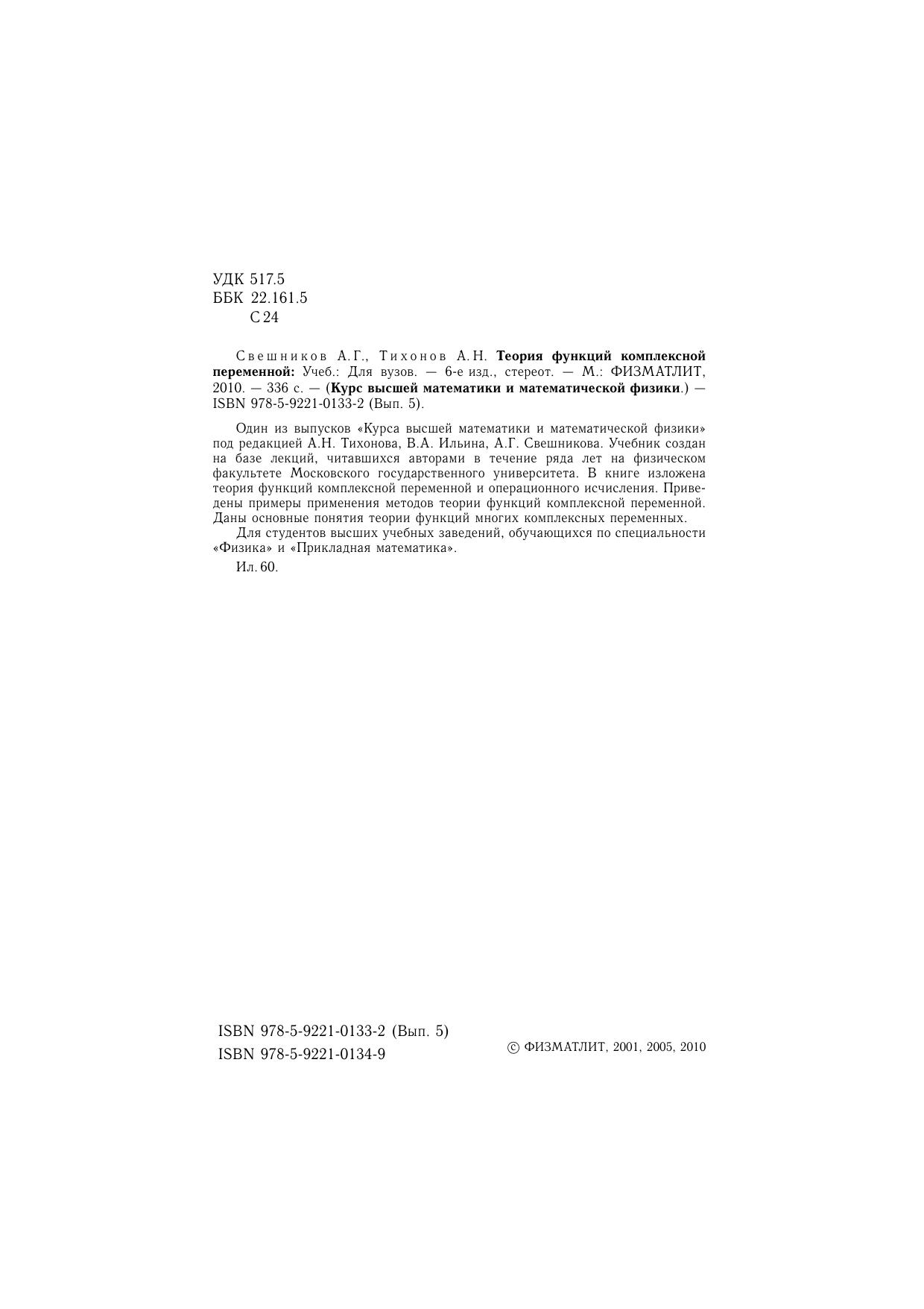 Один из выпусков "Курса высшей математики и математической физики" под редакцией А.Н. Тихонова, В.А. Ильина, А.Г. Свешникова. Учебник создан на базе лекций, читавшихся авторами в течение ряда лет на физическом факультете Московского государственного университета. В книге изложена теория функций комплексной переменной и операционного исчисления. Приведены примеры применения методов теории функций комплексной переменной. Даны основные понятия теории функций многих комплексных переменных. Для студентов высших учебных заведений, обучающихся по специальности "Физика" и "Прикладная математика".