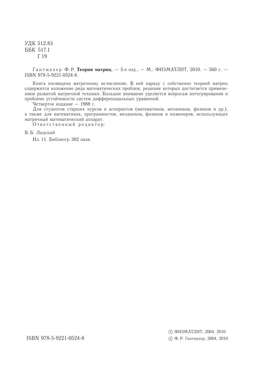 Книга посвящена матричному исчислению. В ней наряду с собственно теорией матриц содержится изложение ряда математических проблем, решение которых достигается применением развитой матричной техники. Большое внимание уделяется вопросам интегрирования и проблеме устойчивости систем дифференциальных уравнений. Четвертое издание — 1988 г.Для студентов старших курсов и аспирантов (математиков, механиков, физиков и др.),а также для математиков, программистов, механиков, физиков и инженеров, использующихматричный математический аппарат.