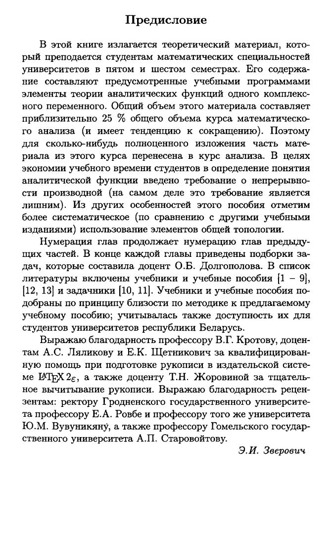 Излагается теория аналитических функций комплексного переменного. Содержатся первоначальные сведения об аналитических функциях и конформных отображениях, дробнолинейные и другие элементарные функции, интегральные теоремы, теория вычетов, аналитическое продолжение, элементы теории целых функций.