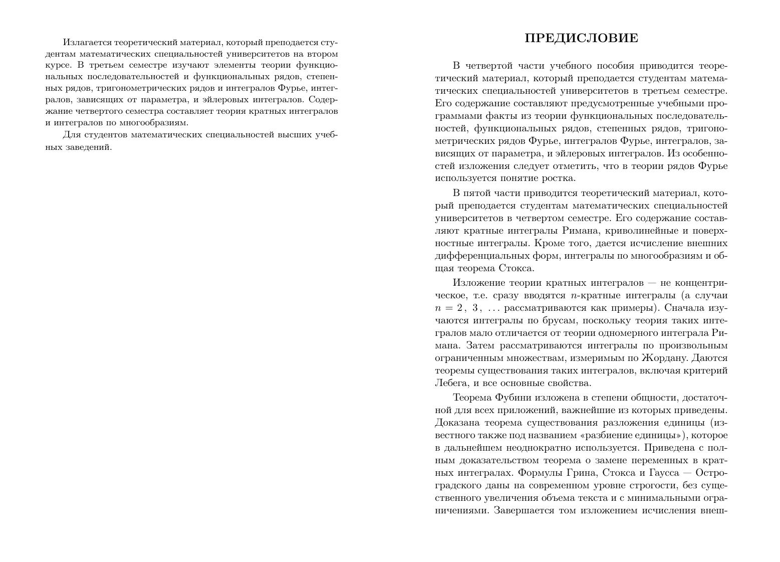 Излагается теоретический материал, который преподается студентам математических специальностей университетов на втором курсе. В третьем семестре изучают элементы теории функциональных рядов, степенных рядов, тригонометрических рядов и интегралов Фурье, интегралов, зависящих от параметра, и эйлеровых интегралов. Содержание четвертого семестра составляет теория кратных интегралов и интегралов по многообразиям.