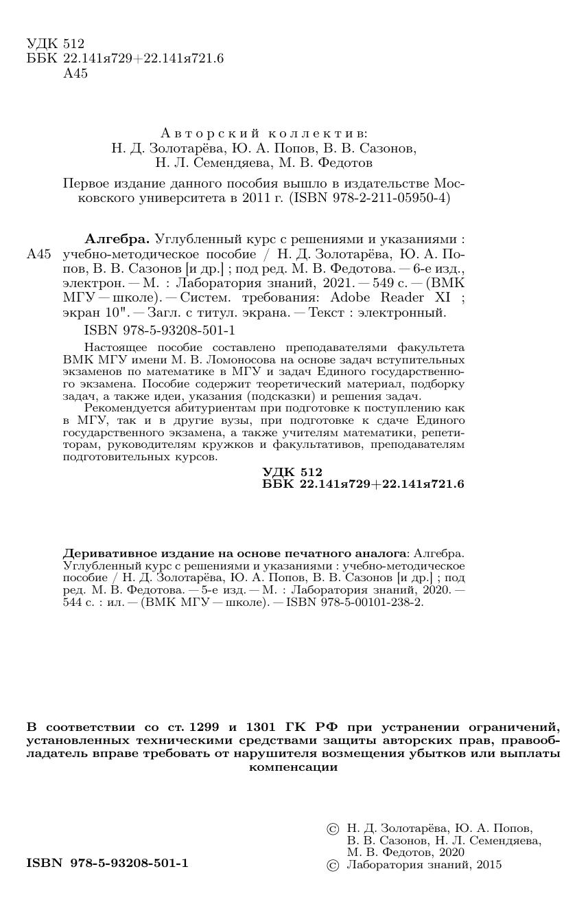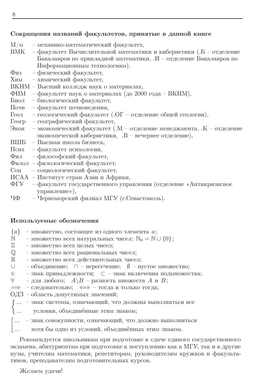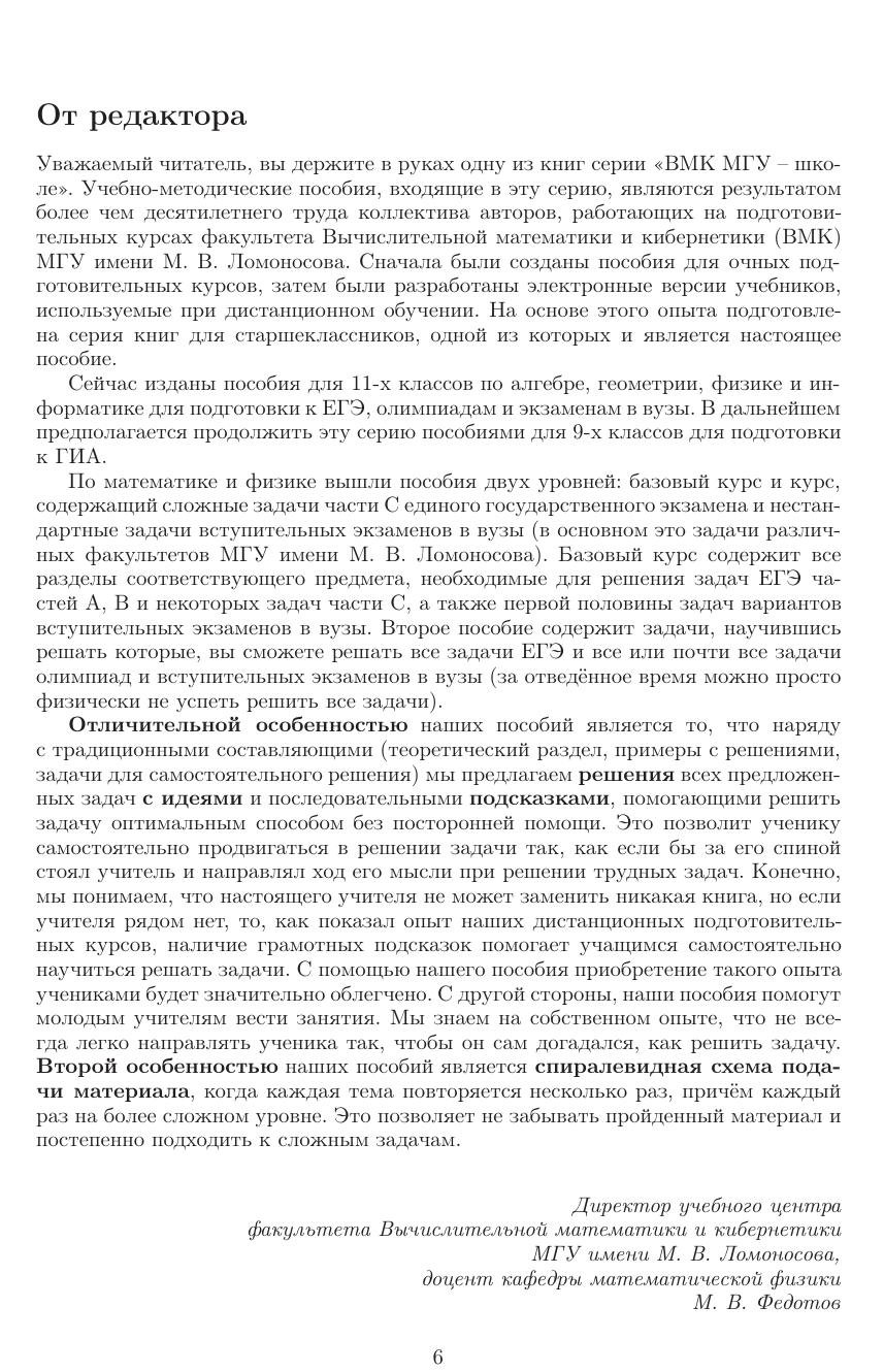Настоящее пособие составлено преподавателями факультета ВМК МГУ имени М. В. Ломоносова на основе задач вступительных экзаменов по математике в МГУ и задач Единого государственного экзамена. Пособие содержит теоретический материал, подборку задач, а также идеи, указания (подсказки) и решения задач. Рекомендуется абитуриентам при подготовке к поступлению как в МГУ, так и в другие вузы, при подготовке к сдаче Единого государственного экзамена, а также учителям математики, репетиторам, руководителям кружков и факультативов, преподавателям подготовительных курсов.