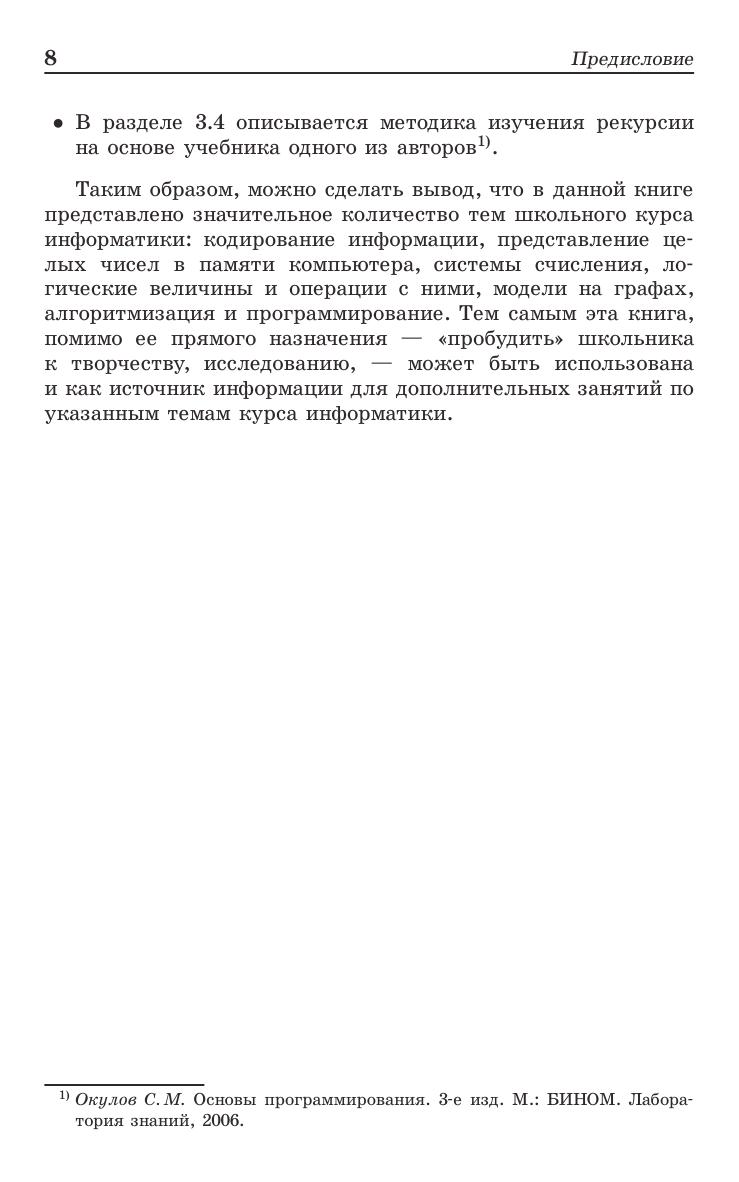 Книга предназначена для школьников и преподавателей информатики, но также будет интересна студентам, профессионально занимающимся информатикой. Она может быть использована как в обычных школах при проведении факультативных занятий, так и в образовательных учреждениях с углубленным изучением информатики и математики.