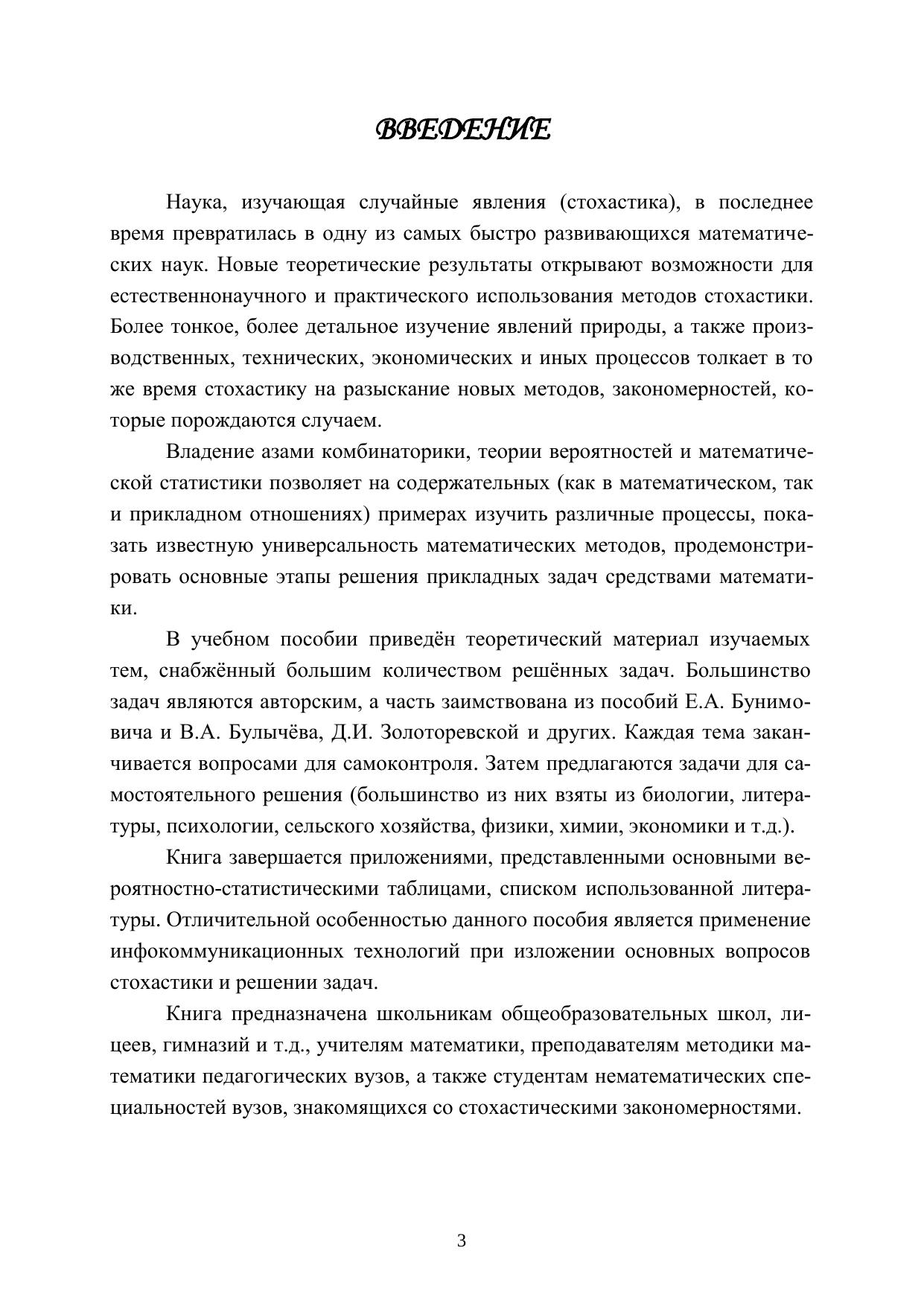 Предложенный в пособии материал подкрепляет школьный курс математики. Отличительной особенностью пособия является применение инфокоммуникационных технологий при изложении основных вопросов стохастики и решении задач. Книга предназначена школьникам общеобразовательных школ, лицеев, гимназий и т.д., учителям математики, преподавателям методики математики педагогических вузов, а также студентам нематематических специальностей вузов, знакомящихся со стохастическими закономерностями.
