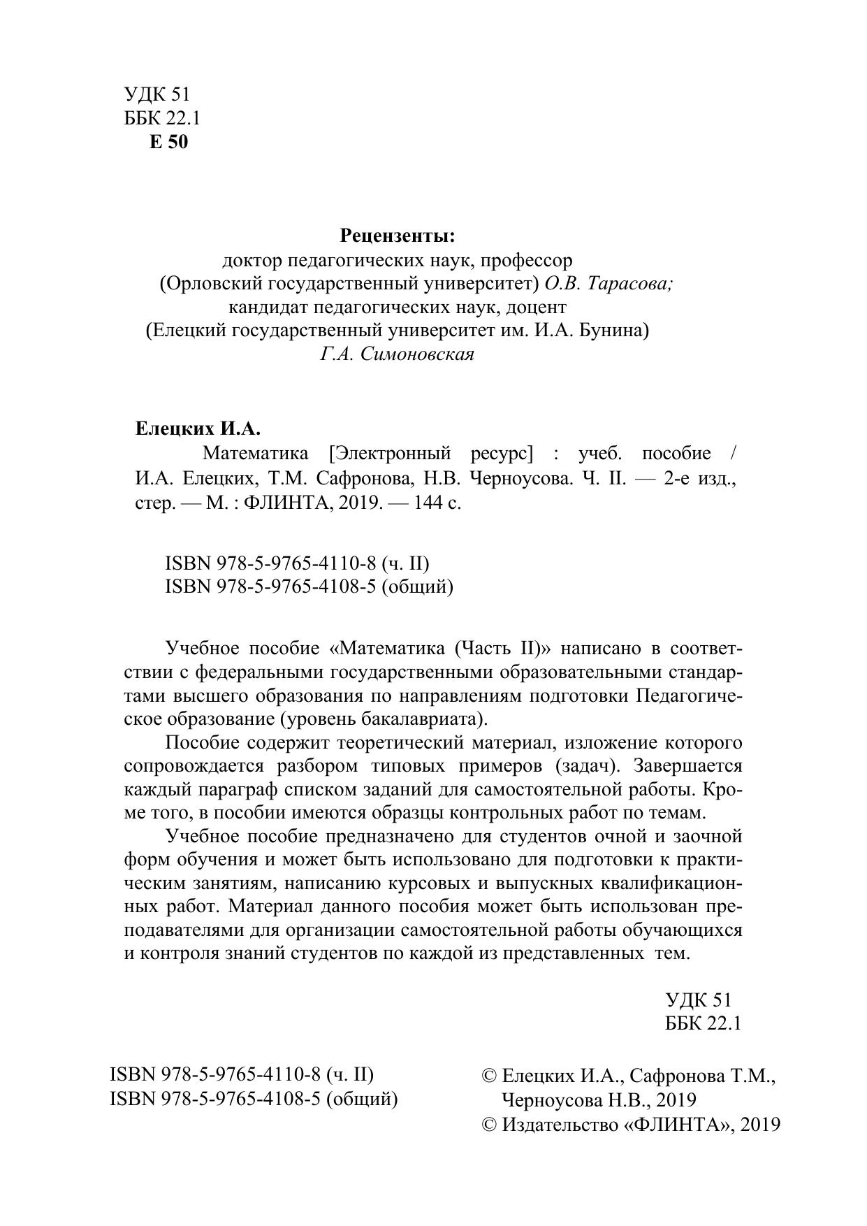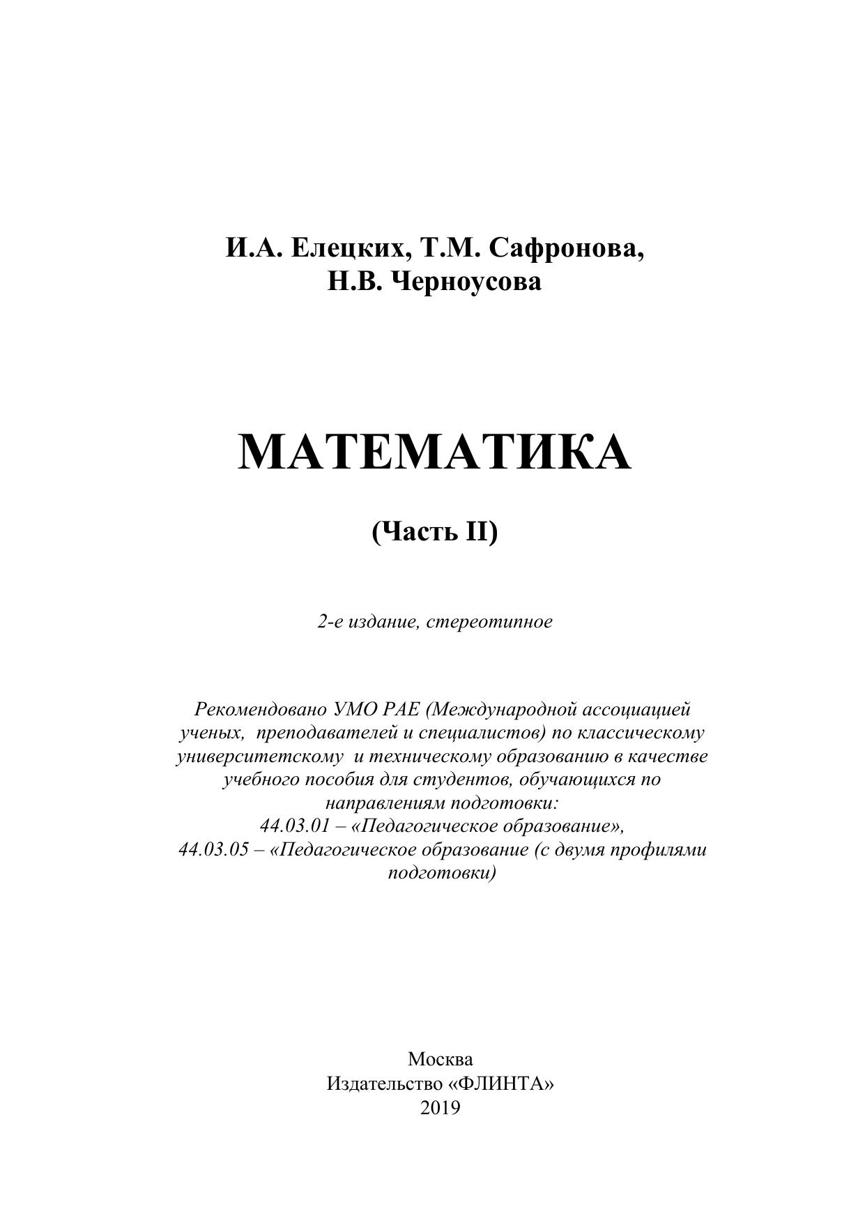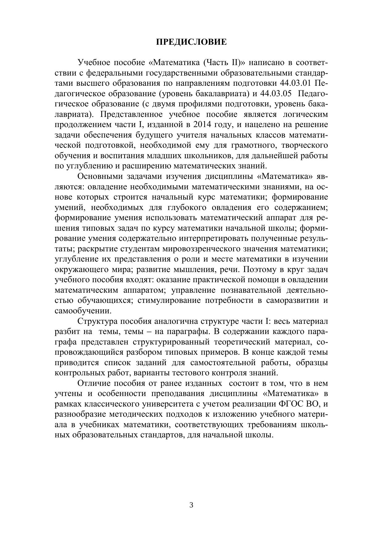Учебное пособие «Математика (Часть II)» написано в соответ-ствии с федеральными государственными образовательными стандартами высшего образования по направлениям подготовки Педагогическое образование (уровень бакалавриата).