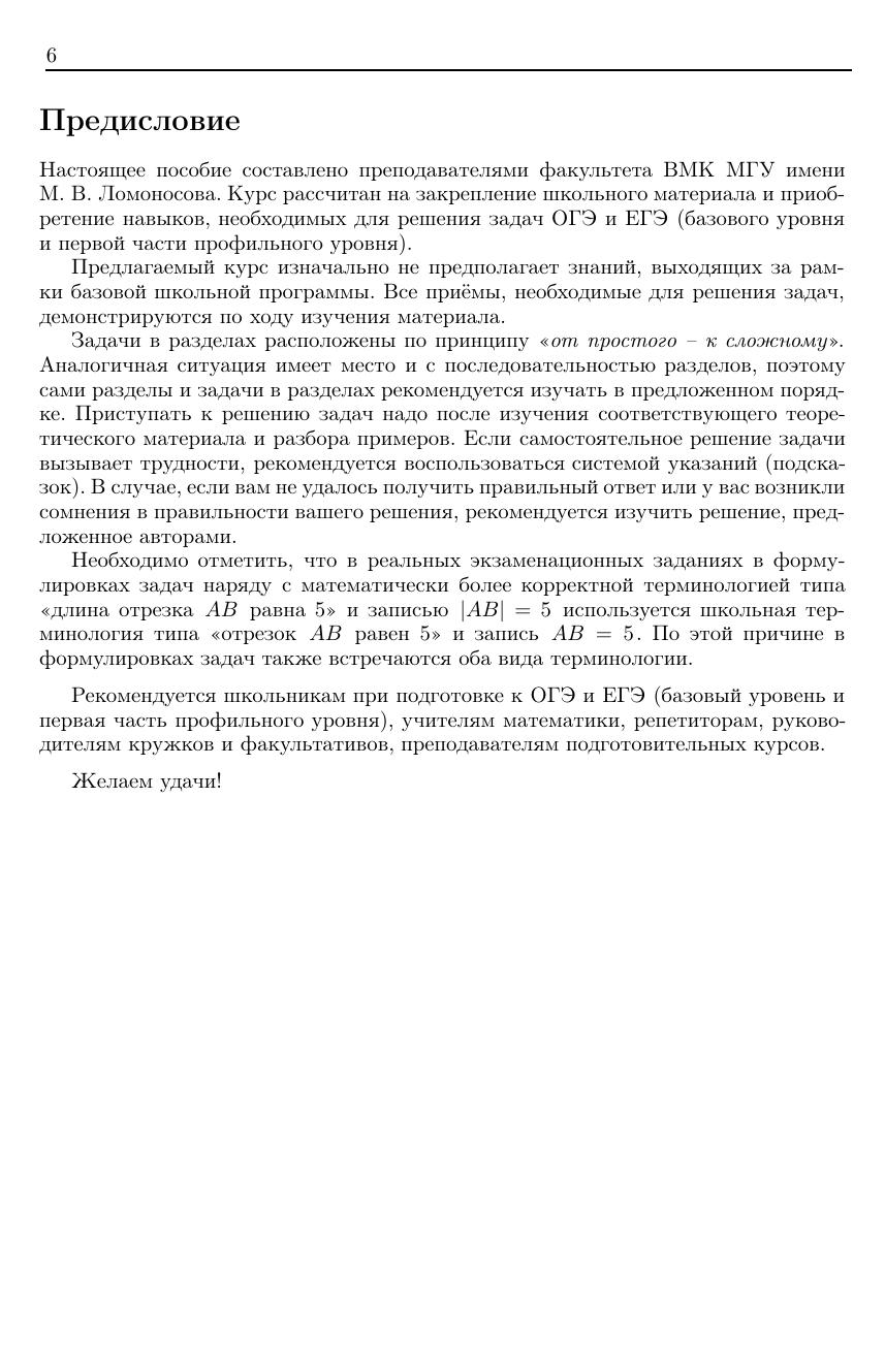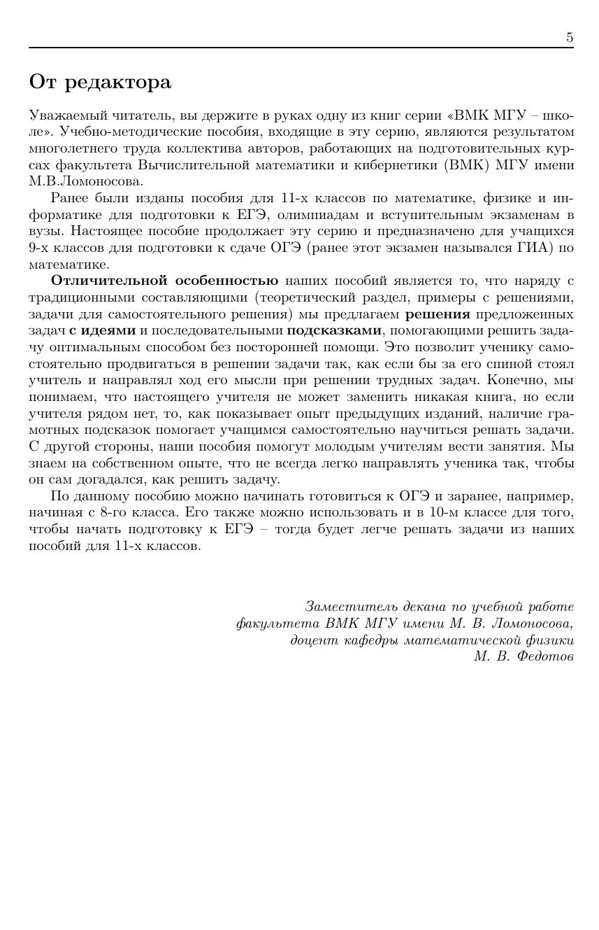 Настоящее пособие содержит теоретический материал, подборку задач, а также идеи, указания (подсказки) и решения задач. Пособие составлено преподавателями факультета ВМК МГУ имени М. В. Ломоносова. Рекомендуется школьникам при подготовке к ОГЭ и ЕГЭ (базовый уровень и первая часть профильного уровня), учителям математики, репетиторам, руководителям кружков и факультативов, преподавателям подготовительных курсов.