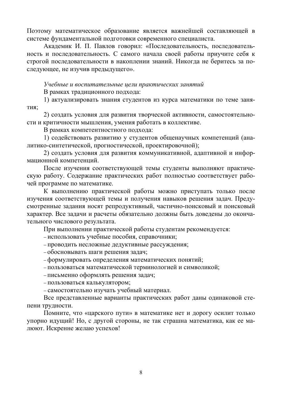 Практикум составлен в соответствии с действующими федеральными государственными образовательными стандартами среднего профессионального образования по техническим направлениям подготовки. В данном пособии рассматриваются элементы математики, относящиеся к периоду математики переменных величин и современному периоду, имеющие большое значение в современной фундаментальной и прикладной математике. Изложен теоретический и справочный материал, приведены примеры решения задач, задания для самостоятельных занятий, подготовки к контрольным работам, зачету, экзамену. Работая над каждой темой, лучше всего сначала изучить теоретический материал, повторить ранее изученные формулы, теоремы, разобраться в приведенных примерах. Если все понятно, то можно переходить к выполнению практических заданий. Практикум окажет помощь в систематизации и обобщении знаний по математике. Соответствует современным требованиям Федерального государственного образовательного стандарта среднего профессионального образования и профессиональным квалификационным требованиям. Данный практикум предназначен для использования в средних профессиональных учебных заведениях, в учебных планах которых предусмотрена дисциплина «Математика», соответствующая действующим программам. Представленные в пособии основные математические структуры имеют настолько большую общеобразовательную и математическую значимость, что являются обязательными для рассмотрения студентами всех специальностей.