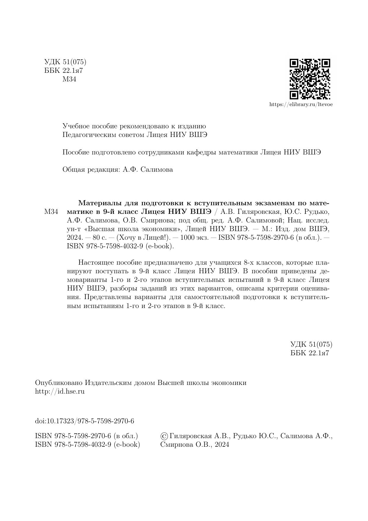 Настоящее пособие предназначено для учащихся 8-х классов, которые планируют поступать в 9-й класс Лицея НИУ ВШЭ. В пособии приведены демоварианты 1-го и 2-го этапов вступительных испытаний в 9-й класс Лицея НИУ ВШЭ, разборы заданий из этих вариантов, описаны критерии оценивания. Представлены варианты для самостоятельной подготовки к вступительным испытаниям 1-го и 2-го этапов в 9-й класс.