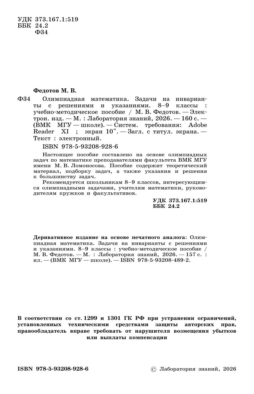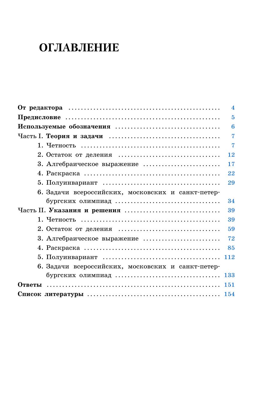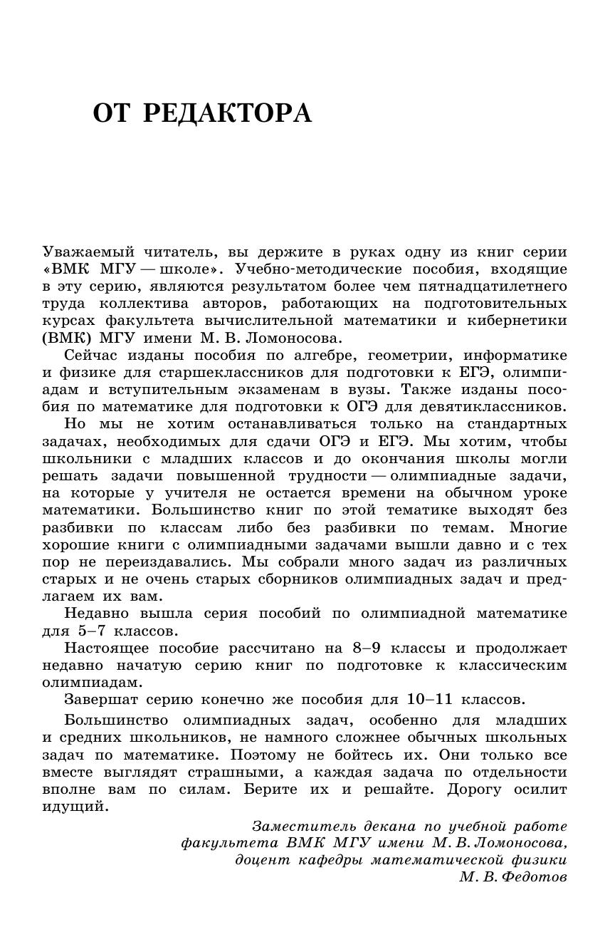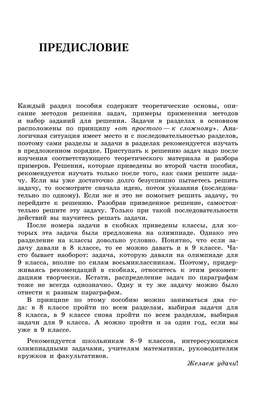 Настоящее пособие составлено на основе олимпиадных задач по математике преподавателями факультета ВМК МГУ имени М. В. Ломоносова. Пособие содержит: теоретический материал, описание методов решения задач, примеры применения методов, набор заданий для решения. Задачи в разделах и сама последовательность разделов выстроены по принципу «от простого к сложному». По данному пособию можно заниматься два года: в 8 классе пройти по всем разделам, выбирая задачи для 8 класса, в 9 классе снова пройти по всем разделам, выбирая задачи для 9 класса. А можно пройти и за 1 год, если вы уже в 9 классе. Рекомендуется школьникам 8–9 классов, интересующимся олимпиадными задачами, учителям математики, руководителям кружков и факультативов.